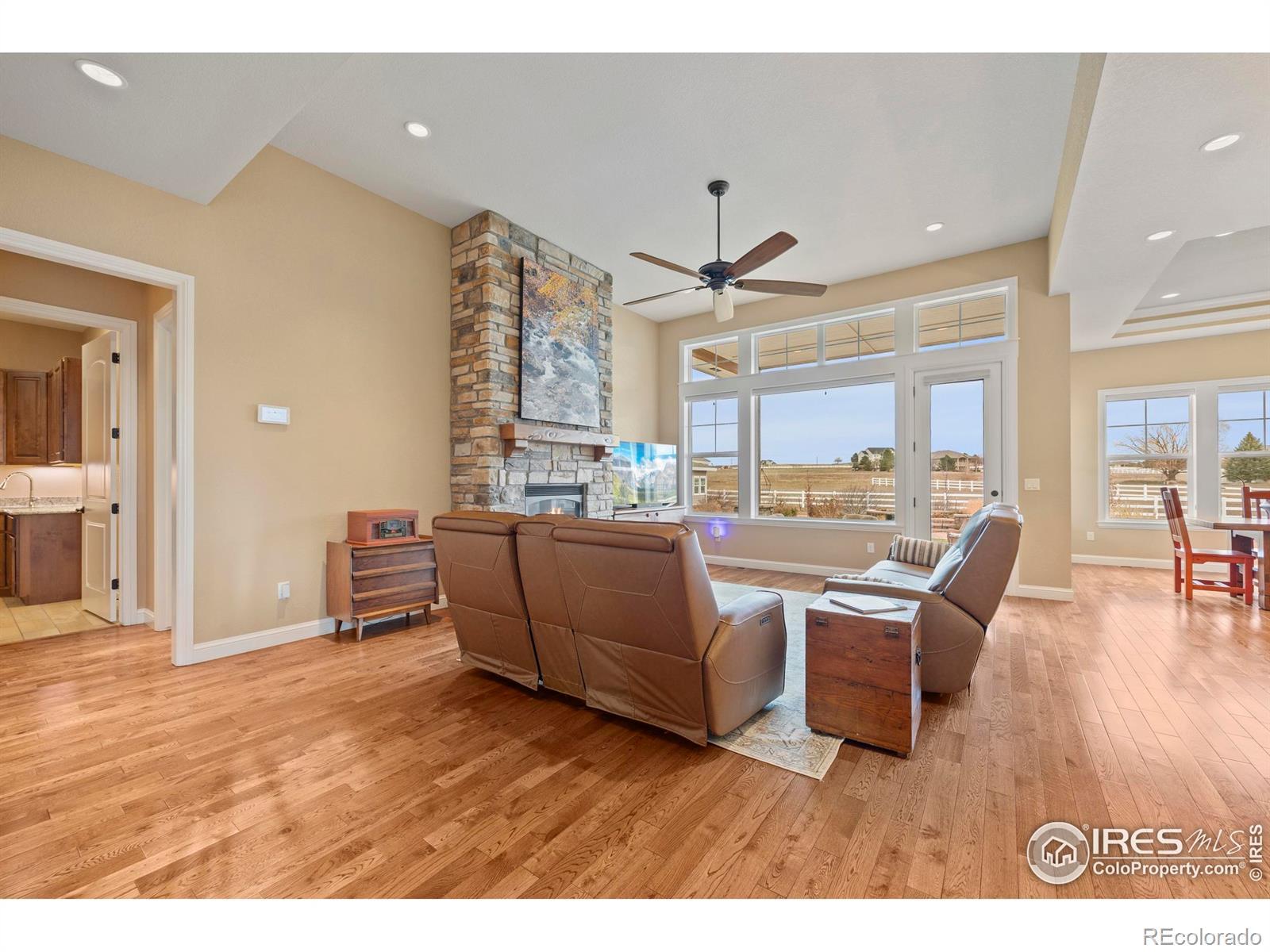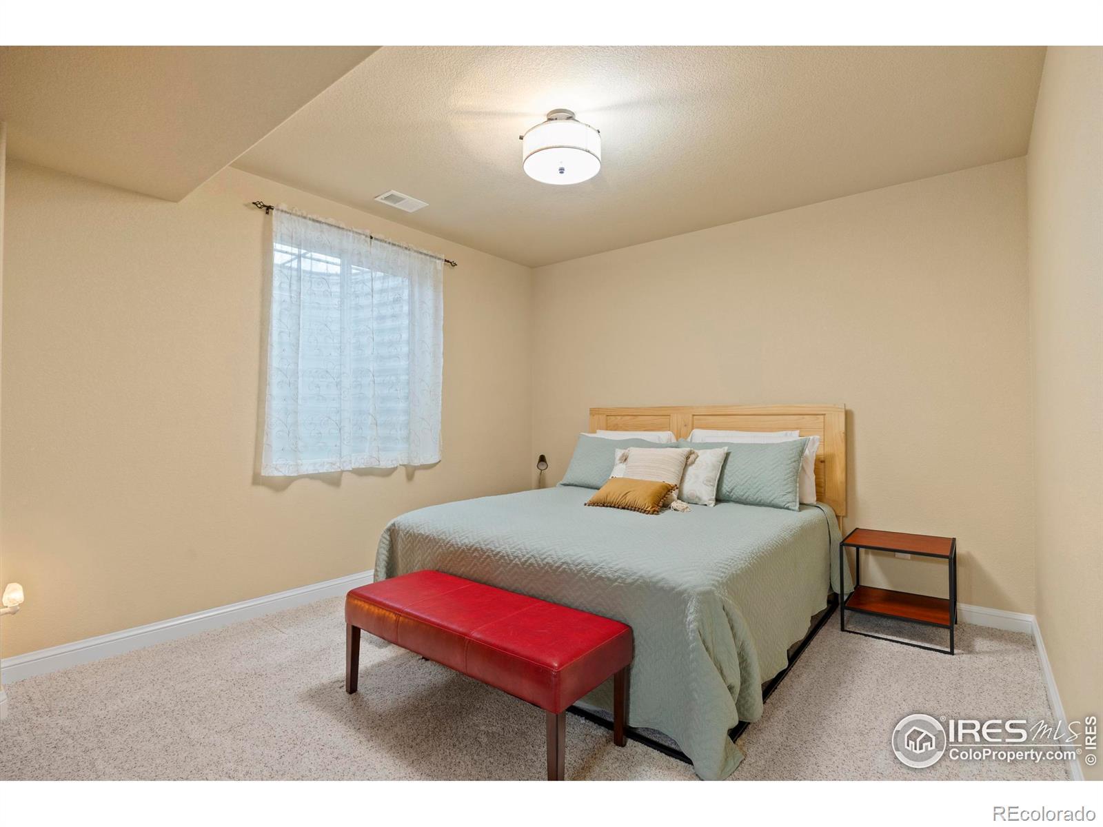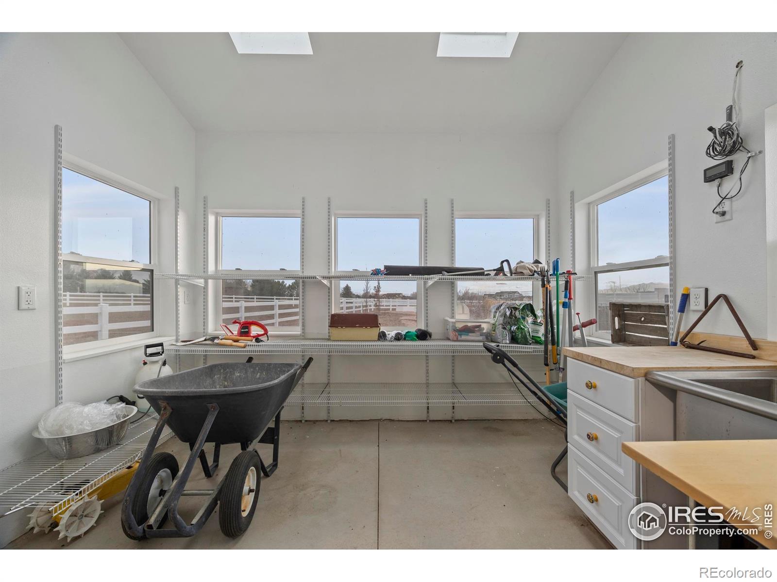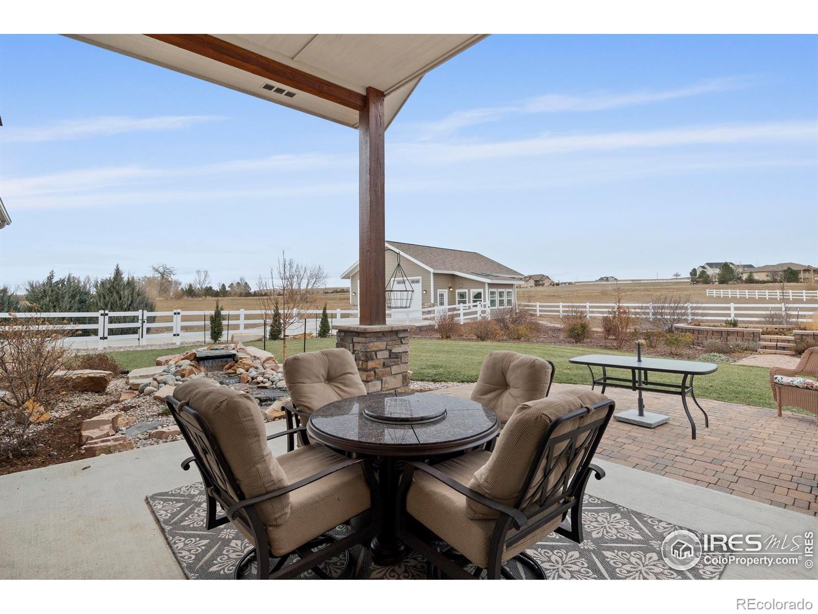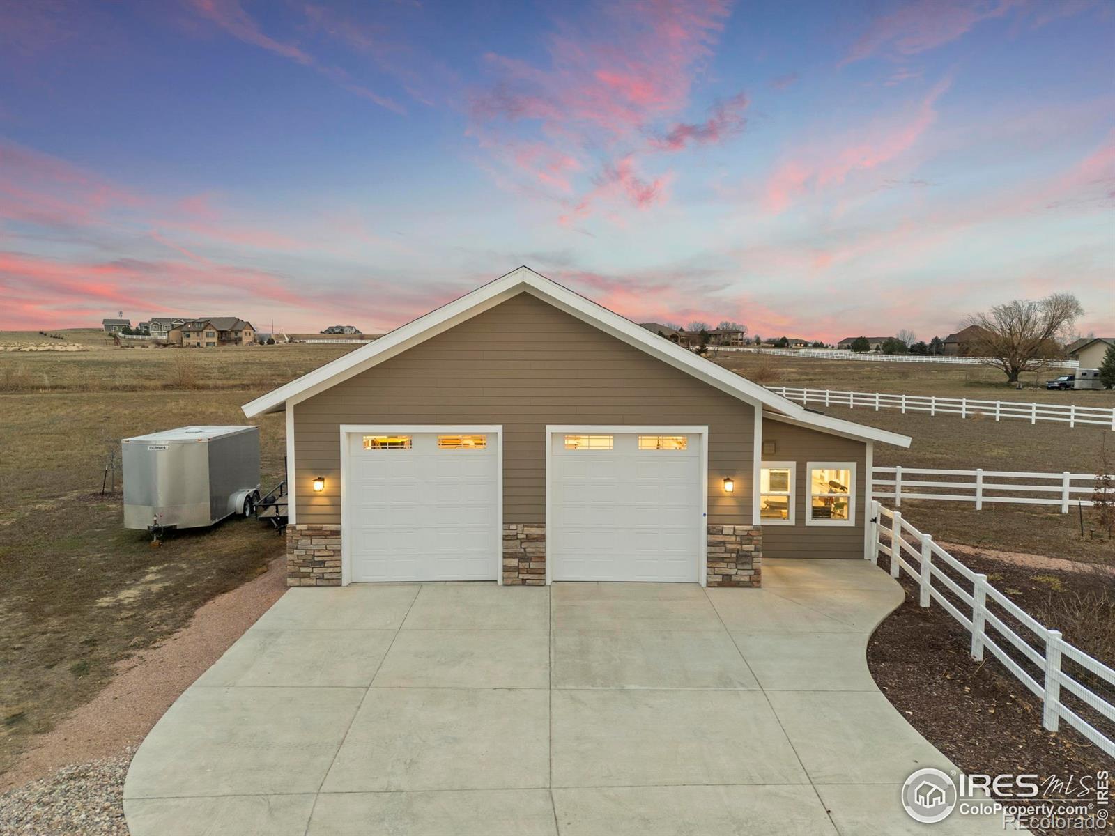 Welcome to this custom ranch home on 3.7 acres, ideally located just minutes from downtown Fort Collins. This property is a dream for gardeners, featuring multiple well-designed garden spaces, irrigated raised beds, and a gated botanical area that could also serve as a future dog run. The landscape includes a variety of fruit trees, thoughtfully cultivated planting areas, and a newly installed, multi-tier natural stone water feature. Set at the end of a peaceful cul-de-sac in the desirable Belmont Farms subdivision, the home offers mountain views, spacious surroundings, and neighborhood walking paths, all within 20 minutes of downtown Fort Collins. A key highlight is the nearly 1,400 sq ft detached shop, complete with heat, two 12-ft bay doors with side-mounted openers ,several 220V outlets for tools or equipment, and plenty of exterior parking. The attached greenhouse includes automatic venting and a dedicated sink for early-season garden prep. The heated, attached 3-car garage provides almost 1,300 sq ft of additional workspace and storage and houses a whole-home Generac generator for added security. Inside, the floor plan is functional and inviting, featuring an open-concept great room with fireplace, dining area, and a well-equipped kitchen with a large island and prep sink, walk-in pantry, built-in appliances, and a gas range with hood. The main level includes two bedroom suites plus an office that could serve as a fourth bedroom. The primary suite offers a spa-inspired bathroom and a spacious walk-in closet with custom organization. The finished basement expands the living space with a large recreation room, complete bar area, media and library space, and a private guest ensuite. This well-maintained property offers a rare combination of acreage, convenience, and versatility.
