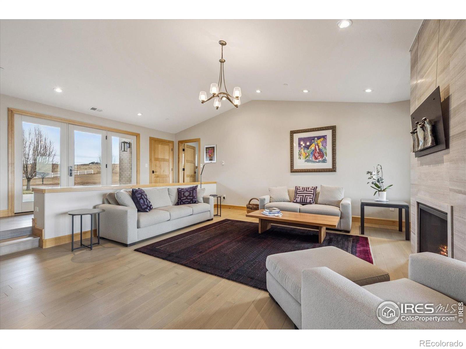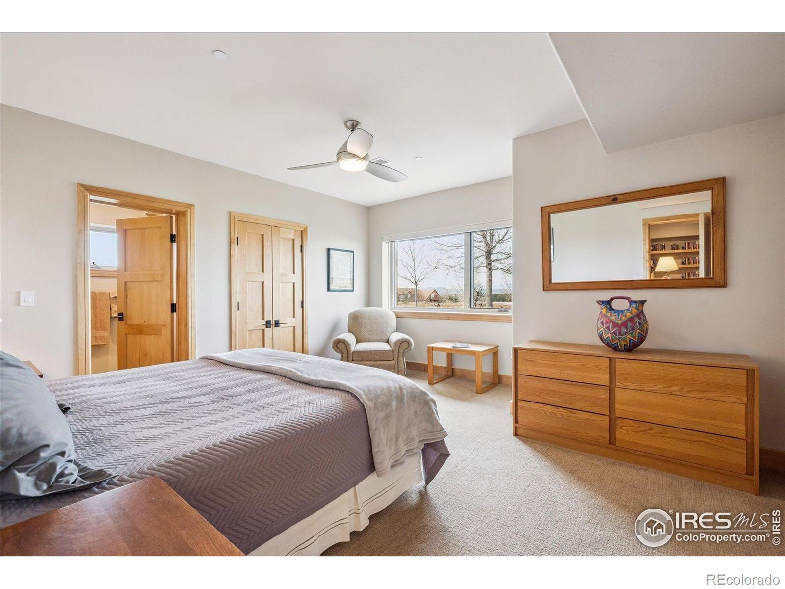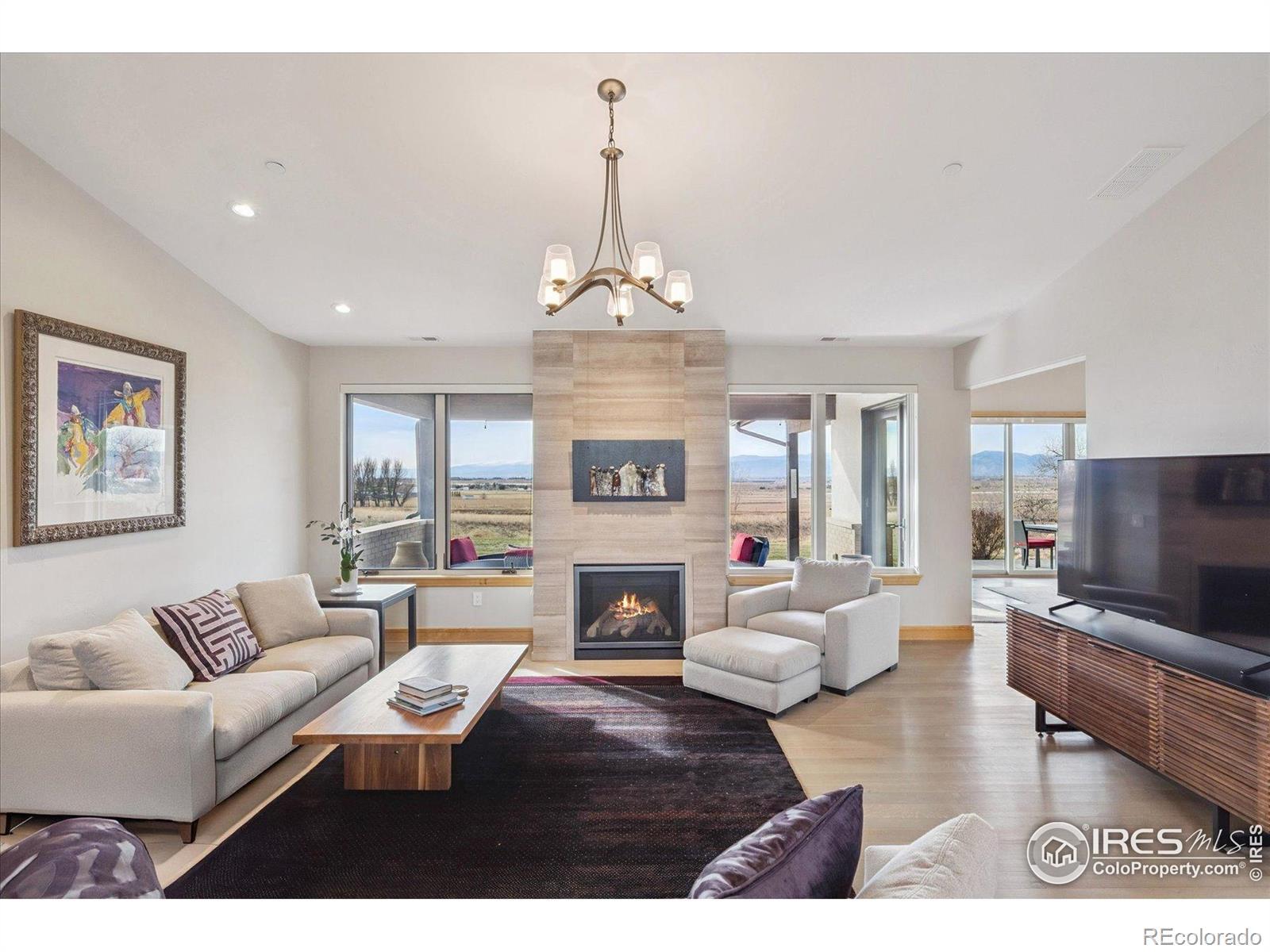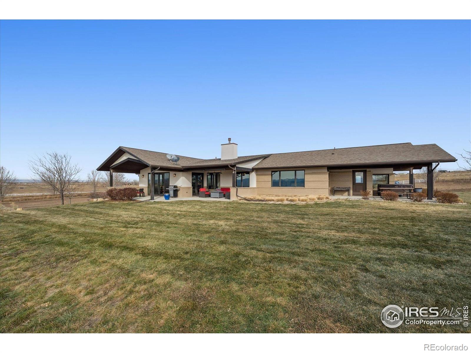 Experience exceptional Colorado living in this stunning custom ranch home set on 5 private acres with endless Front Range views. This 4-bedroom, 4-bath home offers 3,817 finished square feet and an open, contemporary layout designed for comfort and connection.The brick and stucco exterior hints at the quality inside. An inviting great room with gas fireplace flows easily to the dining room and gourmet kitchen. Natural white oak hardwood flooring spans the main level. The kitchen features a large island with seating, crushed-quartz countertops with space for a coffee bar, a Jenn-Air commercial-grade 6-burner gas range with stainless hood, Jenn-Air double ovens, Sharp drawer microwave, French door refrigerator, built-in beverage fridge, and a composition farm sink. A spacious walk-in pantry with functional shelving and baskets adds convenience. The main-floor laundry offers generous cabinetry and direct garage access.The primary ensuite showcases beautiful mountain views through perfectly placed windows. The 5-piece bath includes double quartz vanities, a soaking tub, and a large walk-in shower. Step directly from the suite to the private hot tub. A large walk-in closet connects seamlessly to both bedroom and bath. A secondary main-level ensuite bedroom sits on the opposite side of the home for added privacy.The daylight basement extends the living space with a large family room with gas fireplace, an additional ensuite guest bedroom, and a fourth bedroom with double walk-in closets. The oversized 1,172-sq-ft three-car garage provides ample room for vehicles, tools, and recreation gear.Outdoor living shines on the covered patio off the dining room, where you can enjoy dining, relaxation, and wide-open views. With 5 acres offering space and serenity just minutes from Fort Collins, this exceptional custom ranch home delivers luxury, privacy, and the true Colorado lifestyle.