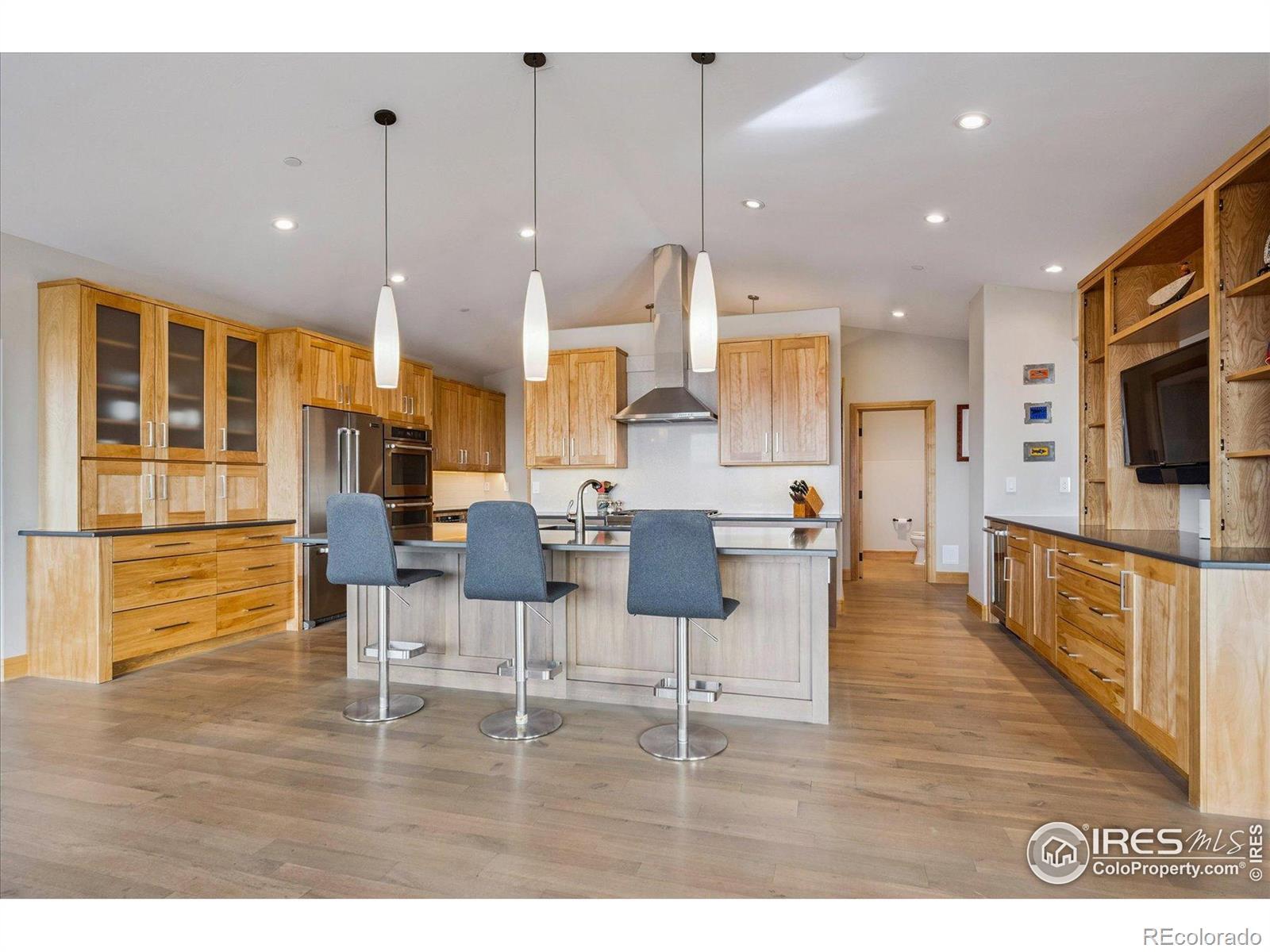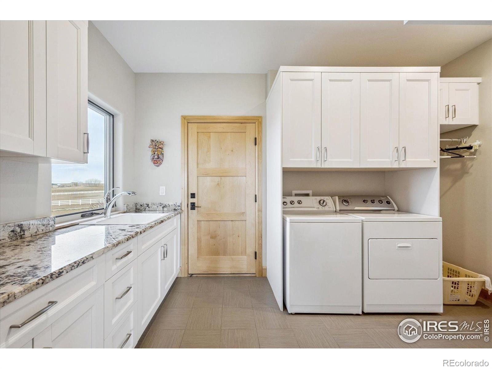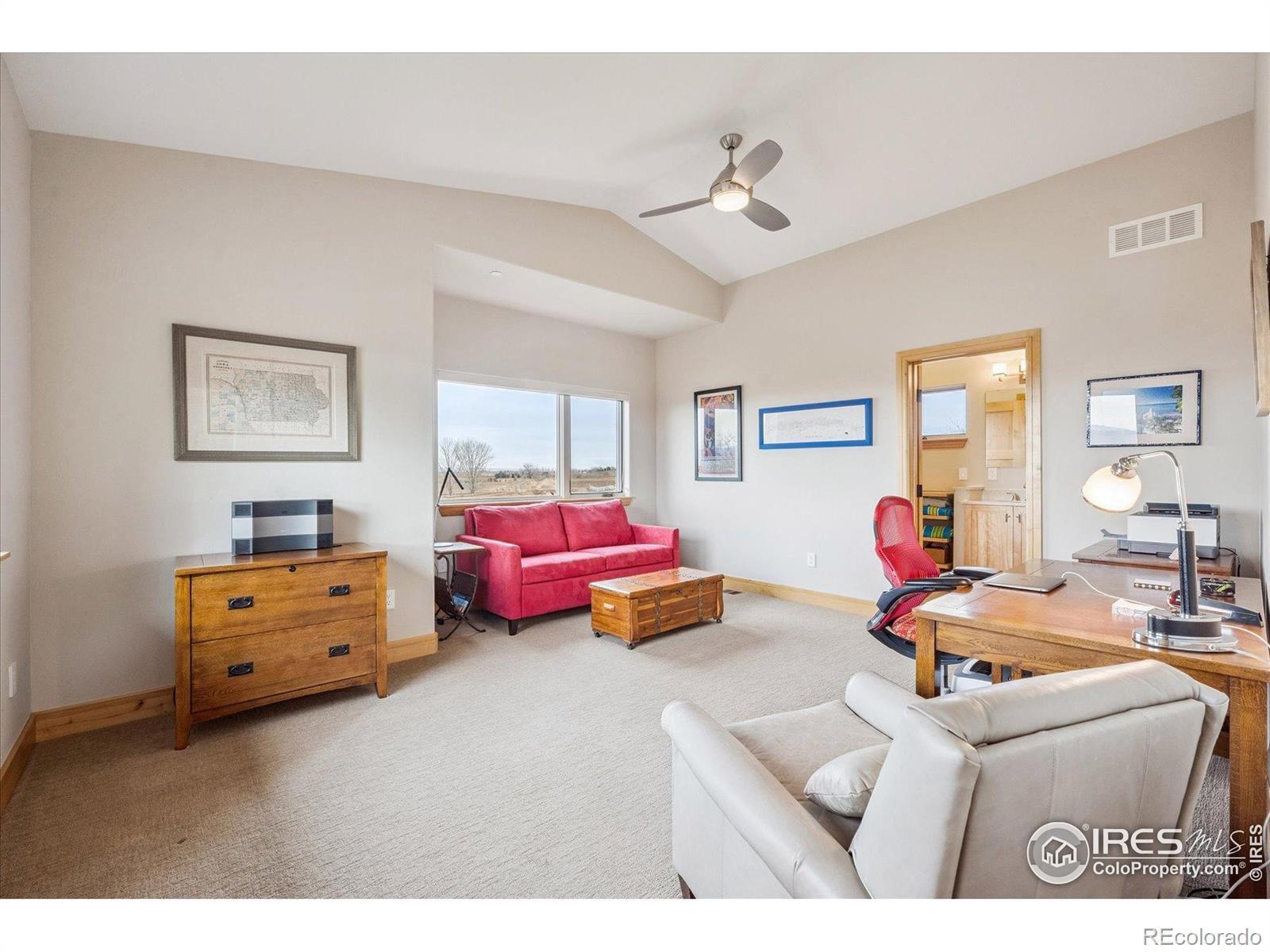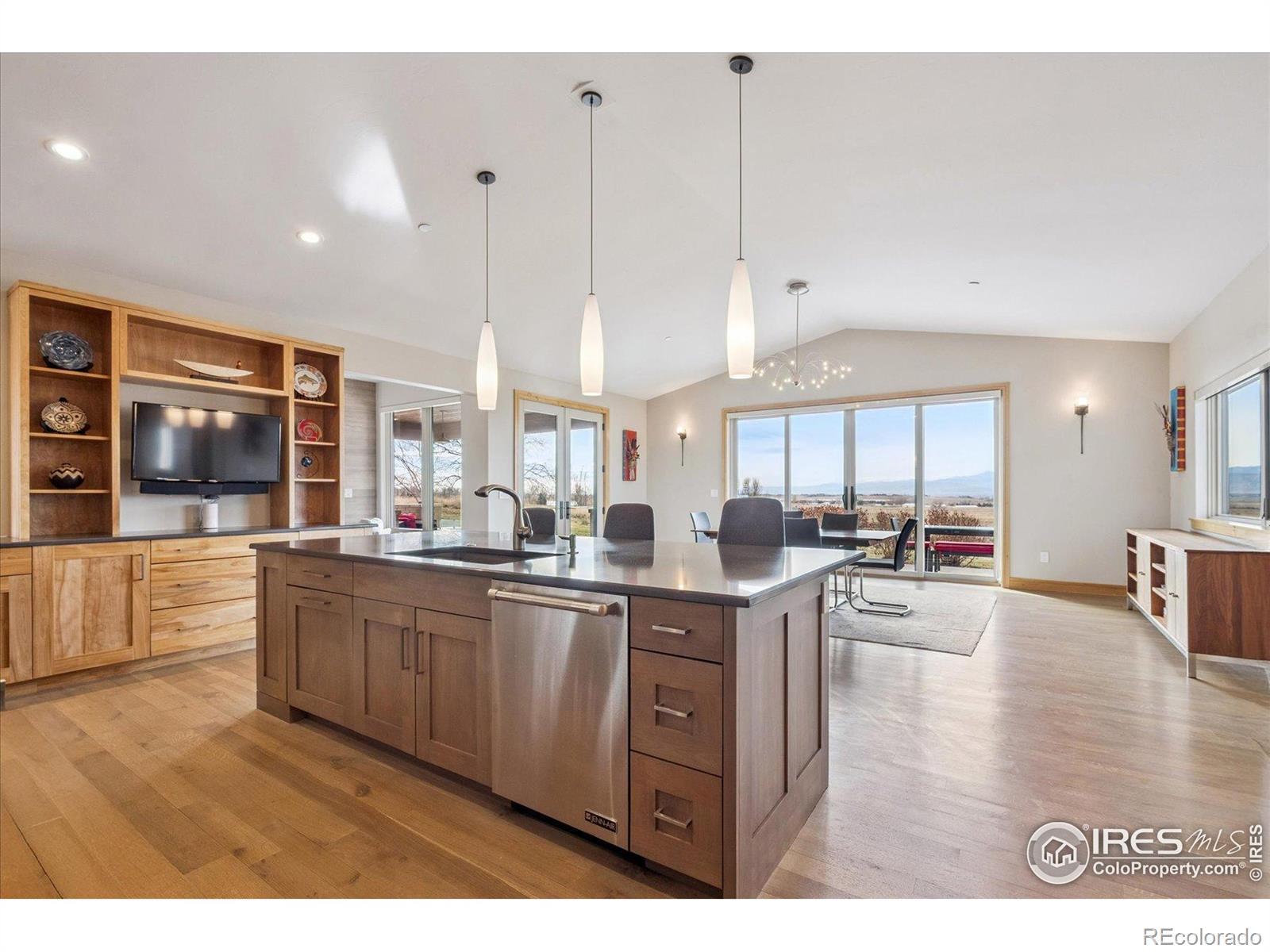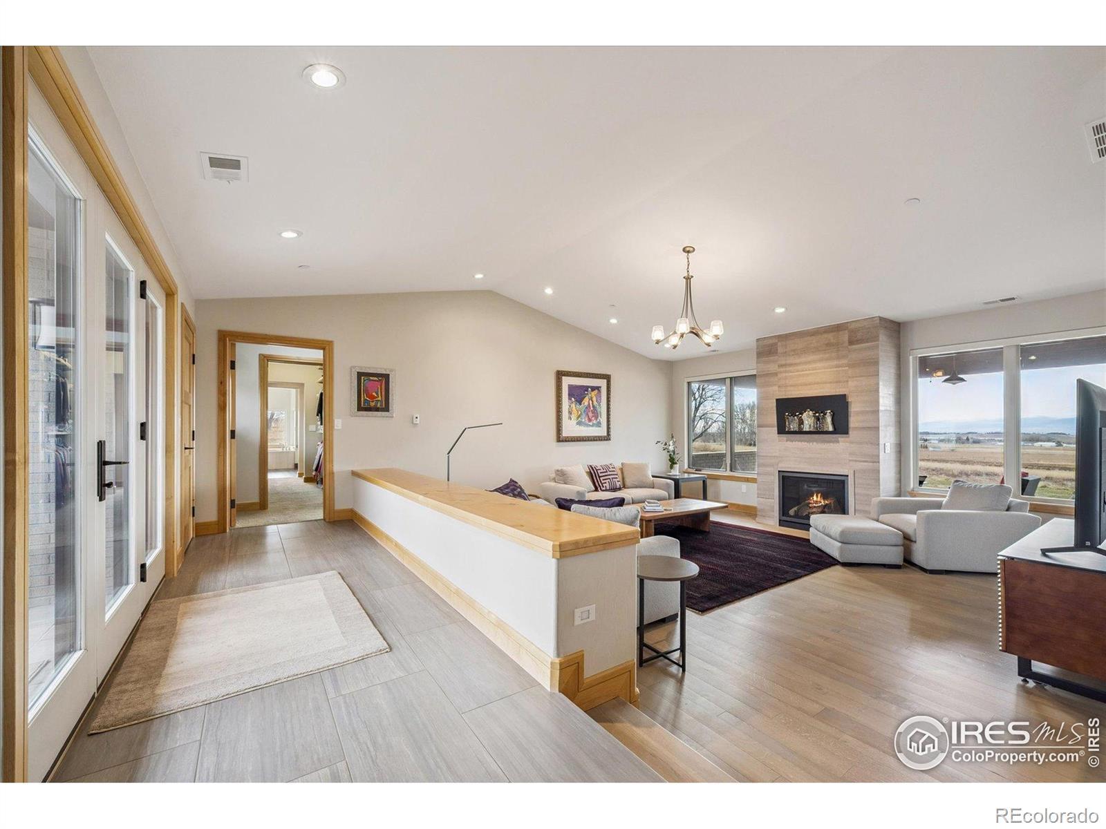 Experience exceptional Colorado living in this stunning custom ranch home set on 5 private acres with endless Front Range views. This 4-bedroom, 4-bath home offers 3,817 finished square feet and an open, contemporary layout designed for comfort and connection.The brick and stucco exterior hints at the quality inside. An inviting great room with gas fireplace flows easily to the dining room and gourmet kitchen. Natural white oak hardwood flooring spans the main level. The kitchen features a large island with seating, crushed-quartz countertops with space for a coffee bar, a Jenn-Air commercial-grade 6-burner gas range with stainless hood, Jenn-Air double ovens, Sharp drawer microwave, French door refrigerator, built-in beverage fridge, and a composition farm sink. A spacious walk-in pantry with functional shelving and baskets adds convenience. The main-floor laundry offers generous cabinetry and direct garage access.The primary ensuite showcases beautiful mountain views through perfectly placed windows. The 5-piece bath includes double quartz vanities, a soaking tub, and a large walk-in shower. Step directly from the suite to the private hot tub. A large walk-in closet connects seamlessly to both bedroom and bath. A secondary main-level ensuite bedroom sits on the opposite side of the home for added privacy.The daylight basement extends the living space with a large family room with gas fireplace, an additional ensuite guest bedroom, and a fourth bedroom with double walk-in closets. The oversized 1,172-sq-ft three-car garage provides ample room for vehicles, tools, and recreation gear.Outdoor living shines on the covered patio off the dining room, where you can enjoy dining, relaxation, and wide-open views. With 5 acres offering space and serenity just minutes from Fort Collins, this exceptional custom ranch home delivers luxury, privacy, and the true Colorado lifestyle.