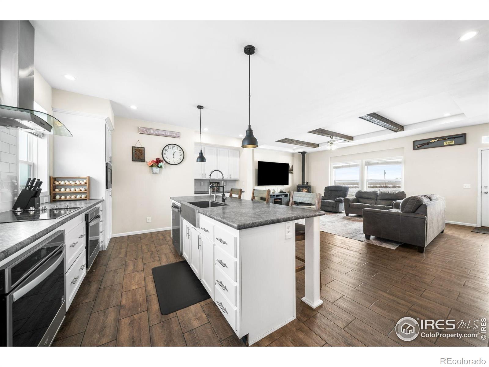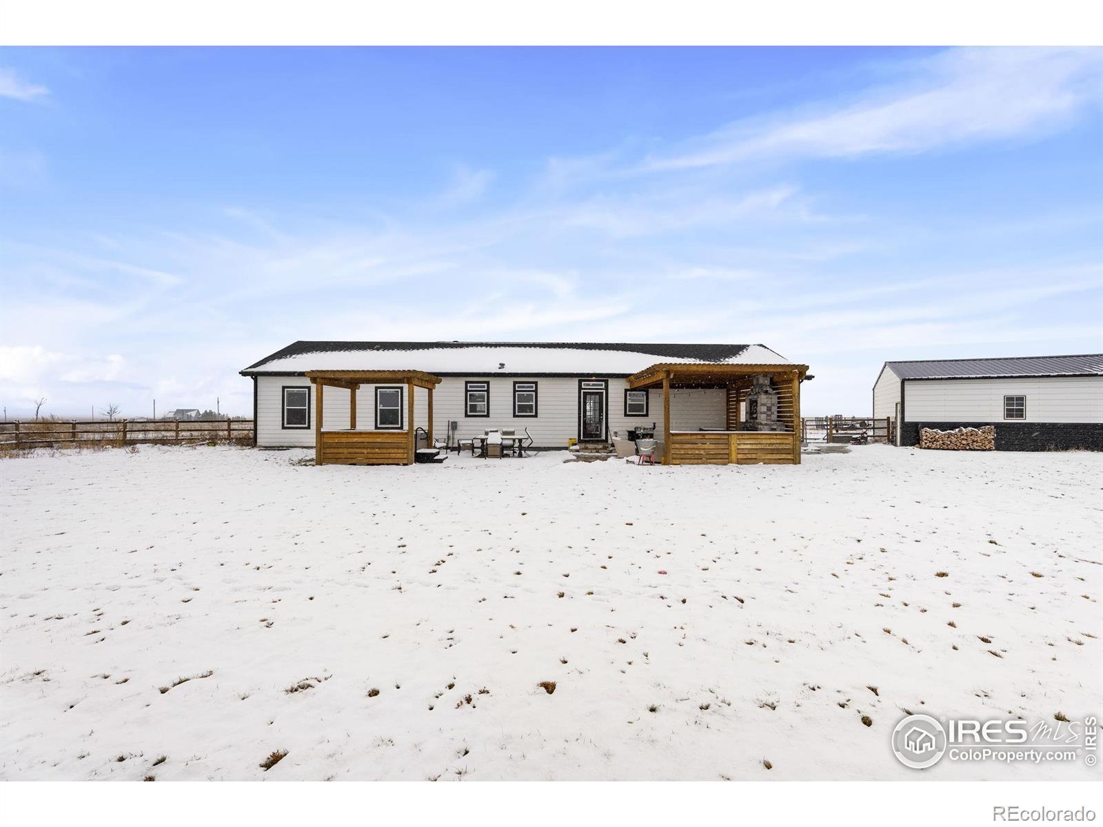 Beams Ranch offers the ideal balance between wide-open rural living and convenient access to Northern Colorado communities. Set on more than 45 fully fenced acres, this property is designed for those seeking freedom, functionality, and a true agricultural lifestyle. A welcoming circle drive sets the tone as you arrive to a residence offering over 4,500 finished square feet, including a fully finished basement, 5 bedrooms, and the option for a 6th bedroom or private office behind French doors. Wood-beam accents and a wood-burning fireplace create a warm, rustic atmosphere, while durable LVP flooring and a spacious mud room with its own entrance make daily farm chores easy to manage. The open kitchen features double ovens, stainless appliances, extensive prep space, and a modern subway-tile backsplash, making it ideal for large meals or simple mornings at home. Beams Ranch is fully equipped for hobby farming or expanded agricultural use, featuring fenced pastures w/electric fence, 3 automatic waterers for livestock, and a 3-stall barn with exterior runs, power, and water. Additional improvements include a working silo, two auxiliary silos, a 40x30 barn with oversized doors, a 60x40 heated quonset hut with a loading area, and a 220x110 riding arena. RV parking and hookups add convenience, while a filtered well, septic system, and more than $60,000 in solar panels offer the option of true off-grid living. The finished basement provides an exceptional entertainment area complete with a projection system and screen, and outdoor living spaces include a private covered patio with a wood-burning chimenea, an east-facing rear patio, and a manicured fenced backyard with a salt water hot tub that conveys with the sale. Combining comfort, functionality, and sweeping rural beauty, Beams Ranch is a rare opportunity to embrace the Front Range lifestyle with room to live, grow, and breathe.