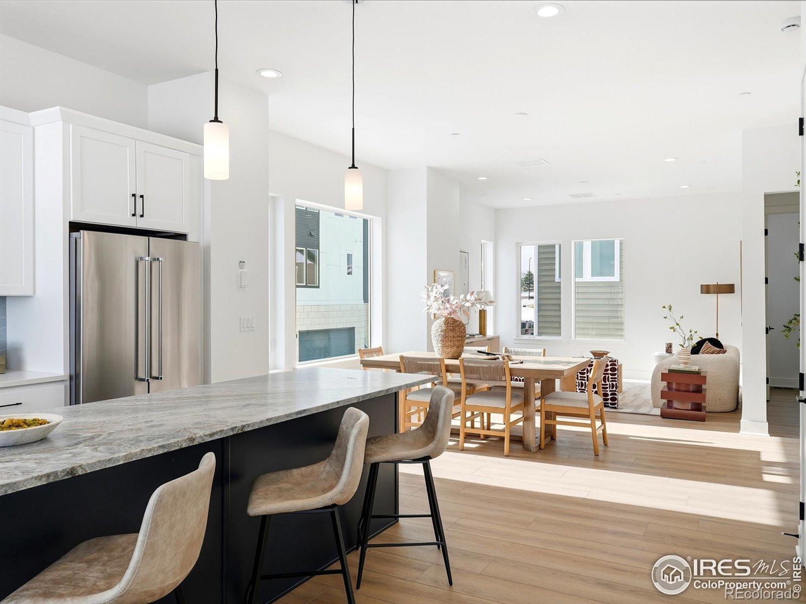 This stunning end-unit townhome blends modern beauty with thoughtful design across three spacious levels. From the moment you arrive, this newly built home impresses with its bright, open layout and stylish finishes throughout. The entry level welcomes you with a roomy two-car garage and a versatile flex space, perfect for a home office, gym, or creative studio. On the main level, the showstopping kitchen takes center stage. Sleek cabinetry, designer hardware, and gorgeous quartz countertops create a polished, contemporary look. A large center island with breakfast bar seating, generous prep space, and a walk-in pantry make this kitchen both functional and visually striking. It opens seamlessly to the sunlit dining area and expansive great room, ideal for entertaining or everyday living. Upstairs, the luxurious primary suite offers a serene retreat with a dual-sink vanity, private water closet and an oversized walk-in closet. This level also features two additional guest bedrooms and a full guest bathroom, providing plenty of comfort and flexibility for family or visitors. Enjoy access to top-tier Erie amenities, including a 63,000-square-foot community center, a 20,000-square-foot library, scenic trails, parks, and a vibrant mix of shops and restaurants. **Ask about lender incentives that include a 3/21/1 buydown @ 2.99%!!**Terms and conditions apply. Hurry and view today! To be written on builders contract