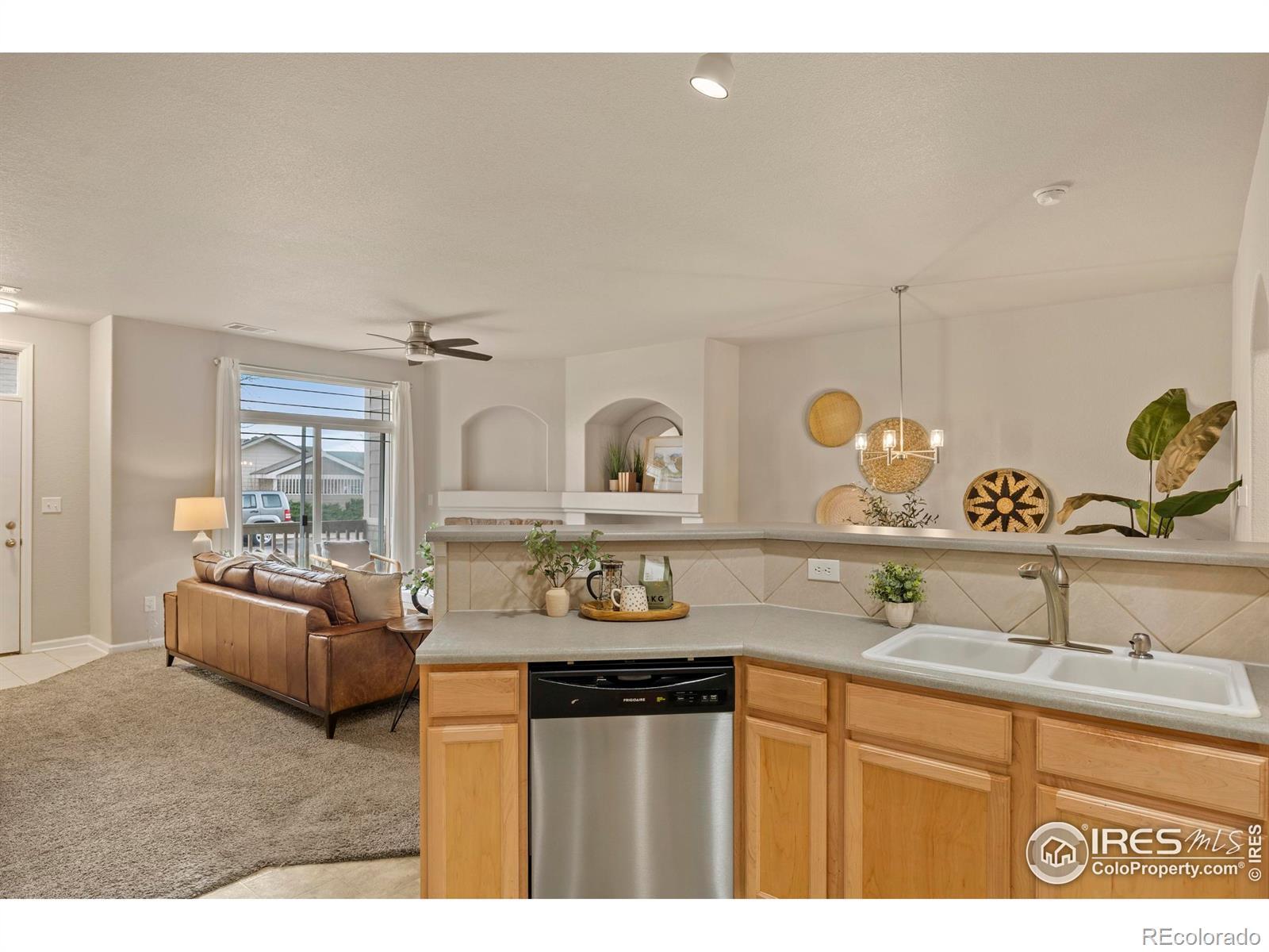 Updated and move-in ready 2-bed, 2-bath main-floor condo with an oversized 1 car garage -ideal as a primary home or investment opportunity! Enjoy newer interior paint and stylish light fixtures throughout, complemented by an open-concept layout. The spacious kitchen boasts new stainless-steel appliances, maple cabinetry, abundant counter space, and a walk-in pantry. The primary bedroom features a private en-suite bathroom, a newer ceiling fan, and a large walk-in closet. The second bedroom also offers a walk-in closet, ensuring plenty of storage space. A dedicated laundry room includes a full-size washer and dryer for added convenience. Step outside to your south-facing, covered patio-a peaceful spot to relax and unwind. An extra storage room off the patio provides additional space for your belongings. The HOA covers water, sewer, trash, lawn care, snow removal, as well as access to the pool, workout room and clubhouse amenities. Located in West Greeley, this condo offers easy access to Hwy 34, UC Health Hospital, shopping, dining, and schools-making it an ideal location for your next home or investment!