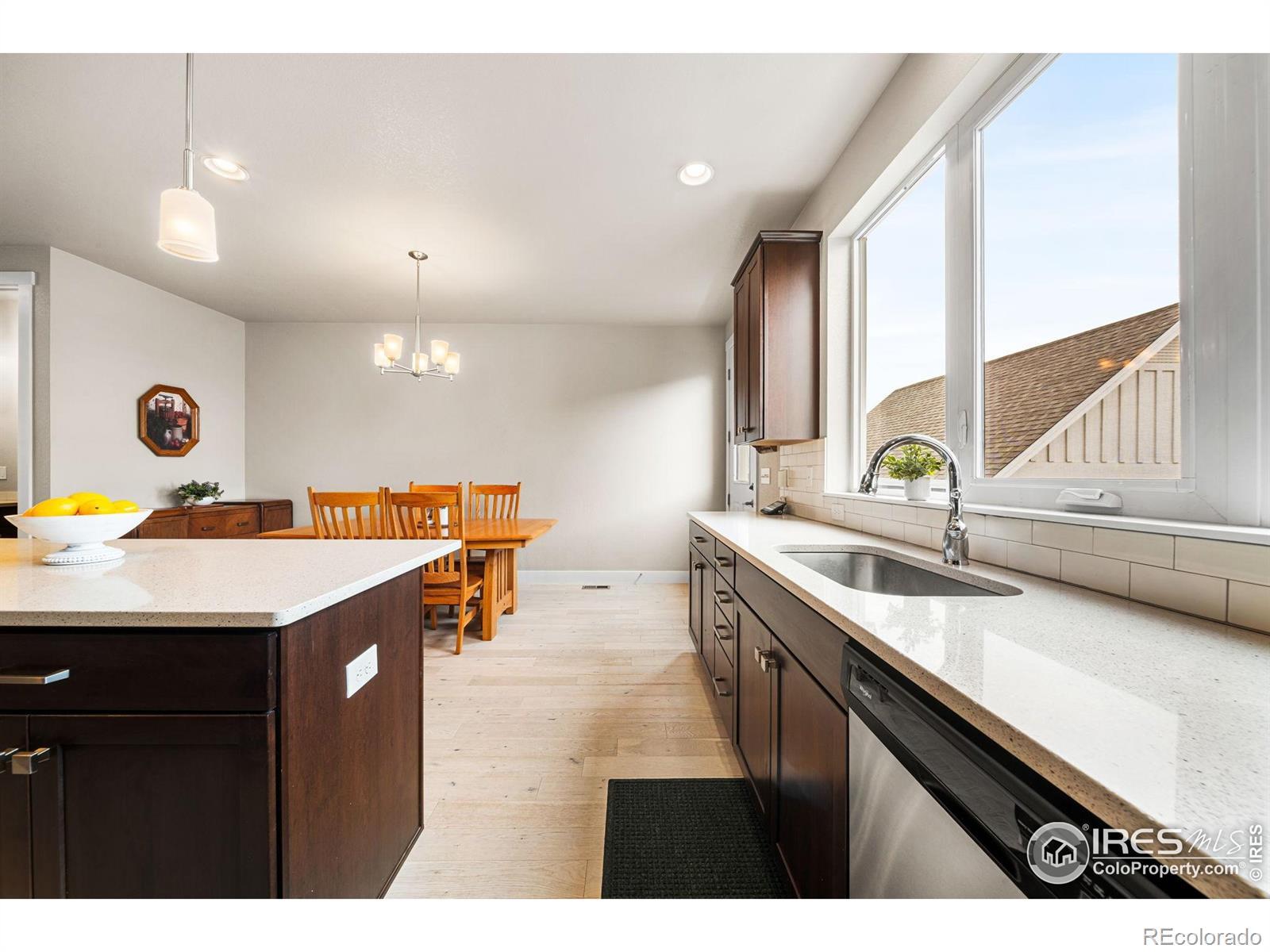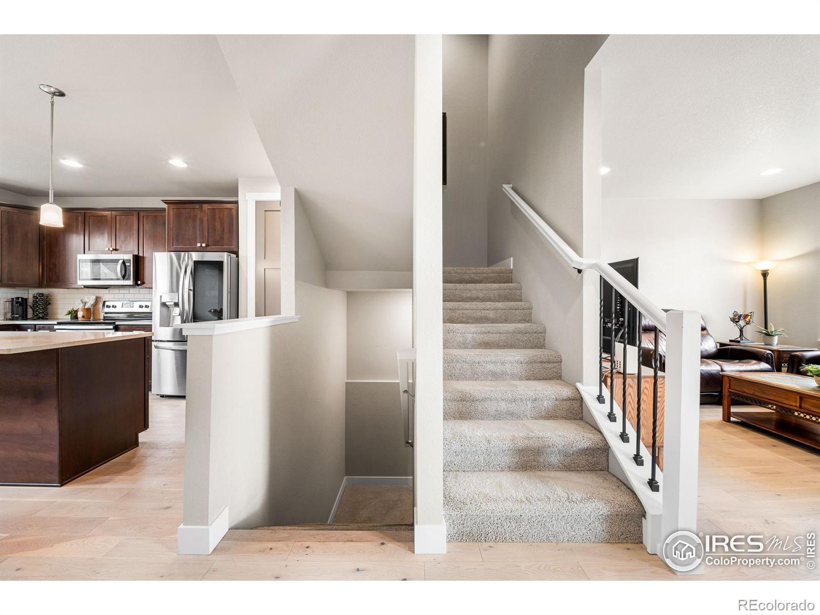 Little Branch Townhomes is an intimate enclave of just 16 thoughtfully designed residences built by respected local semi-custom home builder, Mountain Standard Homes. Framed by remarkable views of Longs Peak and the Rocky Mountains, Little Branch blends small-town warmth with Berthoud's highly regarded schools, and effortless access to outdoor recreation-all while remaining an easy commute to Longmont, Boulder, and Denver International Airport. Loaded with charm, this residence showcases a level of craftsmanship and finish that will rival any other townhome in this price point. Inside, the home is filled with natural light and elevated by wide-plank wood flooring, 9-foot ceilings, oversized windows, 6-inch baseboards, and custom-painted 8 ft paneled doors. An open faux iron staircase railing adds architectural interest, while the finished basement offers a versatile recreation or flex space flooded with natural light from the oversized south facing light well. Designed for both comfort and functionality, the home features three bedrooms plus a recreation/flex space and four bathrooms, including two ensuite bedrooms-ideal for guests, multigenerational living, or work-from-home flexibility. A rare highlight for townhome living, the private attached courtyard invites outdoor enjoyment-perfect for grilling, gardening, or letting pets roam freely. An oversized one-car garage with an 8-foot door provides ample storage. With all appliances included plus the window blinds, this home is move-in ready! All exterior maintenance provided in a low monthly HOA. Access to community pool and trail systems and minutes from Berthoud's recreation center.