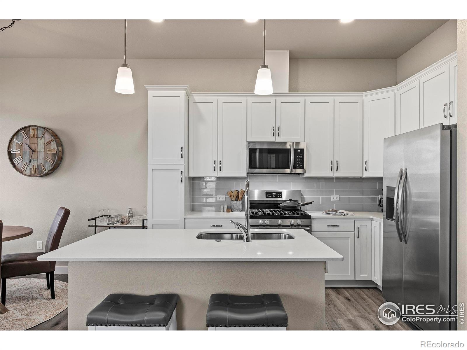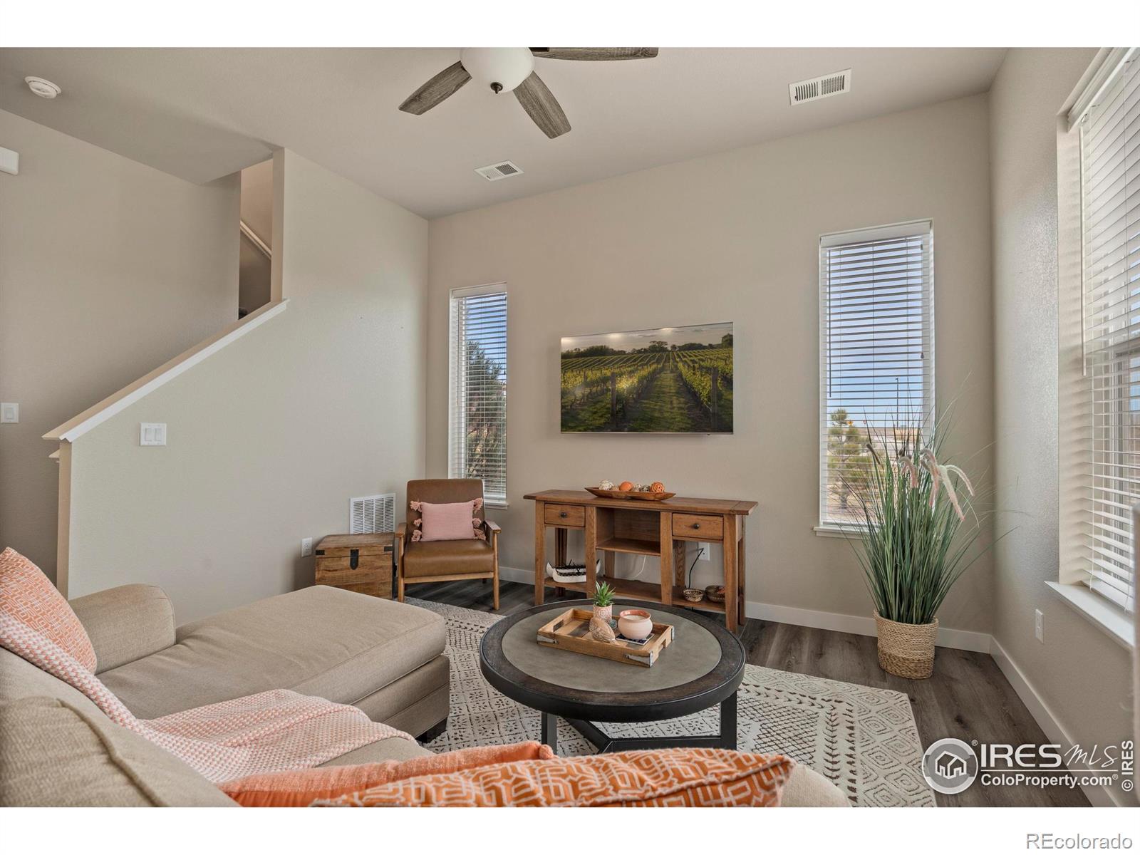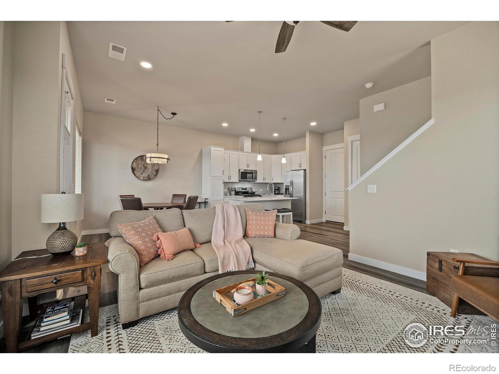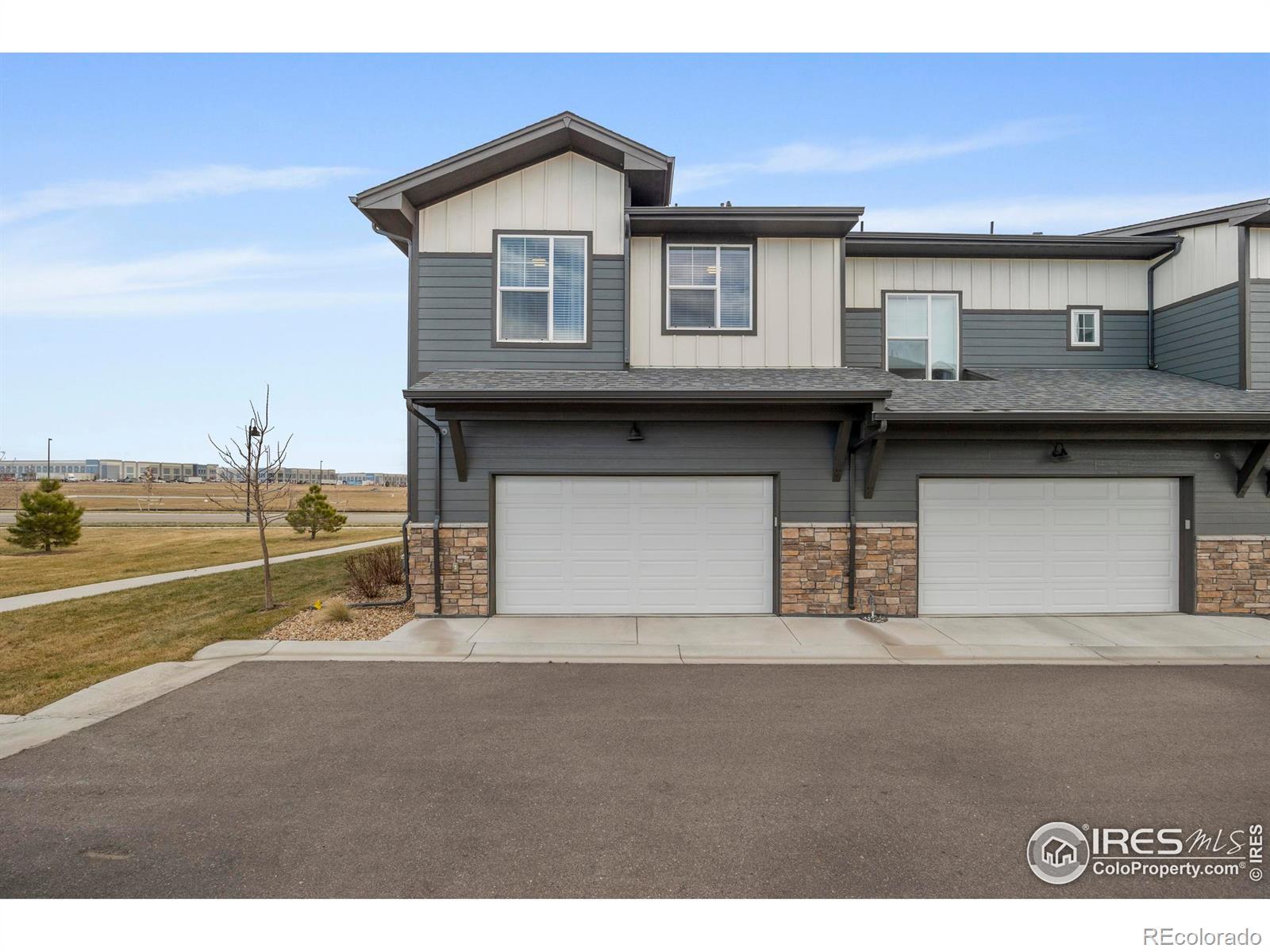 Built by Landmark in 2023, this elegant 3BD, 3BA attached townhome-style condo offers a sophisticated blend of modern finishes, quality construction, thoughtful layout, and timeless appeal.The open-concept main level is beautifully appointed with wide-plank laminate flooring, quartz countertops in the kitchen and baths, and a gas stove. Brushed nickel plumbing fixtures and lighting add a polished touch, while the stainless steel refrigerator anchors the sleek, contemporary kitchen-perfect for both everyday living and elevated entertaining. Past the kitchen is a conveniently-located attached two-car garage, alley-load.The upper level provides a serene retreat with three well-appointed bedrooms, two full baths, a versatile loft ideal for a home office or lounge, and the convenience of second-floor laundry. Window treatments and a tankless hot water heater are among many of the features of this beautiful home. The other major components still have a long life and this home is in pristine condition, having been very lightly lived in by the original owner.Overlooking open space, this end-unit has an exclusive feel, with lots of room to breathe and a fenced front porch! Surrounded by natural open spaces, this home is ideally situated within the coveted Lakes at Centerra community- an award-winning and amenity-rich community features miles of trails, glistening lakes, many different species of wildlife, an excellent neighborhood school, easy access to Centerra's shops, and more. Community pool is also in the works!