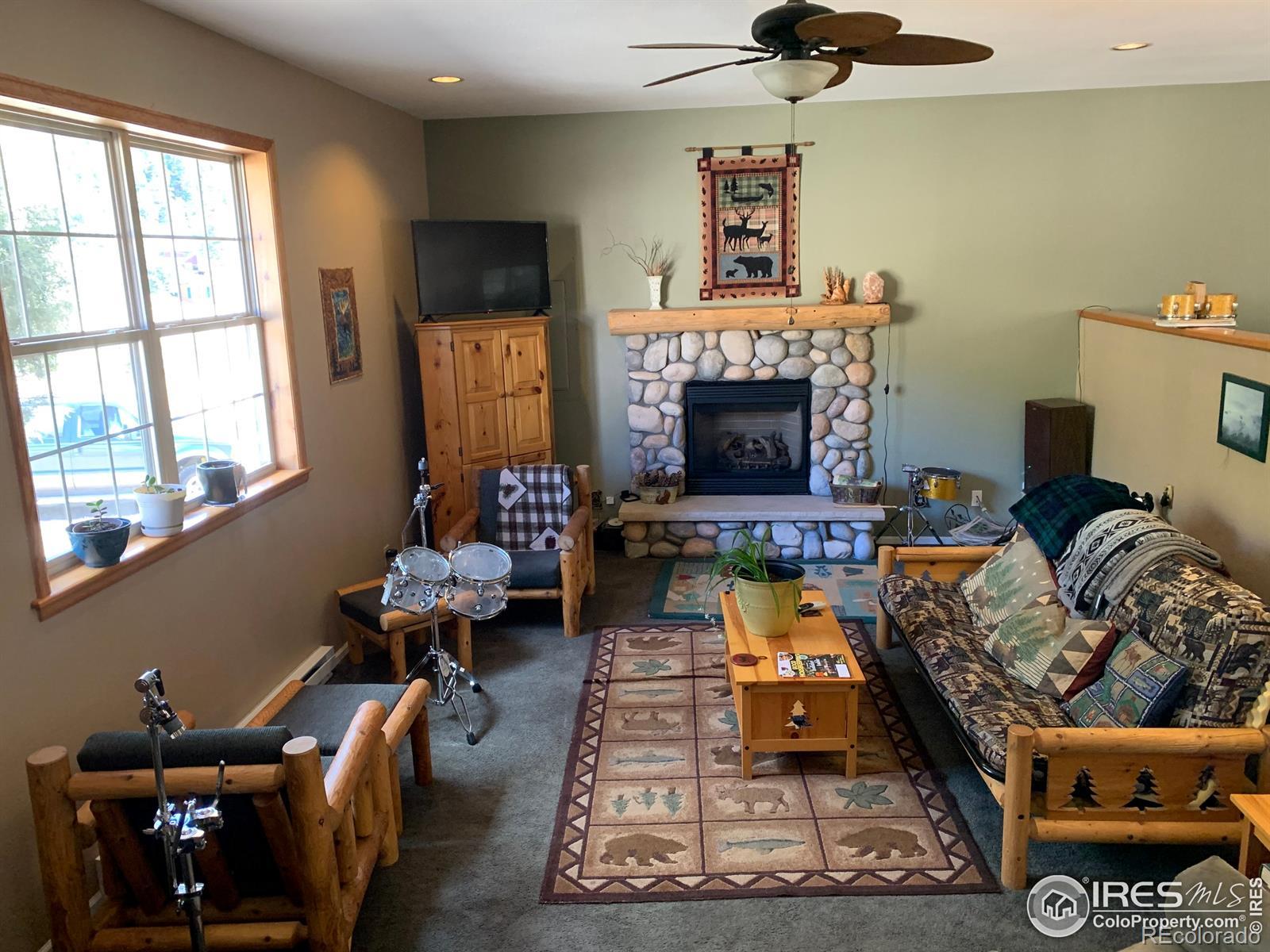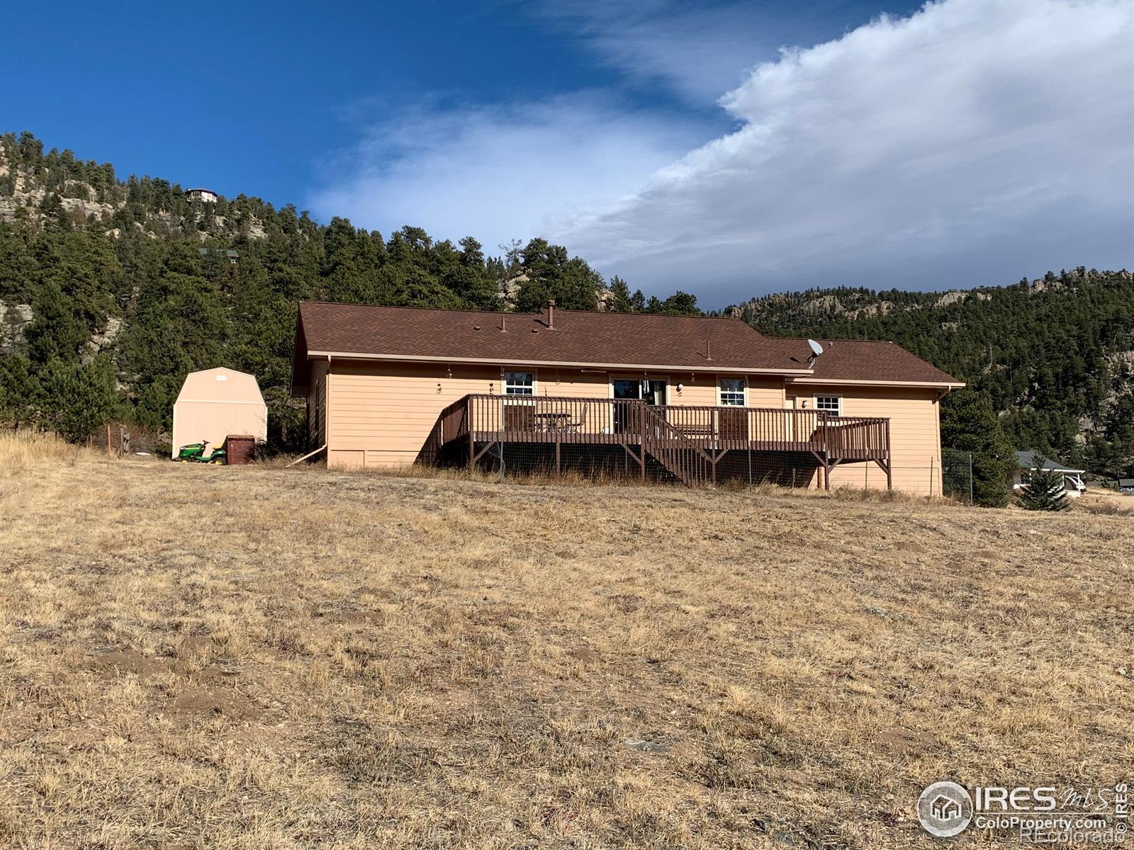 Embrace Colorado mountain living in this spacious ranch-style home on 1 acre just outside Estes Park, where herds of elk and wildlife grace the nearby meadow near Hermit Park. This inviting single-level residence features a generous living room anchored by a stunning river stone gas fireplace with log mantel and hearth, while vaulted ceilings and skylights flood the dining area with natural light. The eat-in kitchen offers both function and charm, and the large primary bedroom provides a private retreat complete with ensuite bath and walk-in closet. Step onto your deck to witness nature's daily show, from grazing elk to breathtaking mountain vistas. An oversized shed provides ample storage for all your outdoor gear and mountain lifestyle needs. This is Colorado living at its finest-where comfort meets wilderness, all within reach of Rocky Mountain National Park.