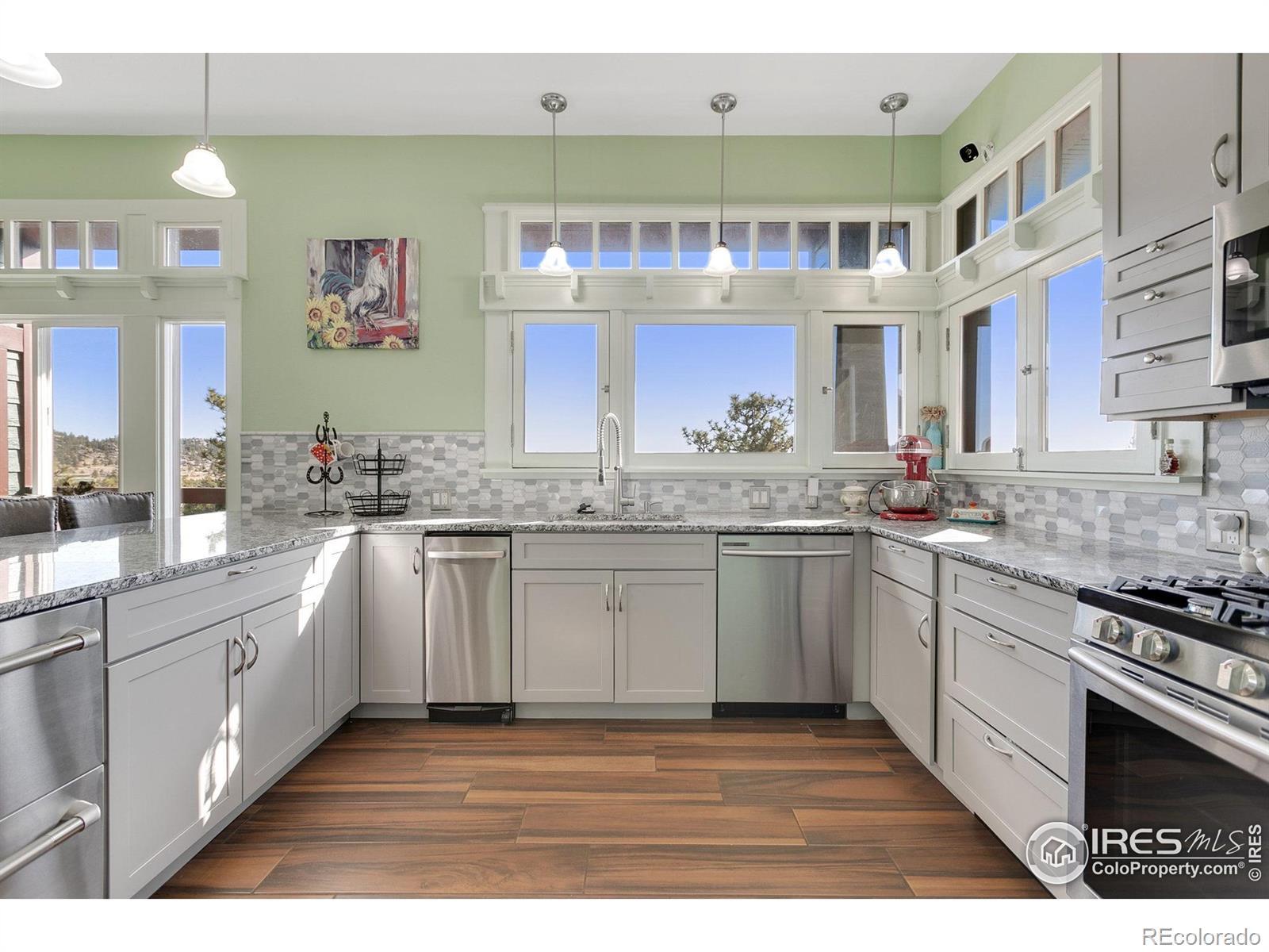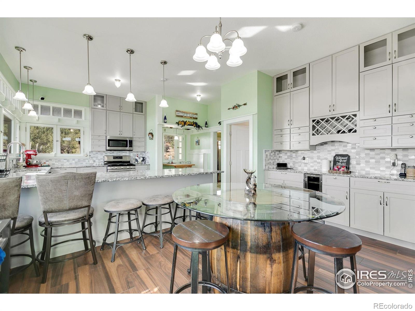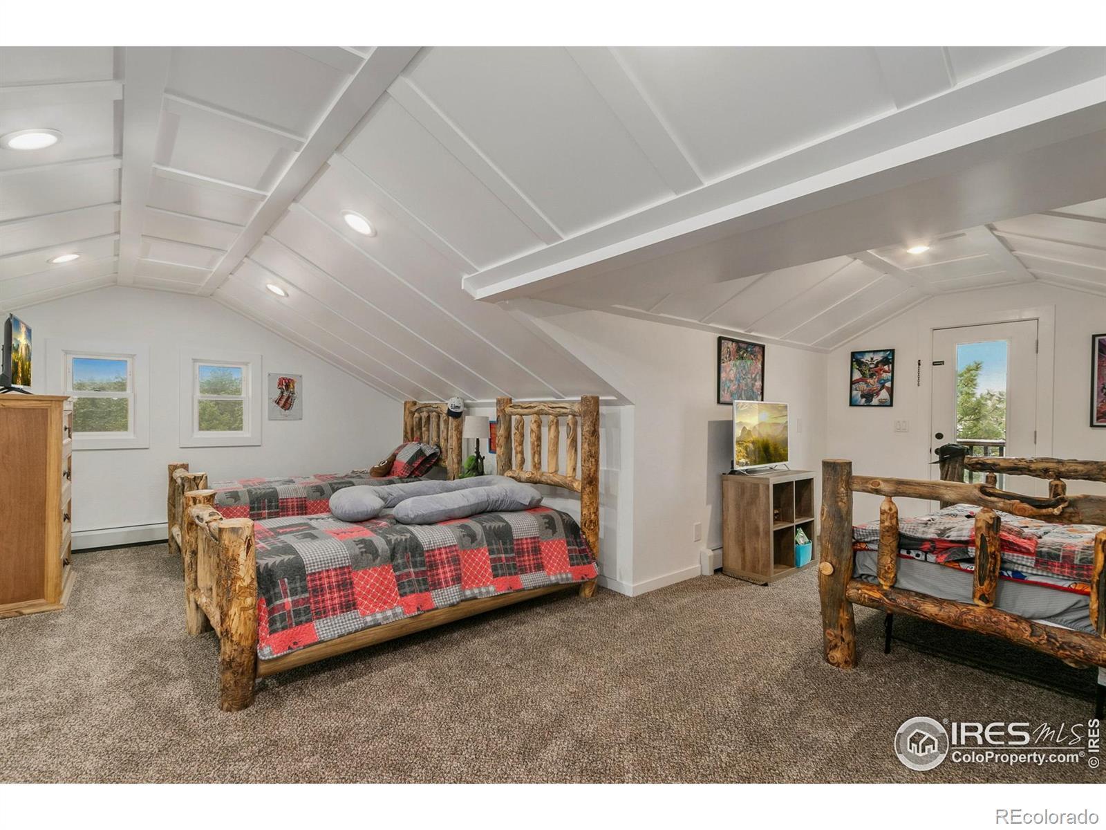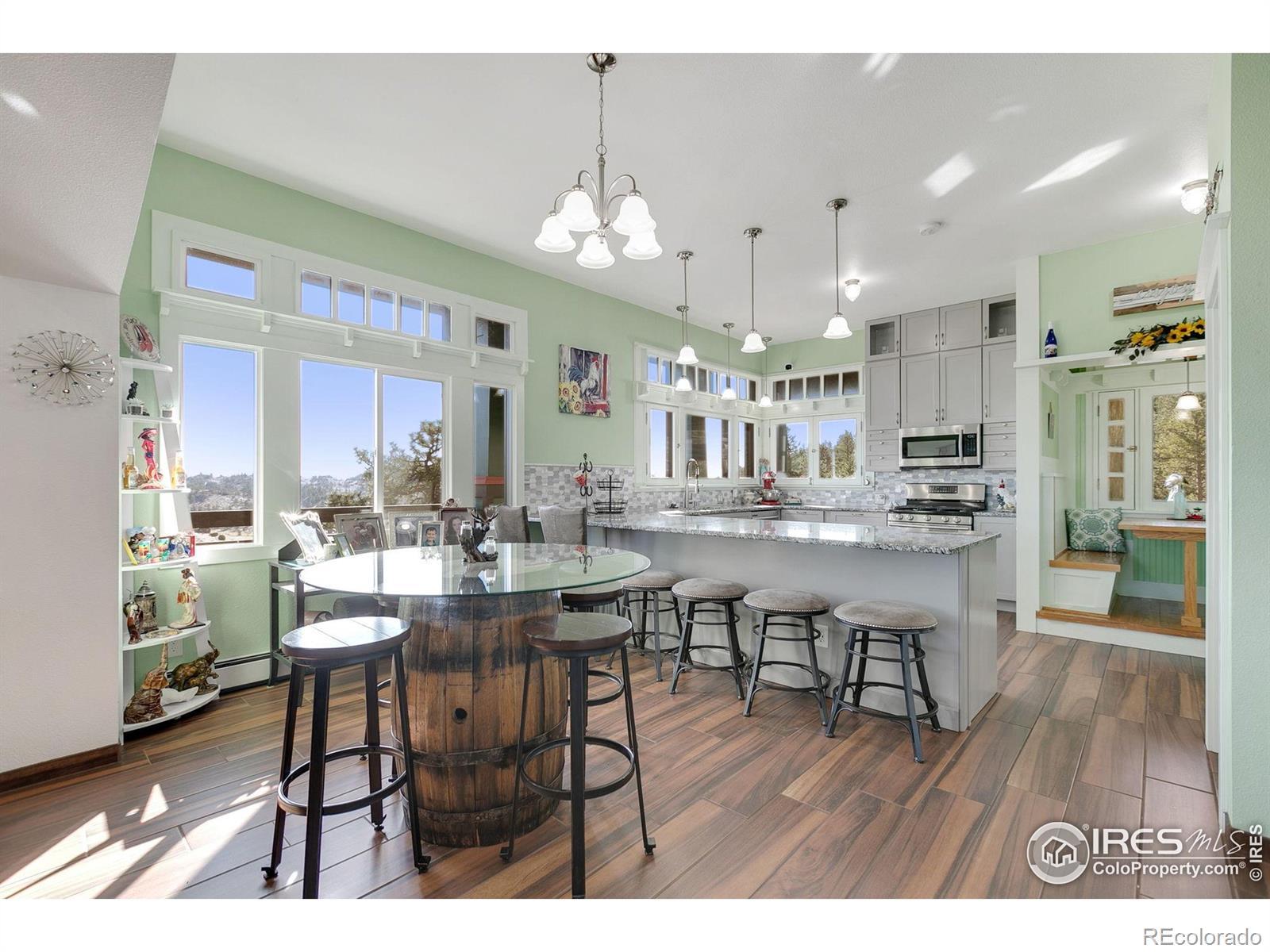 Perched above the treetops with sweeping mountain views, this custom-built retreat is designed for unforgettable stays and great short-term rental performance. The home offers a layout and amenities guests seek out-and return for. It could be your mountain dream home or home away from home. Wall-to-wall windows frame the scenery from the expansive entertaining kitchen, complete with dual under-counter refrigerators and a charming built-in Dutch-style dining nook. Multiple levels of outdoor decks and three private balconies create ideal spaces for relaxing, entertaining, and soaking in the views year-round.The home features 5 bedrooms, 4 bathrooms, offering flexibility for owners and rental guests alike. The spacious primary suite is a true sanctuary with a custom five-piece bath, freestanding soaking tub, walk-in closet, and private fireplace. On the lower level, an impressive private movie theater with seating for 13 and a full concession stand delivers a true cinematic experience-one of the home's most popular guest features. Additional highlights include hydronic heating, fireplaces in the great room and primary suite, and an adorable outdoor playhouse. Beautifully furnished (furniture is included), this turnkey mountain getaway is just 30 minutes from Fort Collins and minutes from fishing, boating, mountain biking, hiking, and outdoor recreation. Whether you're seeking a luxury personal escape, a high-performing VRBO investment, or both-this one truly delivers. A rare opportunity to own a proven short-term rental in an unforgettable mountain setting. Must see to fully appreciate.