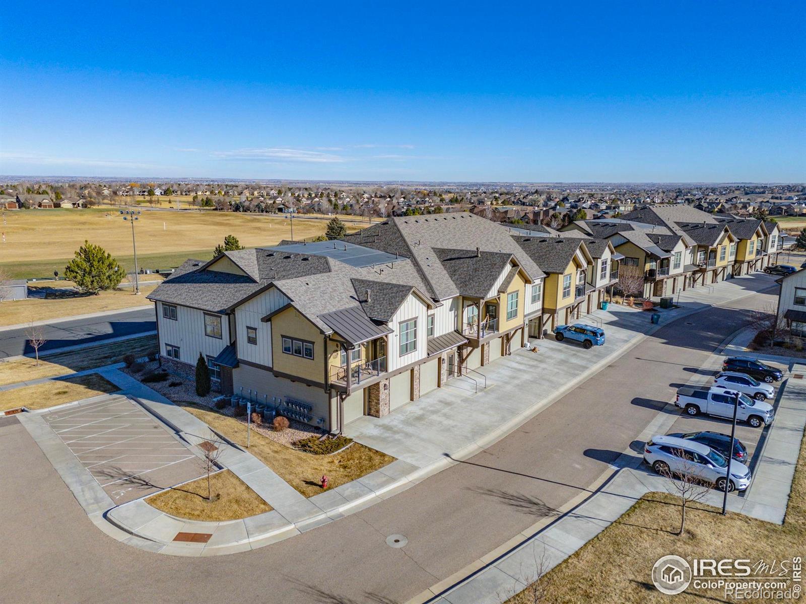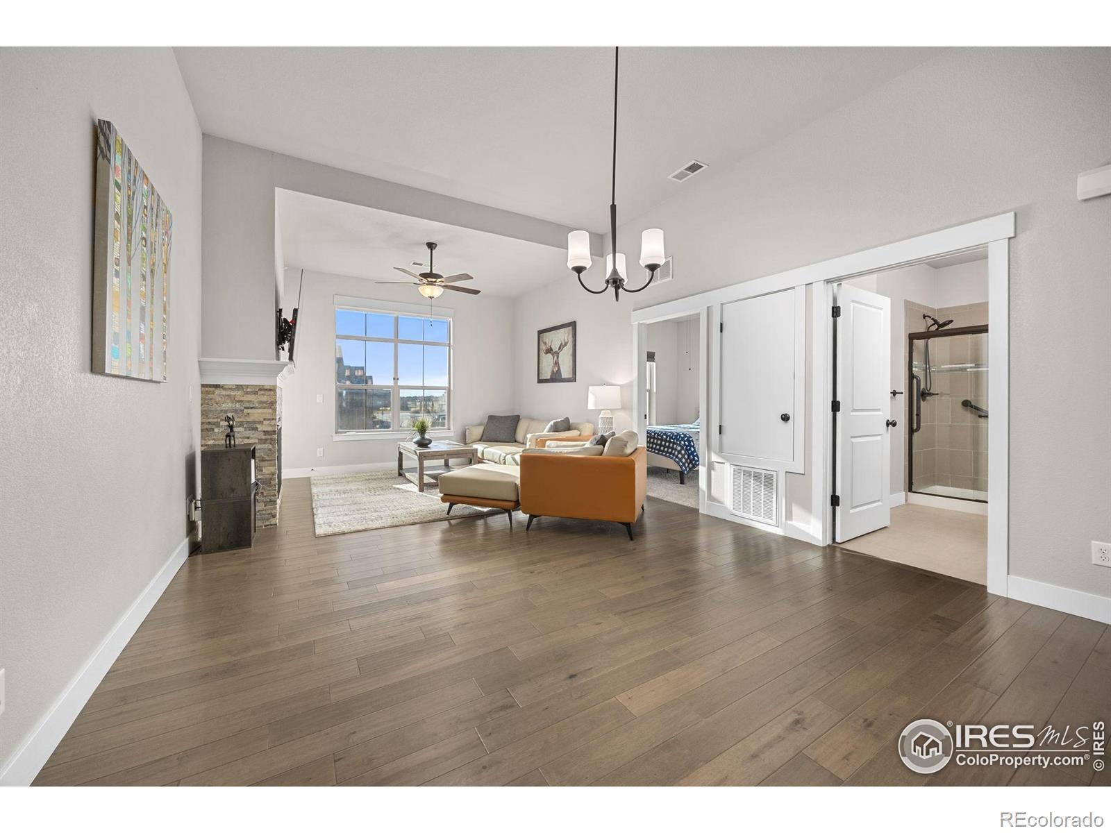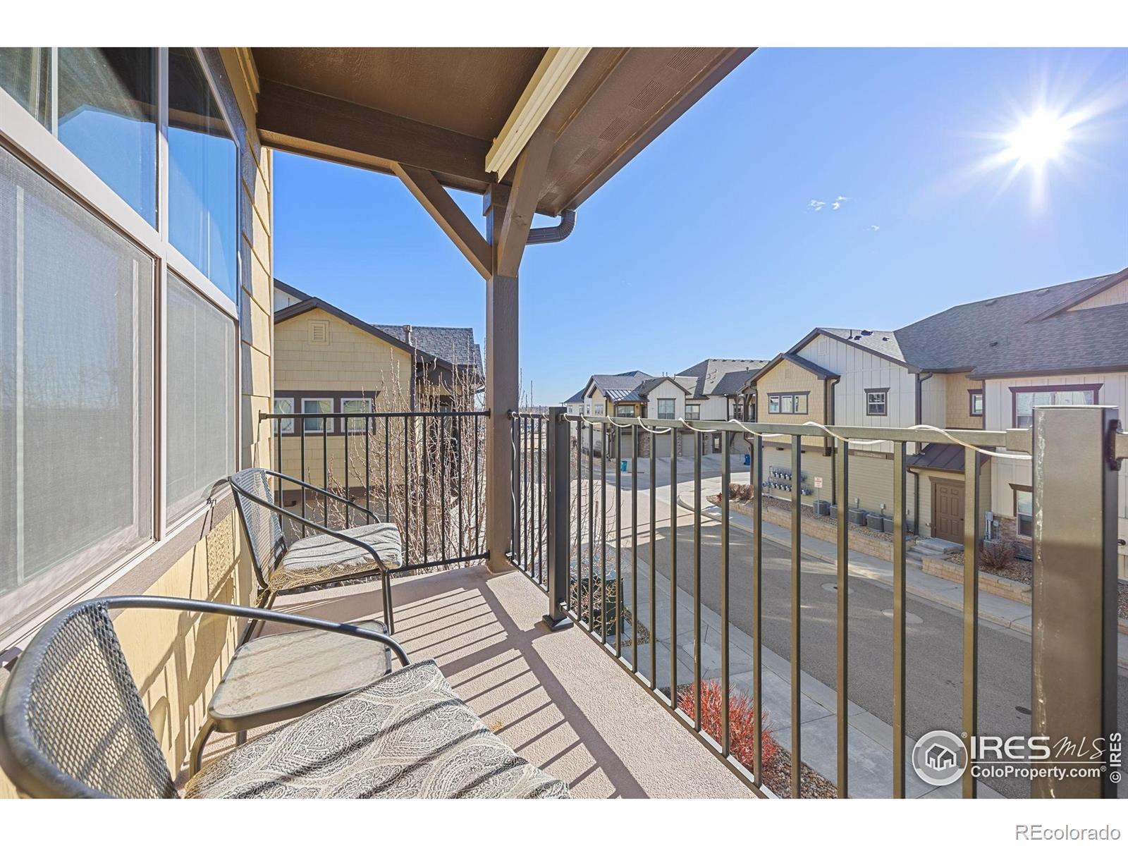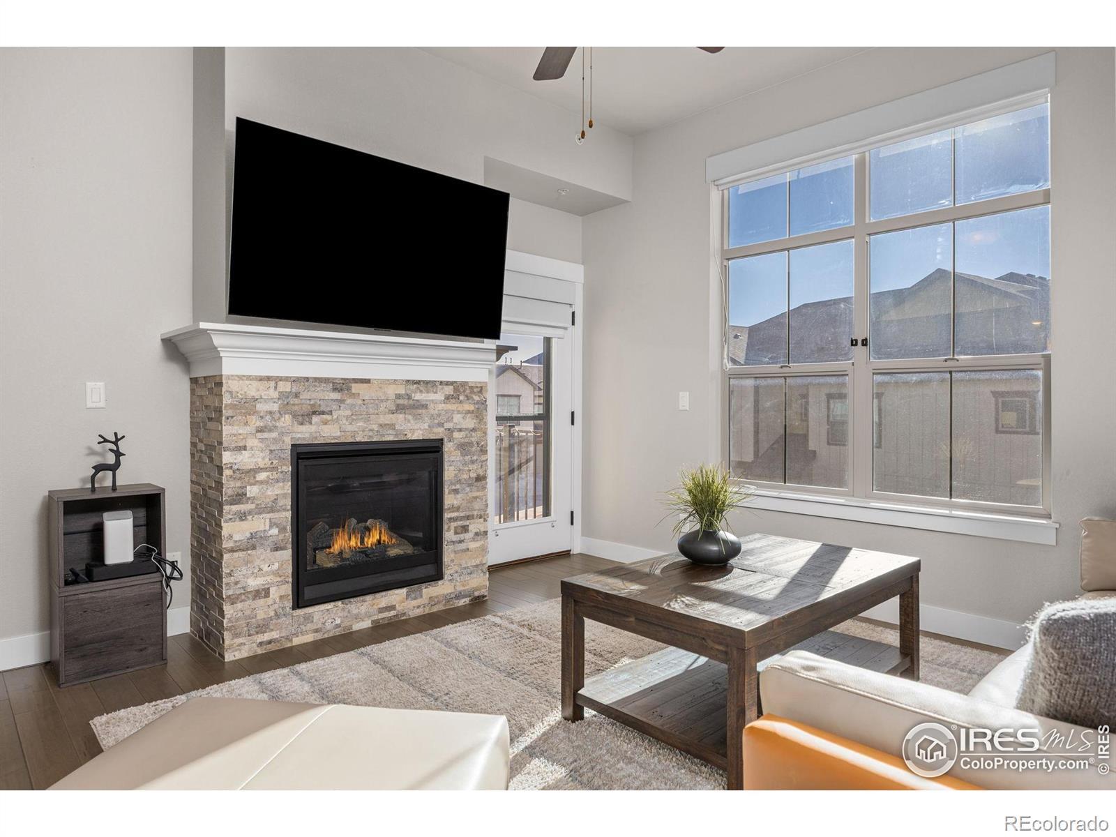 Discover luxury living in this stunning two-bedroom, two-bath end-unit condo at Portofino Flats at La Riva in beautiful Windsor, Colorado.Soaring 12-foot ceilings create an airy, open atmosphere throughout, accentuated by sleek modern finishes and abundant natural light. The spacious living room serves as the heart of the home, perfect for entertaining or relaxing by the fireplace on cool Colorado evenings.The gourmet kitchen impresses with gleaming stainless steel appliances, elegant quartz countertops, and ample cabinetry for effortless meal preparation. Enjoy the convenience of automatic blinds that add a touch of sophistication and privacy at the touch of a button.Retreat to generously sized primary bedroom with en-suite bath, offering comfort and tranquility.This desirable end-unit includes elevator access, one-car garage with extra storage space, Internet and cable TV, Water included in HOA fees. Residents of Portofino Flats enjoy resort-style amenities, including a relaxing hot tub and sauna, state-of-the-art gym, and more-all designed for an elevated lifestyle.Don't miss this opportunity to own a piece of modern elegance in a vibrant communit