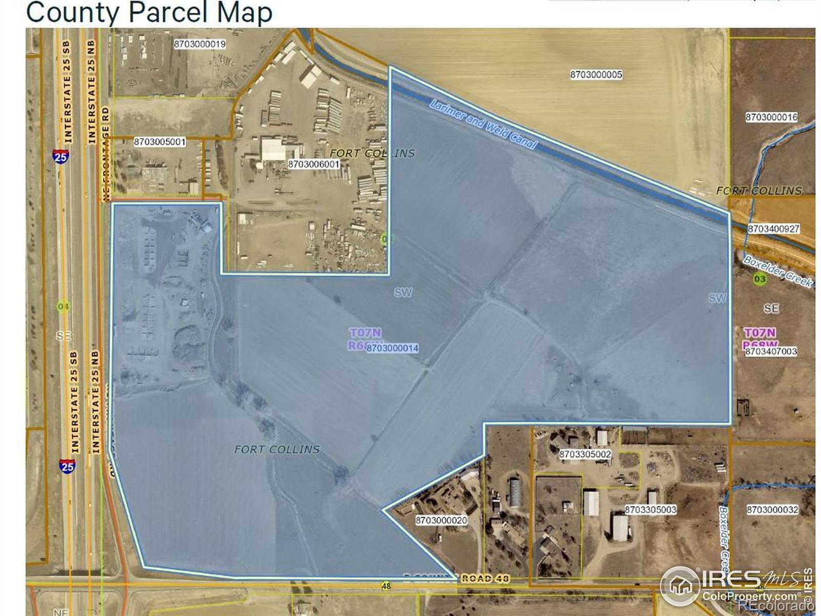 Location Advantage. Positioned at the northeast corner of I-25 and Vine Drive, this 78.5-acre parcel offers unmatched visibility and connectivity. With direct access to I-25, the region's primary north-south corridor, and proximity to major east-west routes, this site ensures seamless transportation for logistics, manufacturing, and distribution operations. Development Potential. This parcel offers flexibility for industrial parks, logistics centers, advanced manufacturing facilities, or mixed-use developments in addition to residential. With water rights and dual zoning, it's a rare opportunity to capitalize on Fort Collins' booming economy and strategic location. Property Highlights. Size: 78.5 acres. Zoning: Industrial & Urban Estate (City of Fort Collins). Water Rights: Included. Mineral Rights: Included. Frontage: High-visibility location along I-25. Utilities: Accessible infrastructure for large-scale development. Development PotentialThis parcel offers flexibility for industrial parks, logistics centers, advanced manufacturing facilities, or mixed-use developments in addition to residential. With water rights and dual zoning, it's a rare opportunity to capitalize on Fort Collins' booming economy and strategic location.
