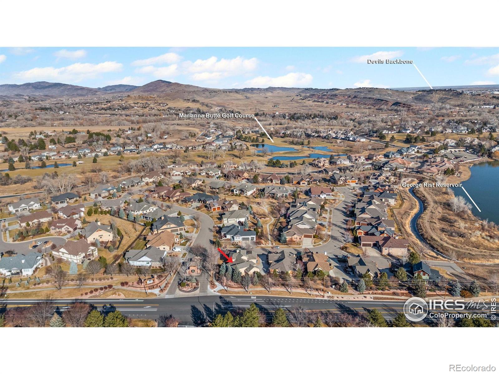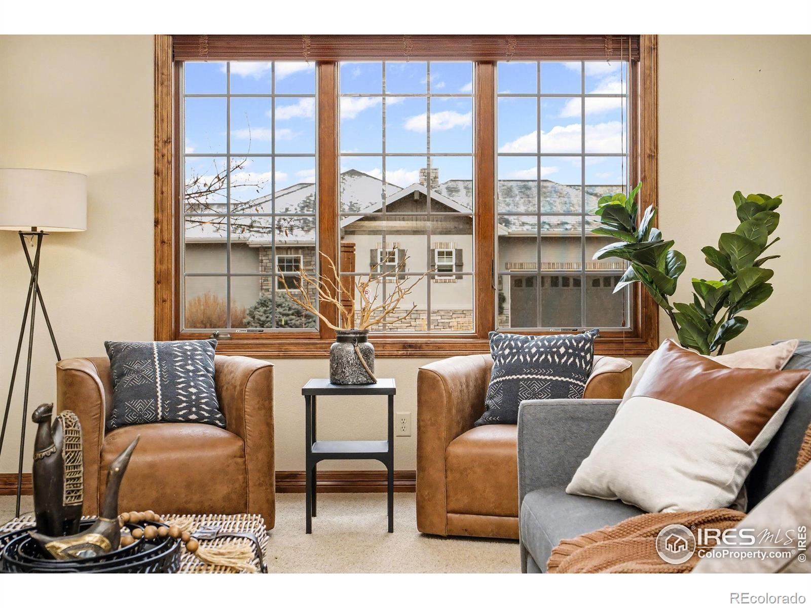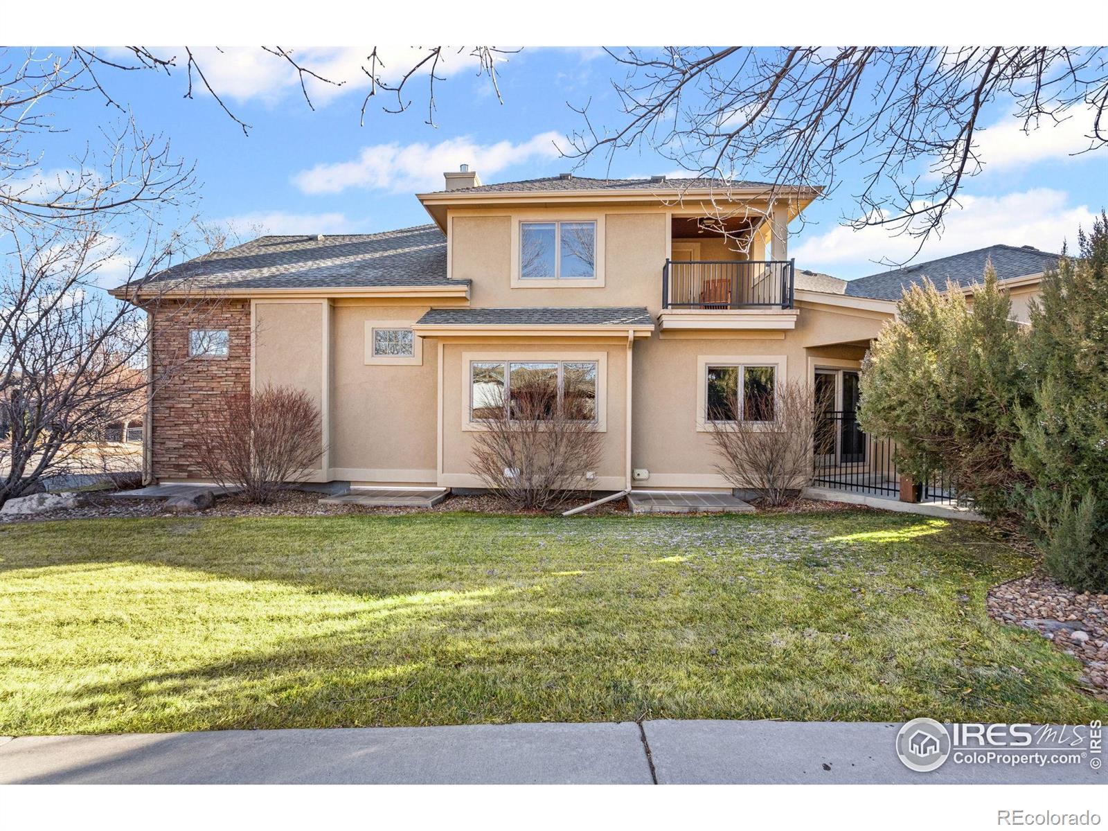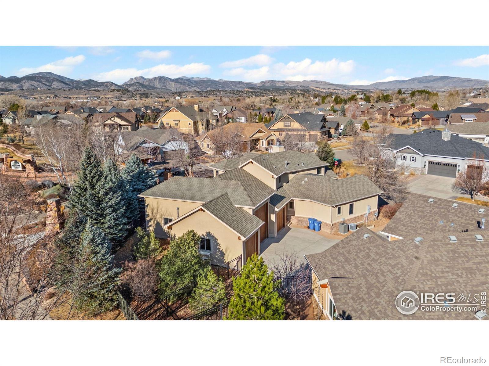 Built for an active Colorado lifestyle, this luxury home in gated Overlook at Mariana features an oversized RV garage and effortless main-level living- offering a true "stay & play" or "lock & leave" experience. Just minutes from golf, trails, and mountain recreation. This 3-bedroom, 4-bath home offers an exceptional open floor plan, vaulted ceilings, and quality finishes throughout. The oversized (1107 sqft) 3-bay attached garage includes an RV bay, perfect for RV, boat, or recreational storage.The main level is designed for easy living and entertaining. A dramatic double-sided stone gas fireplace connects the kitchen/dining with the living room, which boasts vaulted and beamed ceilings. The open kitchen includes wood floors, a large island, pantry, eat-in dining space, and gas stove. Main floor also includes a spacious primary suite with luxury bath and huge walk-in closet, a large laundry room with sink and cabinetry, and an additional bedroom or office with its own full bathroom. Upstairs offers a loft or office, private bedroom and balcony with mountain views and full bathroom. Unfinished basement provides excellent storage or future expansion. Additional features -- 2 central A/Cs & high-efficiency furnaces, double-pane windows, safety storm doors, oversized RV/boat garage. The home lives like a patio home with a low-maintenance yard, sprinkler system, and private patio. Perfect home for those who travel or want minimal upkeep. Situated within a gated, "Stay & Play" community offering walking trails, common areas, and a serene setting close to Mariana Butte Golf Course, lakes, and Northern Colorado recreation. A rare blend of custom quality, main-level living, and true lock-and-leave convenience in Northern Colorado. Conveniently positioned for exploring Northern Colorado, with scenic drives to Fort Collins or Longmont (30 min each), Estes Park (40 min), Boulder (50 min), and Denver (approximately 1 hour). See Video Walk-through.
