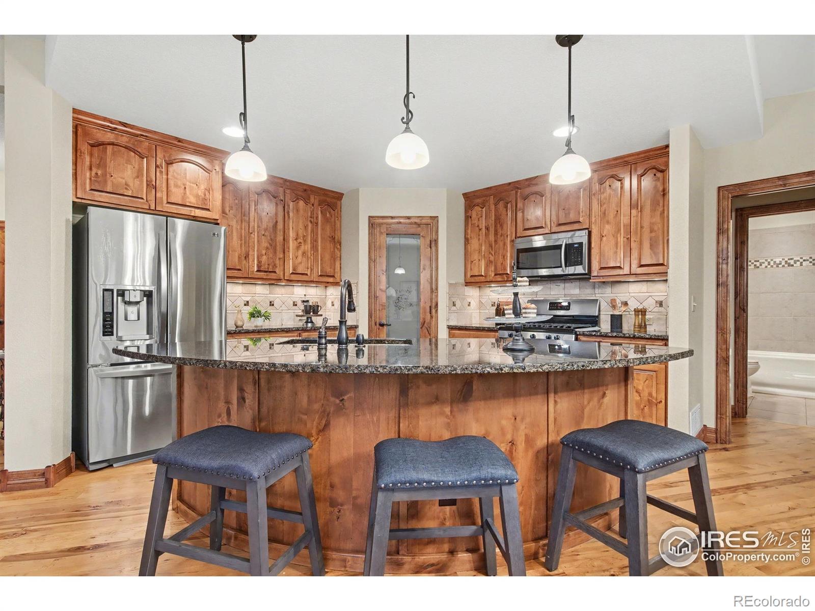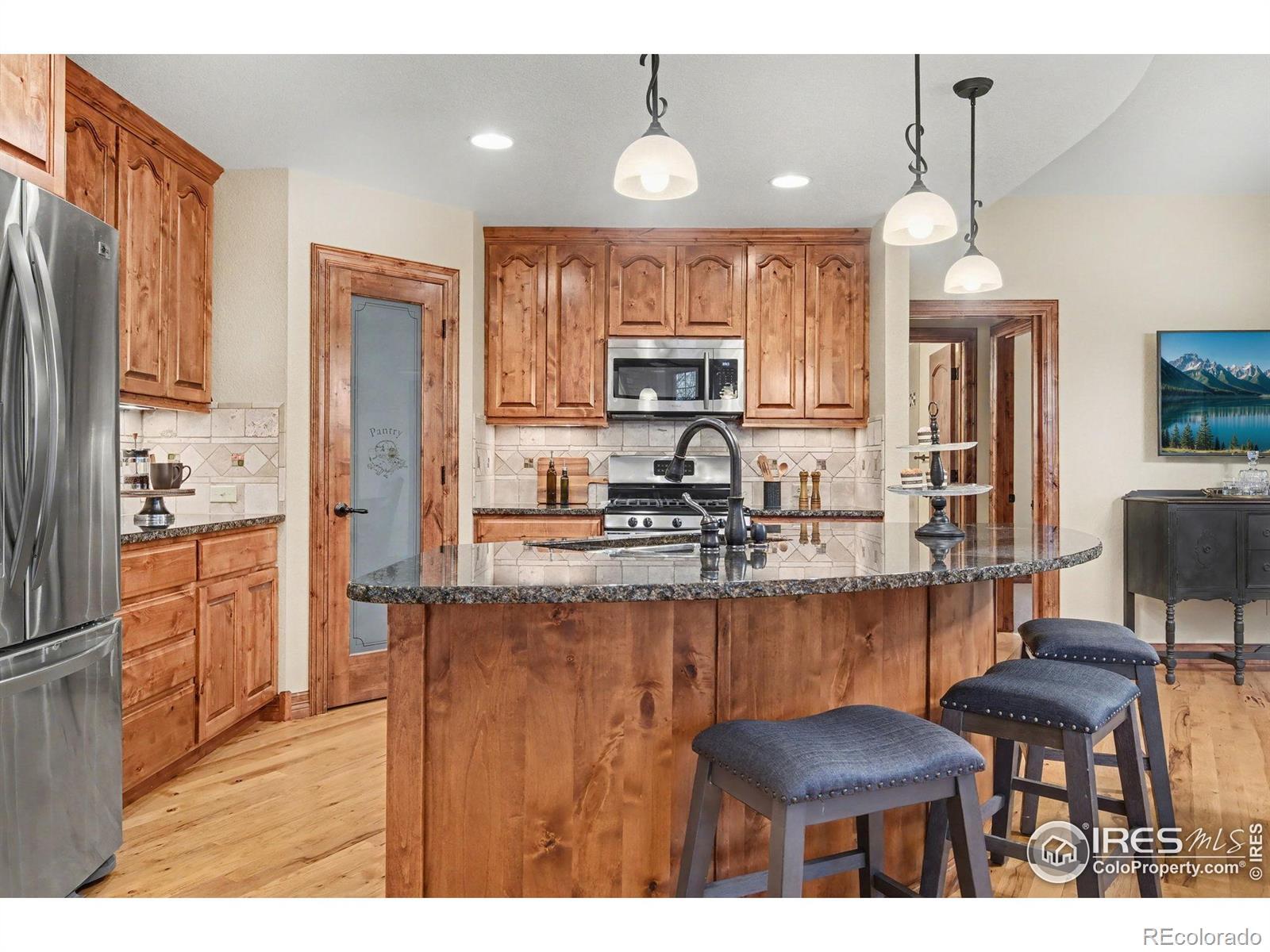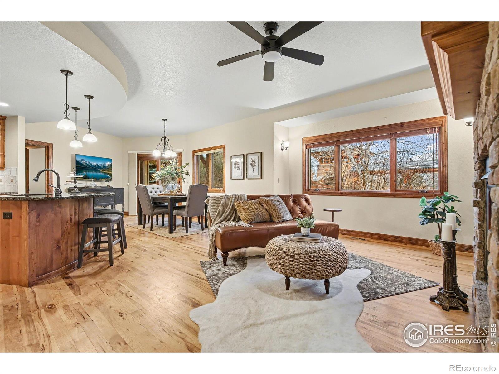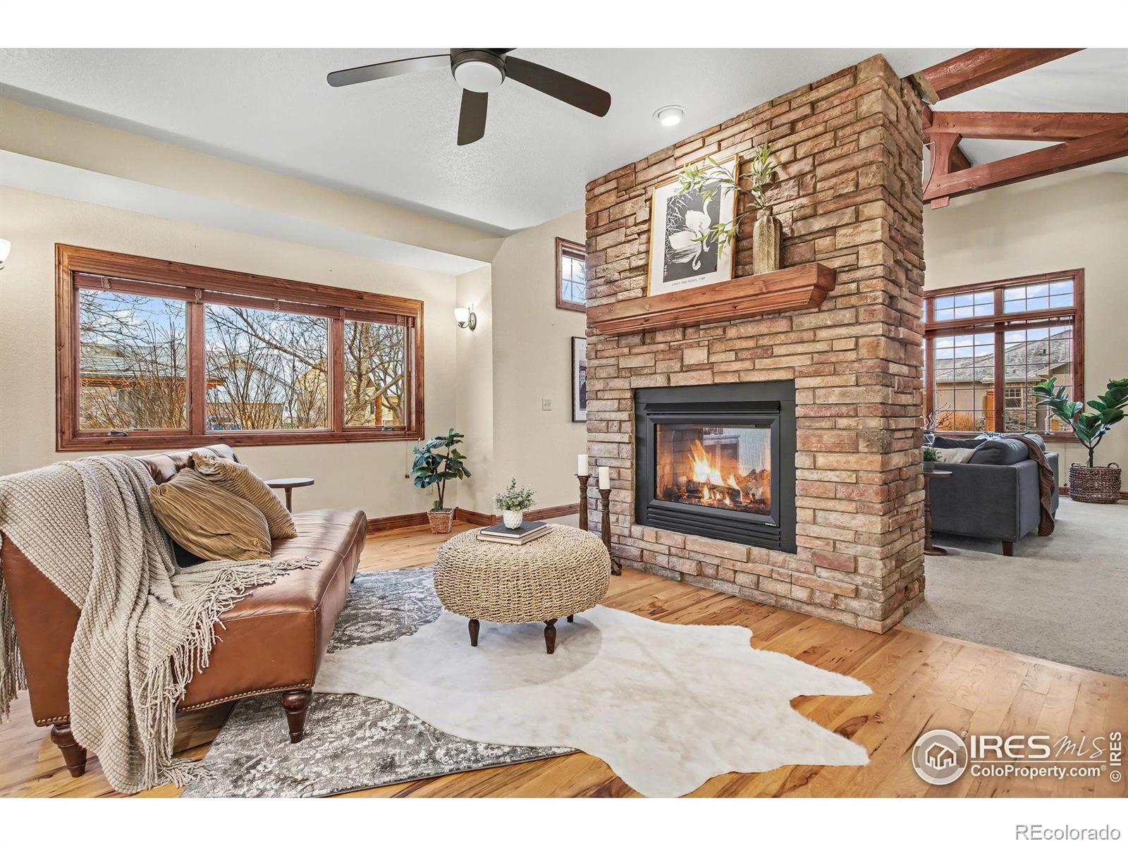 Built for an active Colorado lifestyle, this luxury home in gated Overlook at Mariana features an oversized RV garage and effortless main-level living- offering a true "stay & play" or "lock & leave" experience. Just minutes from golf, trails, and mountain recreation. This 3-bedroom, 4-bath home offers an exceptional open floor plan, vaulted ceilings, and quality finishes throughout. The oversized (1107 sqft) 3-bay attached garage includes an RV bay, perfect for RV, boat, or recreational storage.The main level is designed for easy living and entertaining. A dramatic double-sided stone gas fireplace connects the kitchen/dining with the living room, which boasts vaulted and beamed ceilings. The open kitchen includes wood floors, a large island, pantry, eat-in dining space, and gas stove. Main floor also includes a spacious primary suite with luxury bath and huge walk-in closet, a large laundry room with sink and cabinetry, and an additional bedroom or office with its own full bathroom. Upstairs offers a loft or office, private bedroom and balcony with mountain views and full bathroom. Unfinished basement provides excellent storage or future expansion. Additional features -- 2 central A/Cs & high-efficiency furnaces, double-pane windows, safety storm doors, oversized RV/boat garage. The home lives like a patio home with a low-maintenance yard, sprinkler system, and private patio. Perfect home for those who travel or want minimal upkeep. Situated within a gated, "Stay & Play" community offering walking trails, common areas, and a serene setting close to Mariana Butte Golf Course, lakes, and Northern Colorado recreation. A rare blend of custom quality, main-level living, and true lock-and-leave convenience in Northern Colorado. Conveniently positioned for exploring Northern Colorado, with scenic drives to Fort Collins or Longmont (30 min each), Estes Park (40 min), Boulder (50 min), and Denver (approximately 1 hour). See Video Walk-through.