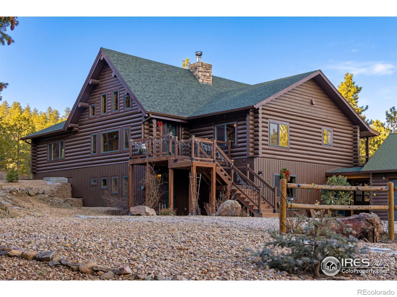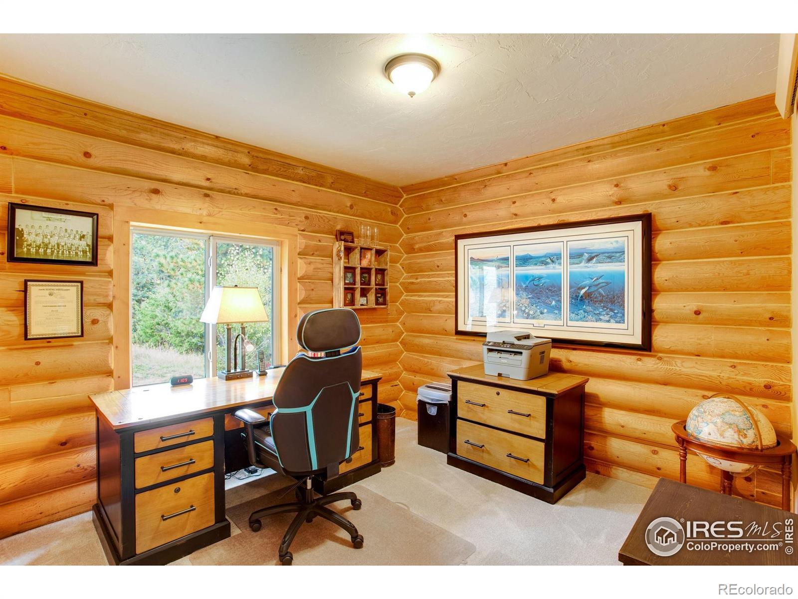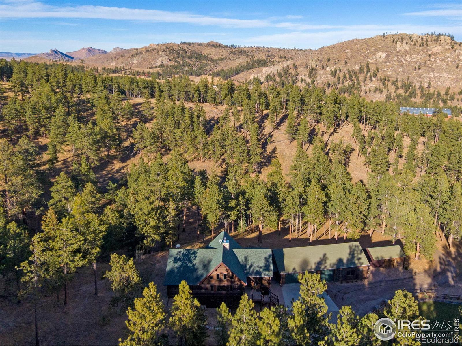 TURN KEY Option with all major furniture included. This luxurious log home sits on a 35-acre timbered lot and features abundant wildlife, a seasonal creek, rolling terrain, meadow and aspen grove. Located less than 30 minutes from Fort Collins, the property offers privacy and a true escape from the city. With 3,966 total sq. ft. and 3,638 finished, the home is solidly built and full of character and upgrades. Enter through a spacious grand foyer into a large living room with vaulted ceilings and an impressive floor-to-ceiling stone fireplace. The kitchen features granite slab counters, stainless steel appliances (all included), pantry, ample cabinetry and counter space. The primary suite offers a retreat with large closet and a 5-piece luxury bath including clawfoot tub, dual raised vanities and a spacious shower. Also on the main floor are a laundry, guest bedroom and an executive office that could serve as a TV room or formal living area. The walk-out basement includes a recreation room, family room with electric fireplace, wet bar, two additional guest bedrooms, a third full bath and two large storage areas, one designed as a cooled wine and food storage room. An attached 1,740 sq. ft. garage/shop provides ample space for vehicles and projects, complemented by a 625 sq. ft. covered wood storage area. Irrigated sodded area for fun and relaxation plus a front and back patio, water feature and so much more. Call today for a detailed feature list, floor plan or to schedule your private showing.