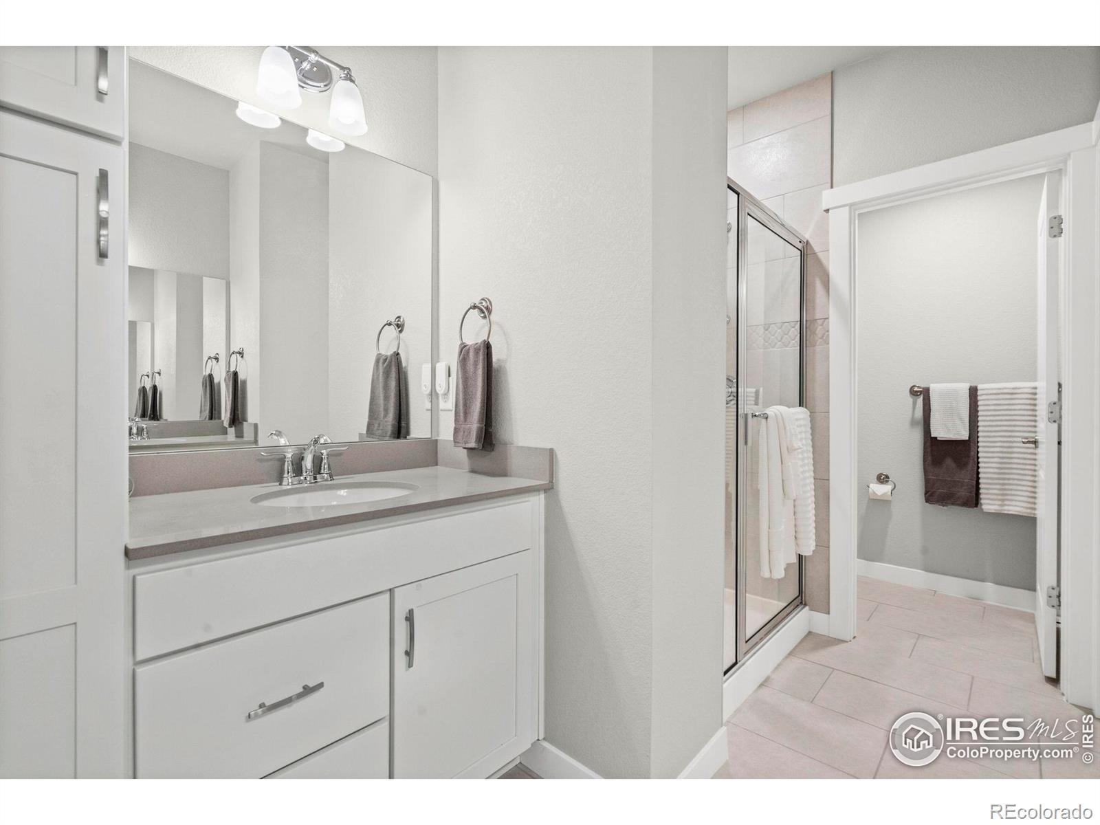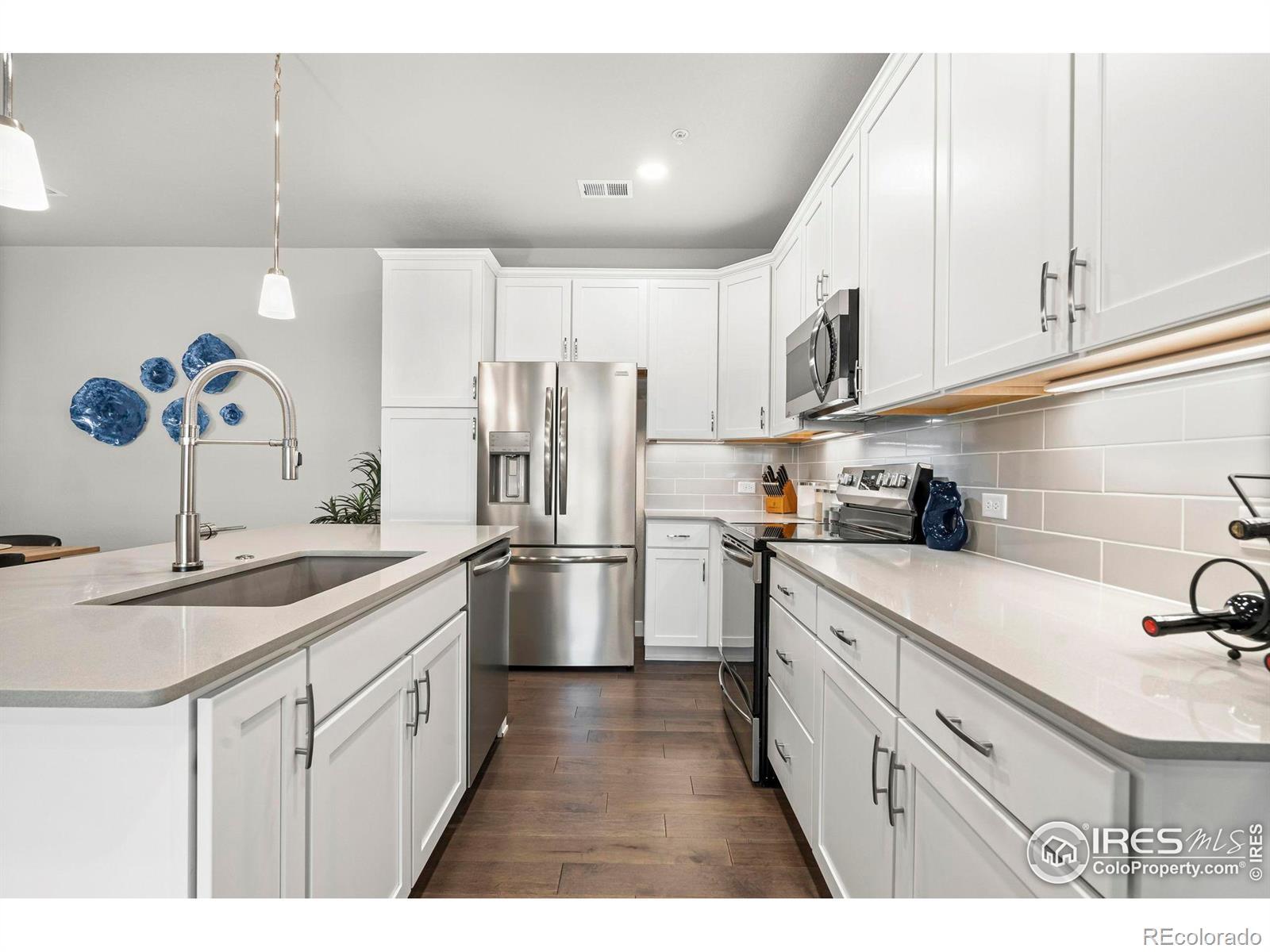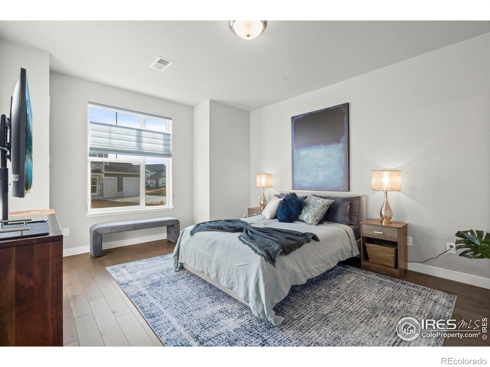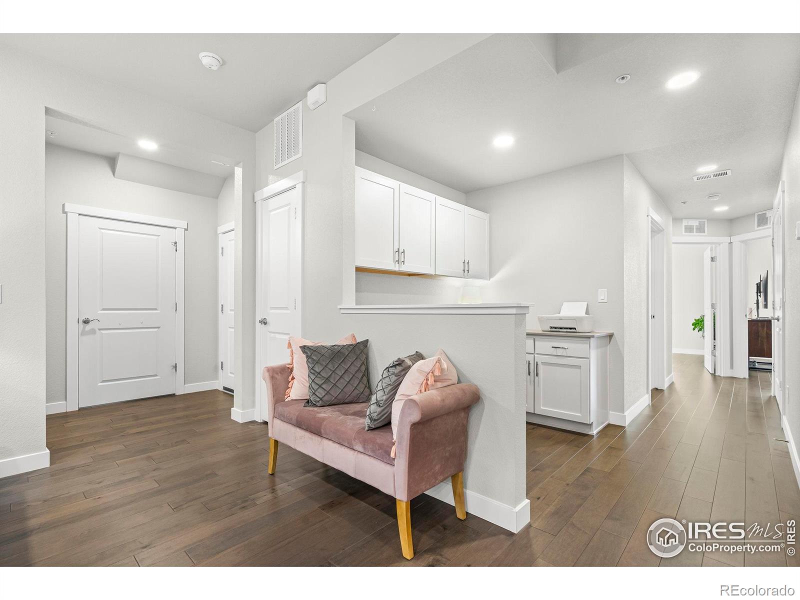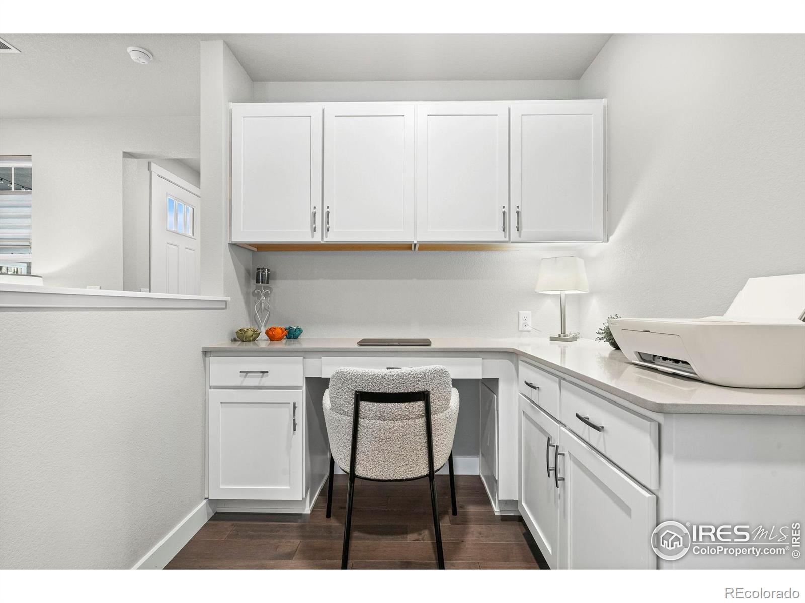Easy living starts the moment you arrive in this main-floor condo at The Lakes! Designed for a true lock-and-leave lifestyle, this well-located unit puts everyday convenience front and center, with quick access to the shops, dining, and entertainment found throughout the Centerra area. Lovingly maintained by the original owners, this 2-bed, 2-bath unit shines with major upgrades already completed, creating a polished, move-in ready space that feels fresh and welcoming from the moment you arrive. Inside, the open main living area draws you in with abundant natural light and engineered hardwood flooring throughout, creating a seamless flow that's perfect for everyday living. The kitchen features quartz countertops, stainless steel appliances including a new refrigerator, generous prep space, and ample storage that keeps everything organized and within reach. Tucked neatly into the layout is a cozy office or study nook, perfect for focused work, creative projects, or a quiet reading corner without sacrificing the openness of the living space. The primary suite offers a relaxing escape with its own ensuite bathroom and a walk-in closet. Both bathrooms are finished with ceramic tile flooring, adding durability and a cohesive look that complements the rest of the home. A one-car garage adds secure parking and storage, while additional driveway parking offers flexibility for guests or extra vehicles. The home sits adjacent to a community park and is surrounded by scenic walking trails that wind around nearby Houts Reservoir and Equalizer Lake. A few minutes west is Boyd Lake State Park, where you can enjoy more trails, plus boating and water recreation. A community unlike any other, The Lakes proudly stands as Colorado's only Certified Community Wildlife Habitat, offering a rare blend of thoughtfully planned living and a deep connection to nature that truly sets it apart.