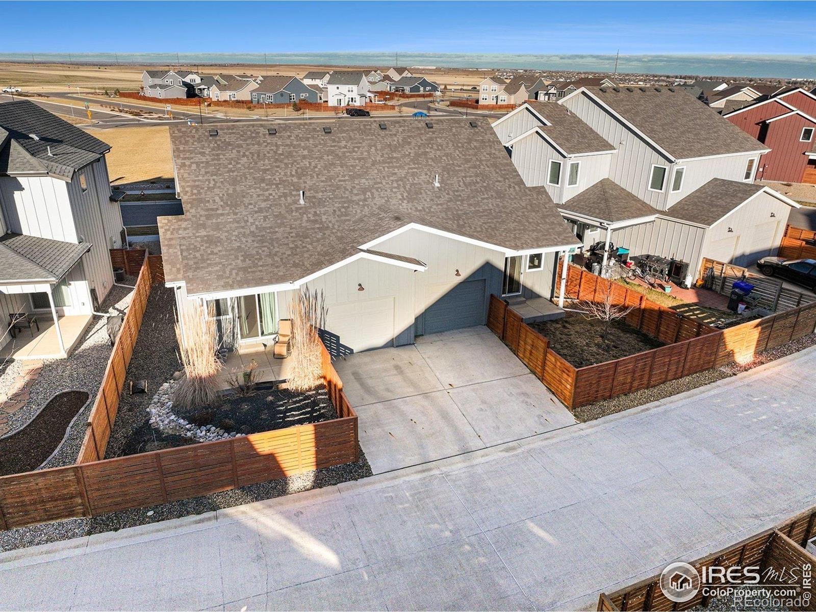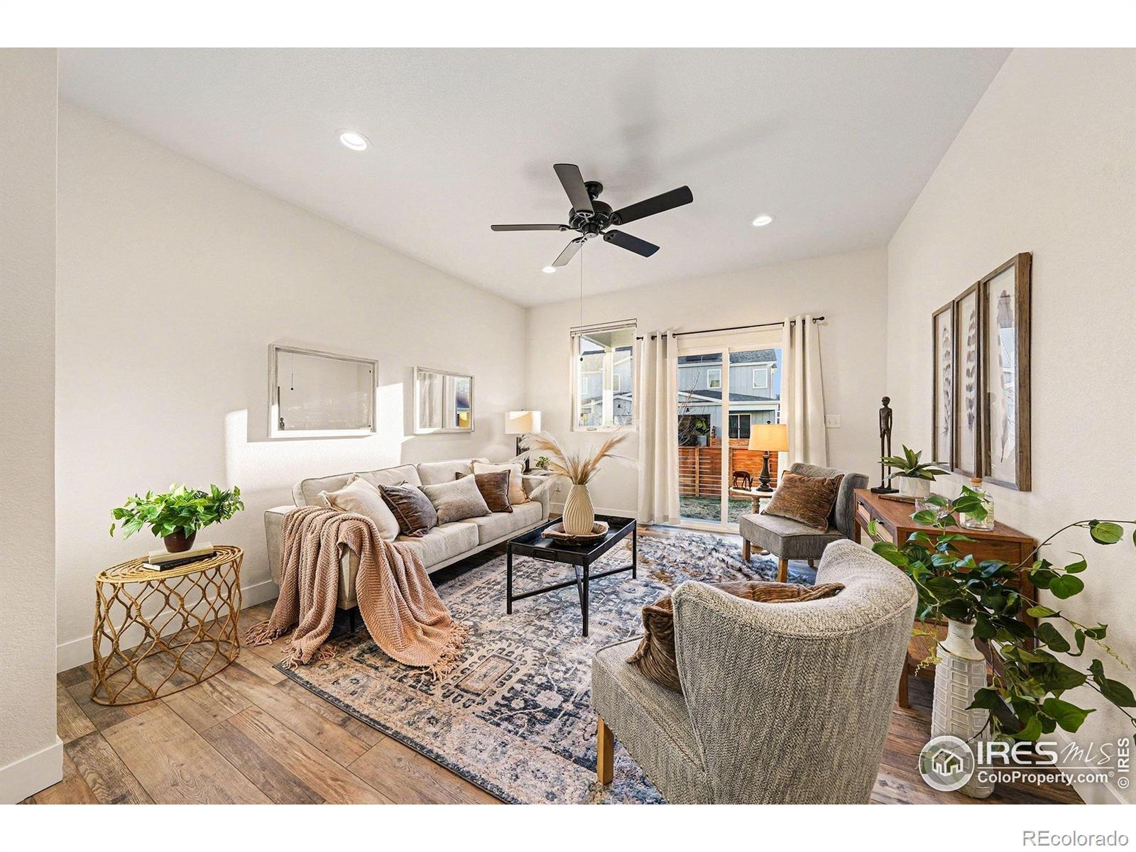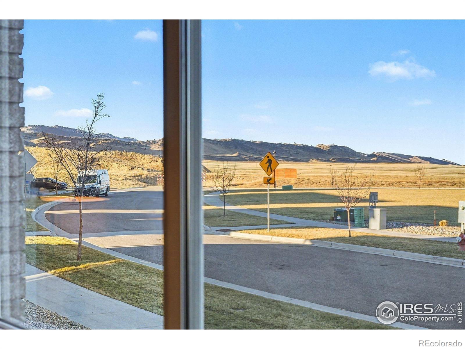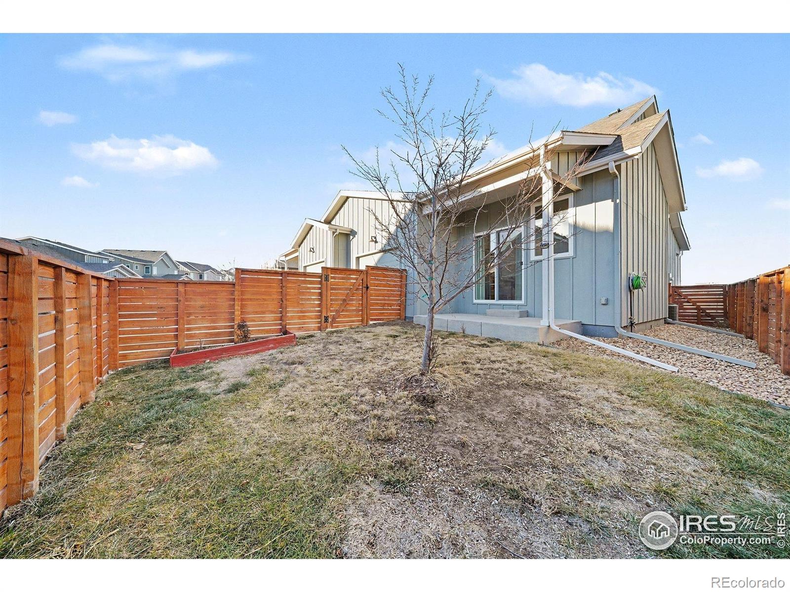 Ranch-style paired home offering efficient main-floor living directly across from a community park and open space with mountain views. This 2-bed, 2-bath layout features 9-foot ceilings throughout and a thoughtfully designed floor plan that includes a separate dining room - a rare feature for a home of this size.The kitchen offers stainless steel appliances, espresso-finished Knotty Alder cabinetry, white subway tile backsplash, a peninsula with bar-top seating, and a large pantry. Vinyl flooring runs through the kitchen, living area, dining room, entry, bathrooms, and laundry. Washer and dryer included.Comfort and efficiency features include an efficient furnace, central A/C, whole-house humidifier, tankless water heater, sump pit and pump, and a smart-phone compatible thermostat, along with ceiling fans and timed exhaust fans. Storage includes a front coat closet, generous bedroom closets, and a crawlspace. An attached one-car garage with opener adds convenience.Outdoor living features a covered patio, fully fenced backyard, and a covered front porch facing the park - ideal for enjoying sunsets and mountain views. The front yard is xeriscaped and maintained by the HOA for low-maintenance living. Conveniently located near parks, trails, shopping, and everyday amenities in Loveland.