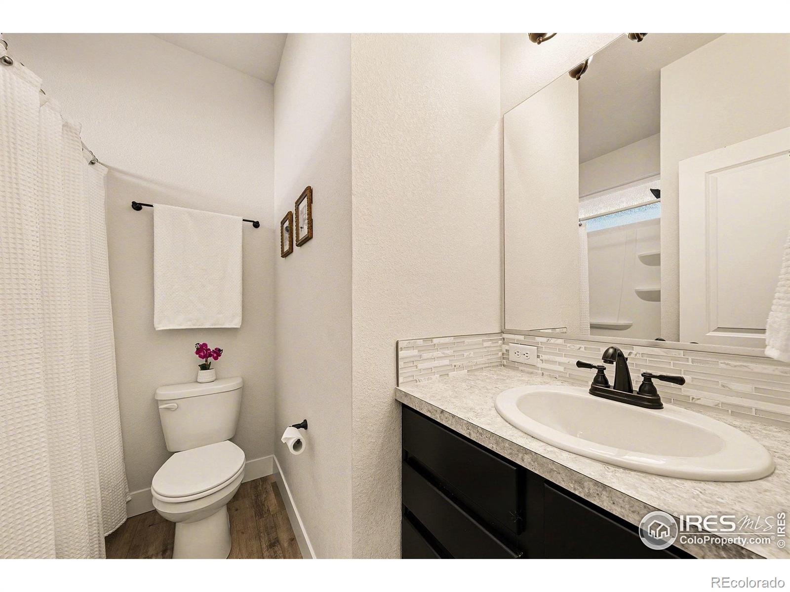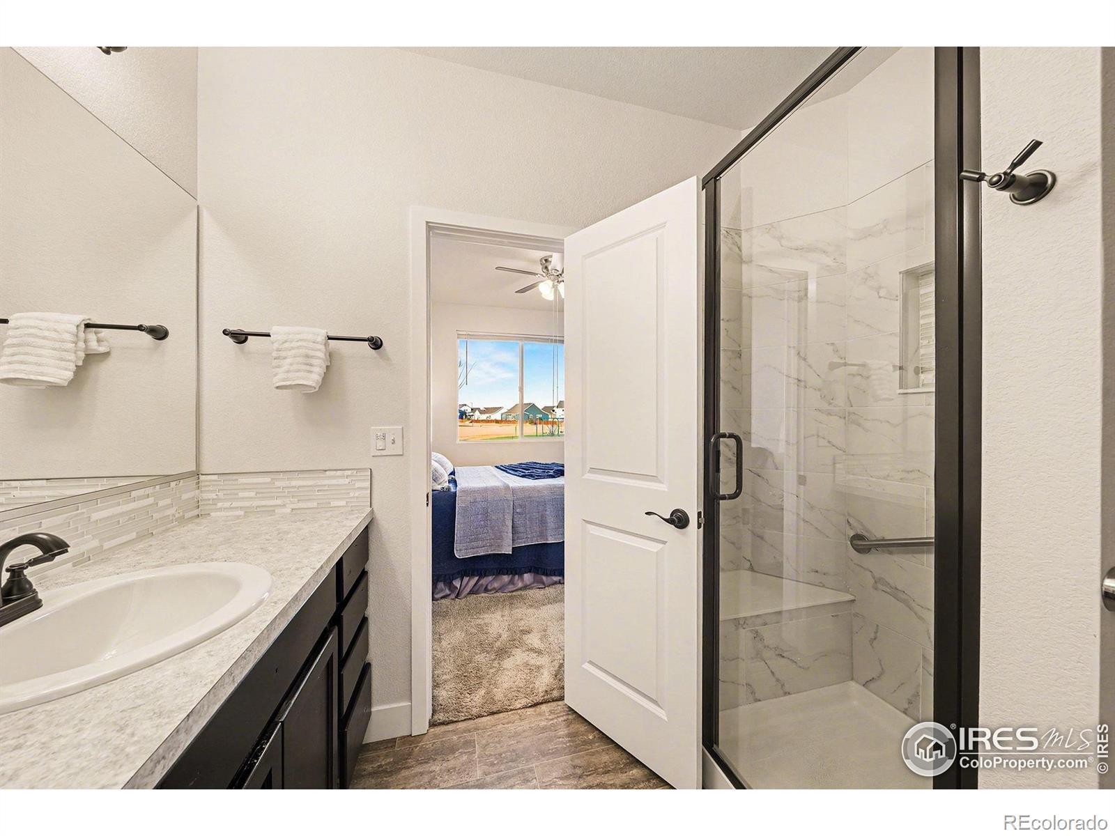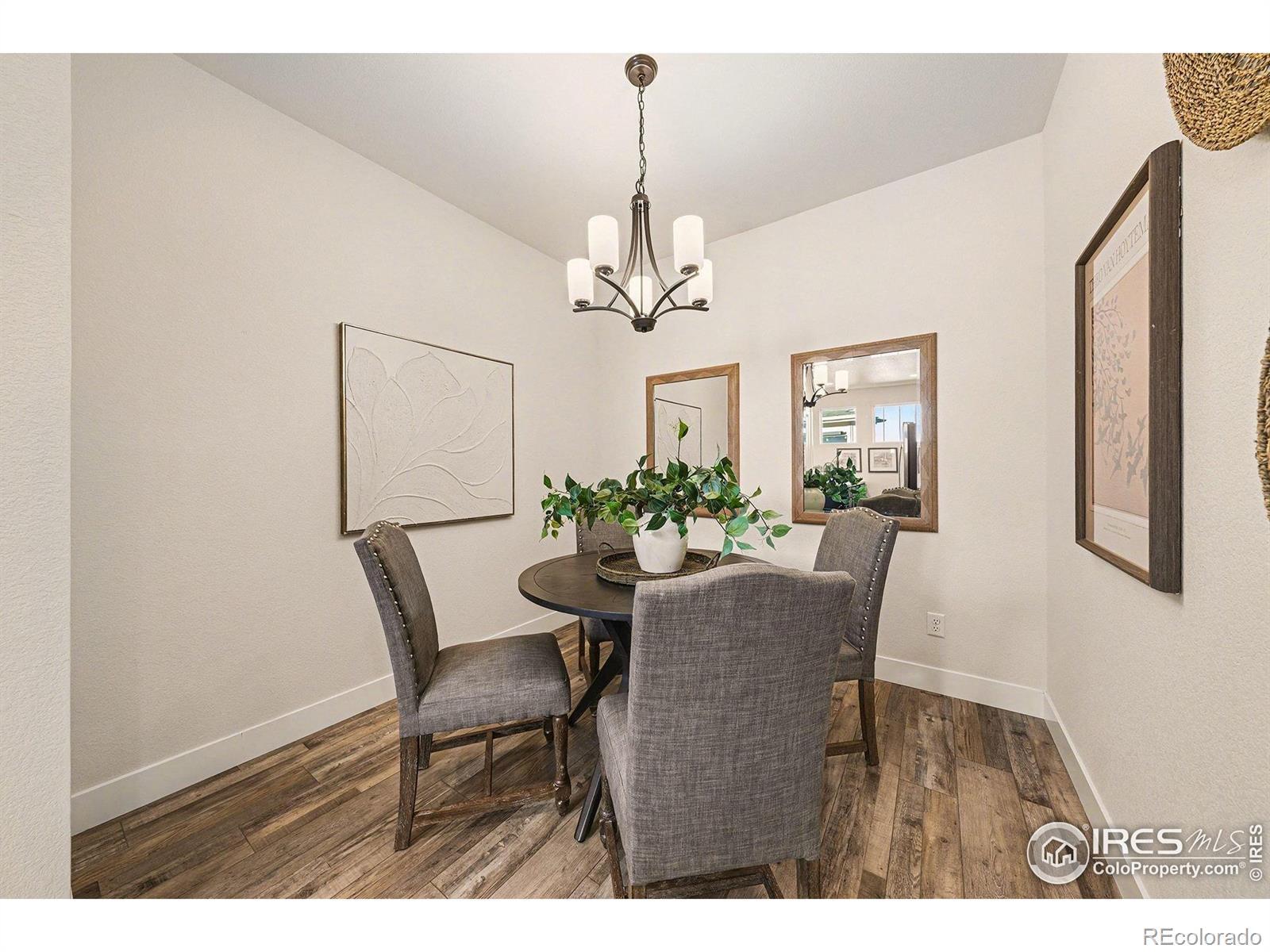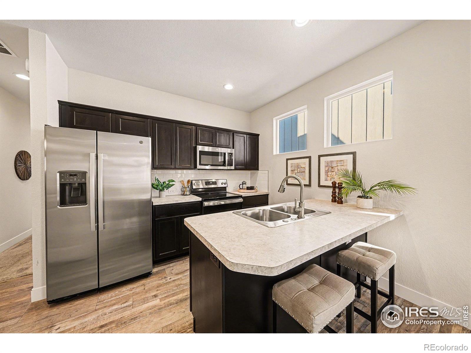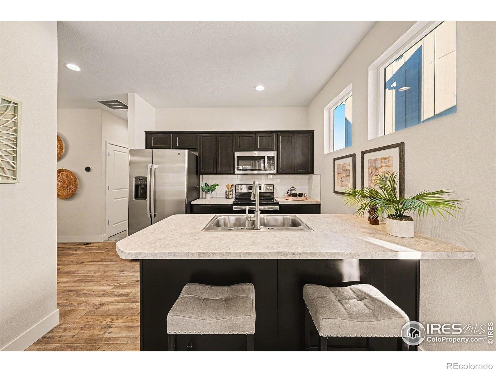 Ranch-style paired home offering efficient main-floor living directly across from a community park and open space with mountain views. This 2-bed, 2-bath layout features 9-foot ceilings throughout and a thoughtfully designed floor plan that includes a separate dining room - a rare feature for a home of this size.The kitchen offers stainless steel appliances, espresso-finished Knotty Alder cabinetry, white subway tile backsplash, a peninsula with bar-top seating, and a large pantry. Vinyl flooring runs through the kitchen, living area, dining room, entry, bathrooms, and laundry. Washer and dryer included.Comfort and efficiency features include an efficient furnace, central A/C, whole-house humidifier, tankless water heater, sump pit and pump, and a smart-phone compatible thermostat, along with ceiling fans and timed exhaust fans. Storage includes a front coat closet, generous bedroom closets, and a crawlspace. An attached one-car garage with opener adds convenience.Outdoor living features a covered patio, fully fenced backyard, and a covered front porch facing the park - ideal for enjoying sunsets and mountain views. The front yard is xeriscaped and maintained by the HOA for low-maintenance living. Conveniently located near parks, trails, shopping, and everyday amenities in Loveland.