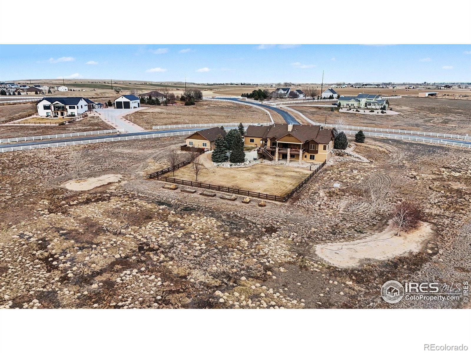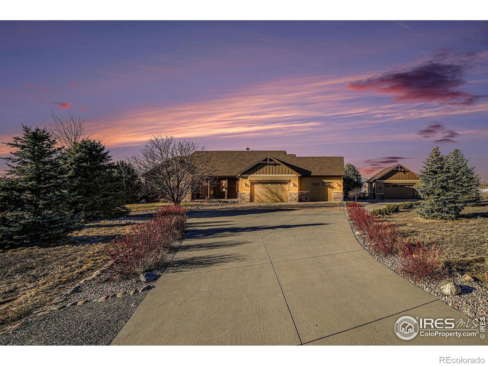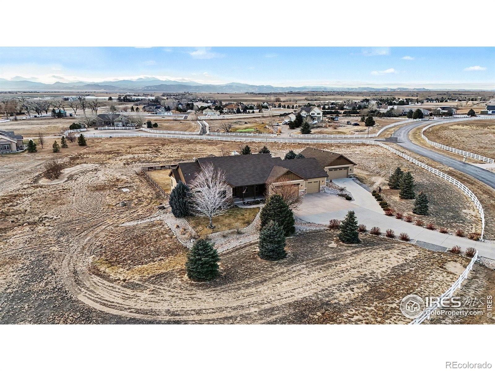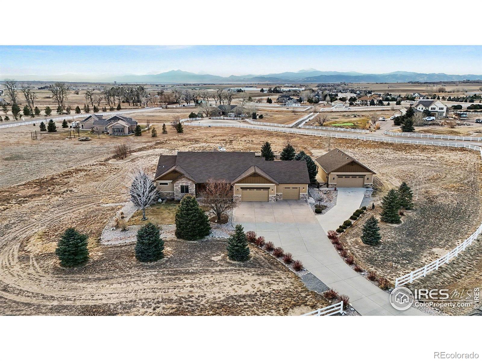 Set on an elevated lot in the gated Belmont Farms community, this custom ranch-style home with a walkout basement offers sweeping mountain views, privacy, and room to breathe-just minutes from I-25 with no metro district.Designed to capture the surrounding scenery, the great room features floor-to-ceiling windows, hardwood floors, and a dramatic three-sided fireplace that anchors the main living space. The kitchen opens seamlessly to the living area and includes granite countertops, stainless appliances, generous cabinetry, and a pantry-ideal for both everyday living and entertaining.The primary suite is a true retreat with a private sitting area, fireplace, spa-style bath, and oversized walk-in shower, all oriented to take in the expansive views. A second main-floor bedroom provides flexibility for guests or a home office, along with convenient main-floor laundry.The finished walkout basement expands the living space with a large recreation and entertainment area, wet bar, fireplace, two additional bedrooms, a full bath, and abundant storage-perfect for hosting, hobbies, or multi-generational living.Outside, the property continues to impress with mature landscaping, a covered deck, and a walkout patio ideal for enjoying Colorado sunsets. In addition to the attached heated three-car garage, the detached heated shop offers exceptional versatility with high doors, storage, and its own bathroom-well suited for vehicles, equipment, or workshop use.A rare combination of acreage, views, and thoughtful design in a quiet, gated setting-this is Colorado living at its best.