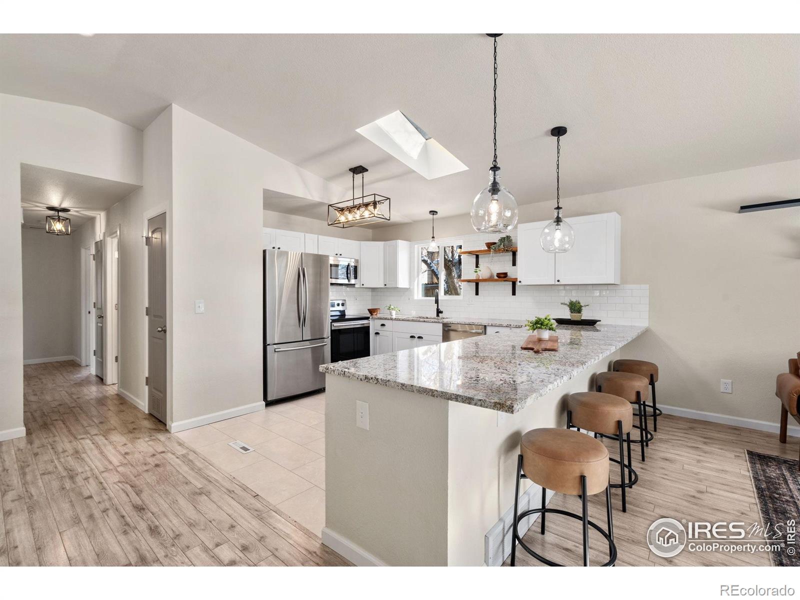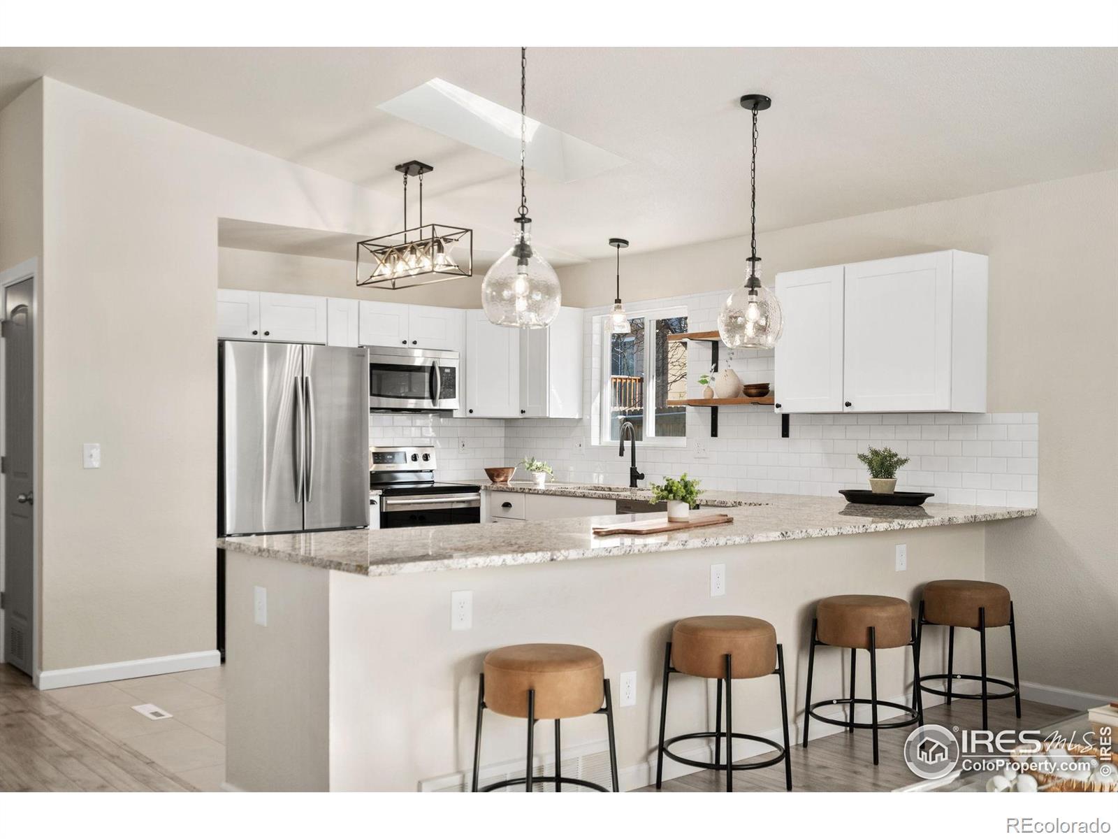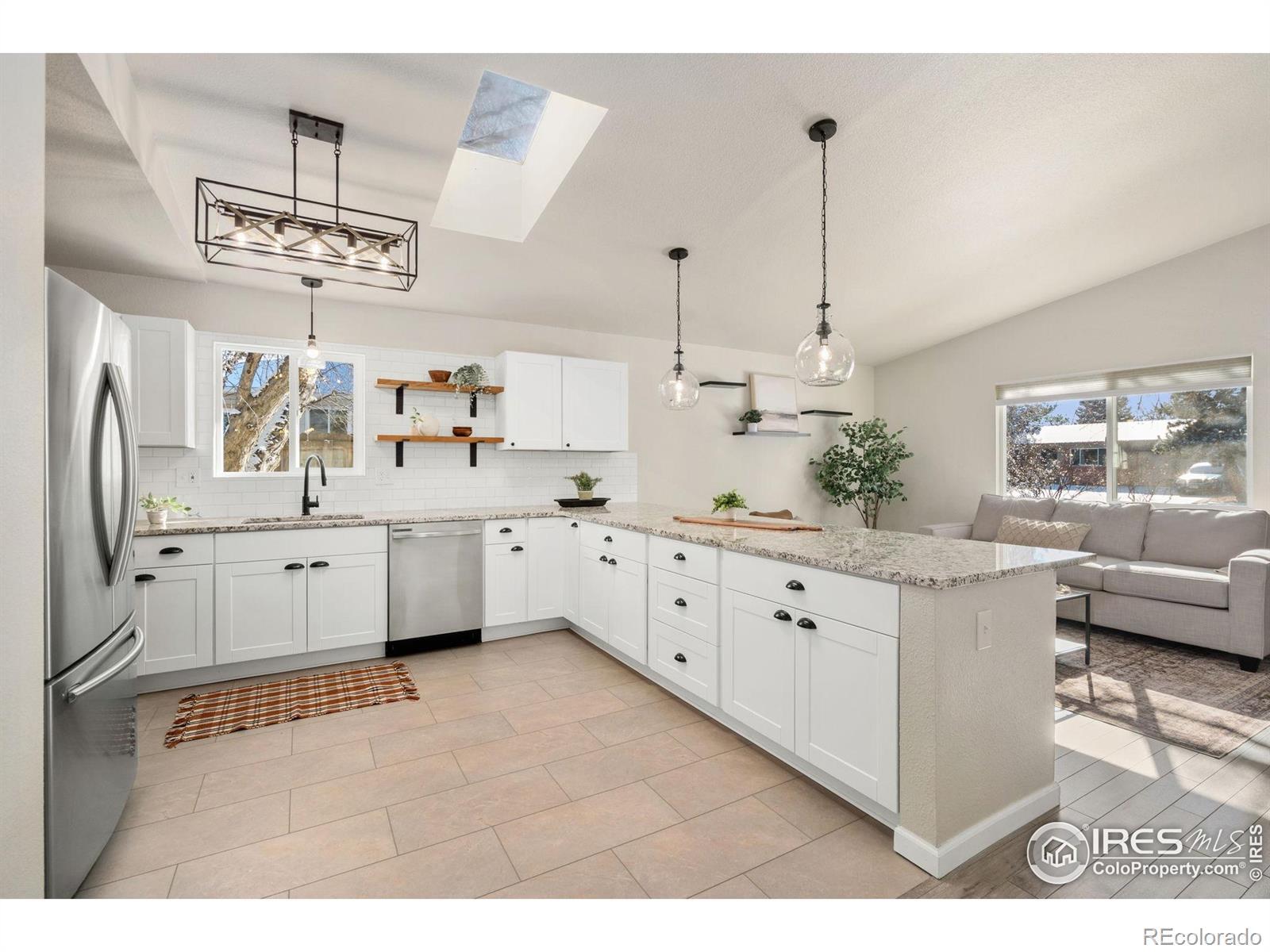 This fantastic remodeled ranch-style home features 3 bedrooms, 2 bathrooms, and a dedicated office. The interior showcases high-end finishes including granite countertops, custom white shaker cabinets, stainless steel appliances, custom subway tile backsplash, and artistic light fixtures. The home is well-maintained with newer windows, roof, furnace, water heater, and central A/C. The living room offers vaulted ceilings, a skylight, and a large window for abundant natural light, while the open floor plan and laminate flooring throughout make it perfect for entertaining. Additional features include a dining room with a barn door leading to a mudroom equipped with built-ins and a utility sink. Both bathrooms have been fully remodeled. This is a fantastic home!