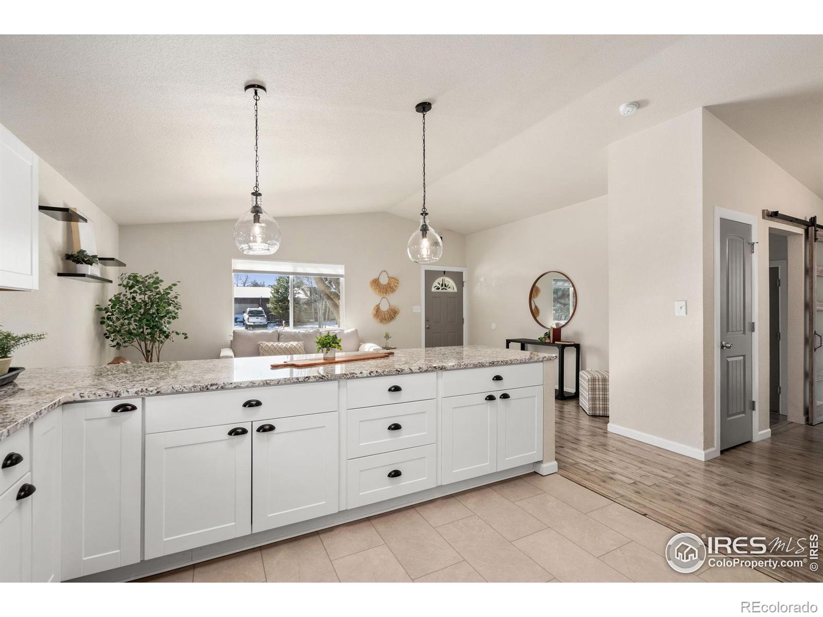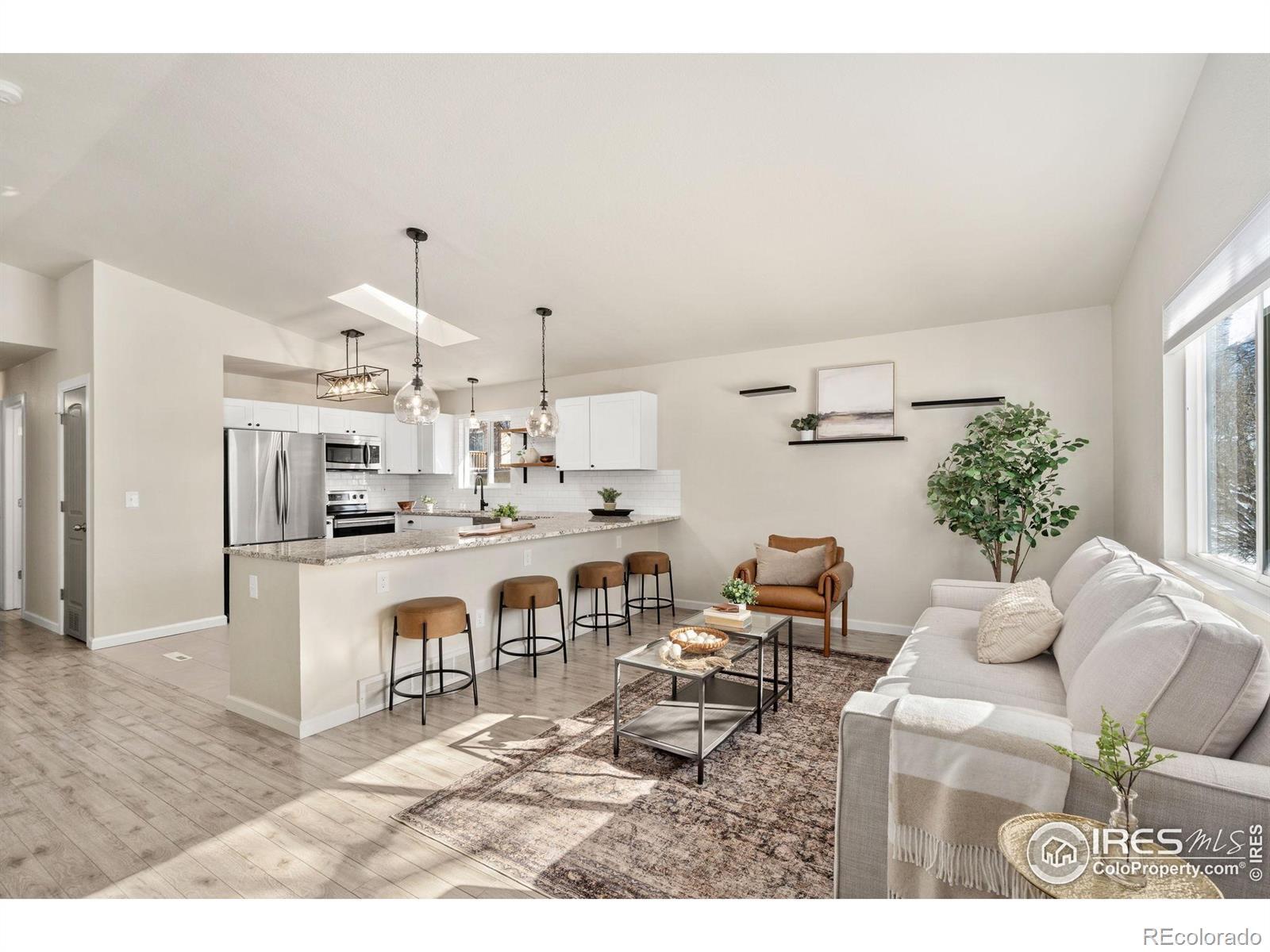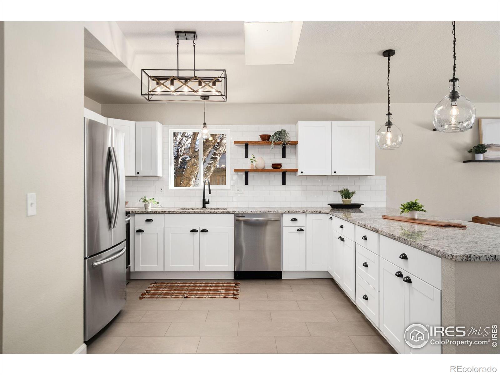 This fantastic remodeled ranch-style home features 3 bedrooms, 2 bathrooms, and a dedicated office. The interior showcases high-end finishes including granite countertops, custom white shaker cabinets, stainless steel appliances, custom subway tile backsplash, and artistic light fixtures. The home is well-maintained with newer windows, roof, furnace, water heater, and central A/C. The living room offers vaulted ceilings, a skylight, and a large window for abundant natural light, while the open floor plan and laminate flooring throughout make it perfect for entertaining. Additional features include a dining room with a barn door leading to a mudroom equipped with built-ins and a utility sink. Both bathrooms have been fully remodeled. This is a fantastic home!