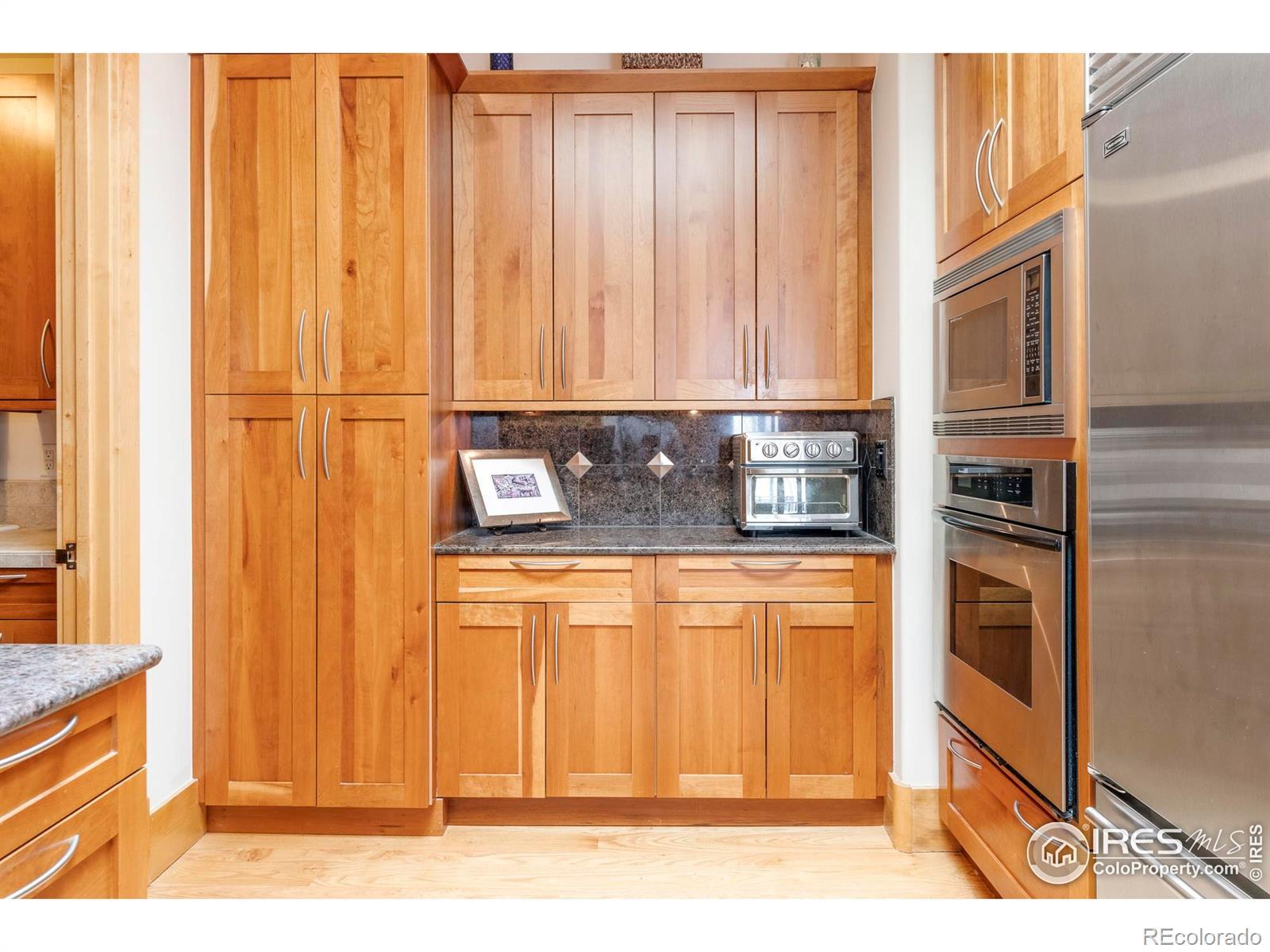 With sweeping views of Mount Sanitas and a coveted setting in the heart of Downtown Boulder, this top-floor residence delivers an elevated urban lifestyle defined by comfort, character and convenience. Located in a secure, elevator-served building at 13th and Canyon, this refined condo pairs rich traditional design with light-filled openness, highlighted by 10-foot ceilings and an airy layout. Hardwood floors lead through the living space to a gas fireplace framed by a buff sandstone surround and classic mantle, creating a warm focal point. The kitchen features stainless steel appliances, solid cherry wood cabinetry and elegant crown moldings, blending timeless craftsmanship with modern function. A Juliet balcony and large windows frame iconic Mount Sanitas views from both the living room and primary suite. Two designated parking spaces in the secure underground garage complete this rare offering, just moments from the Farmers Market, Pearl Street and Boulder's best dining, culture and trails.