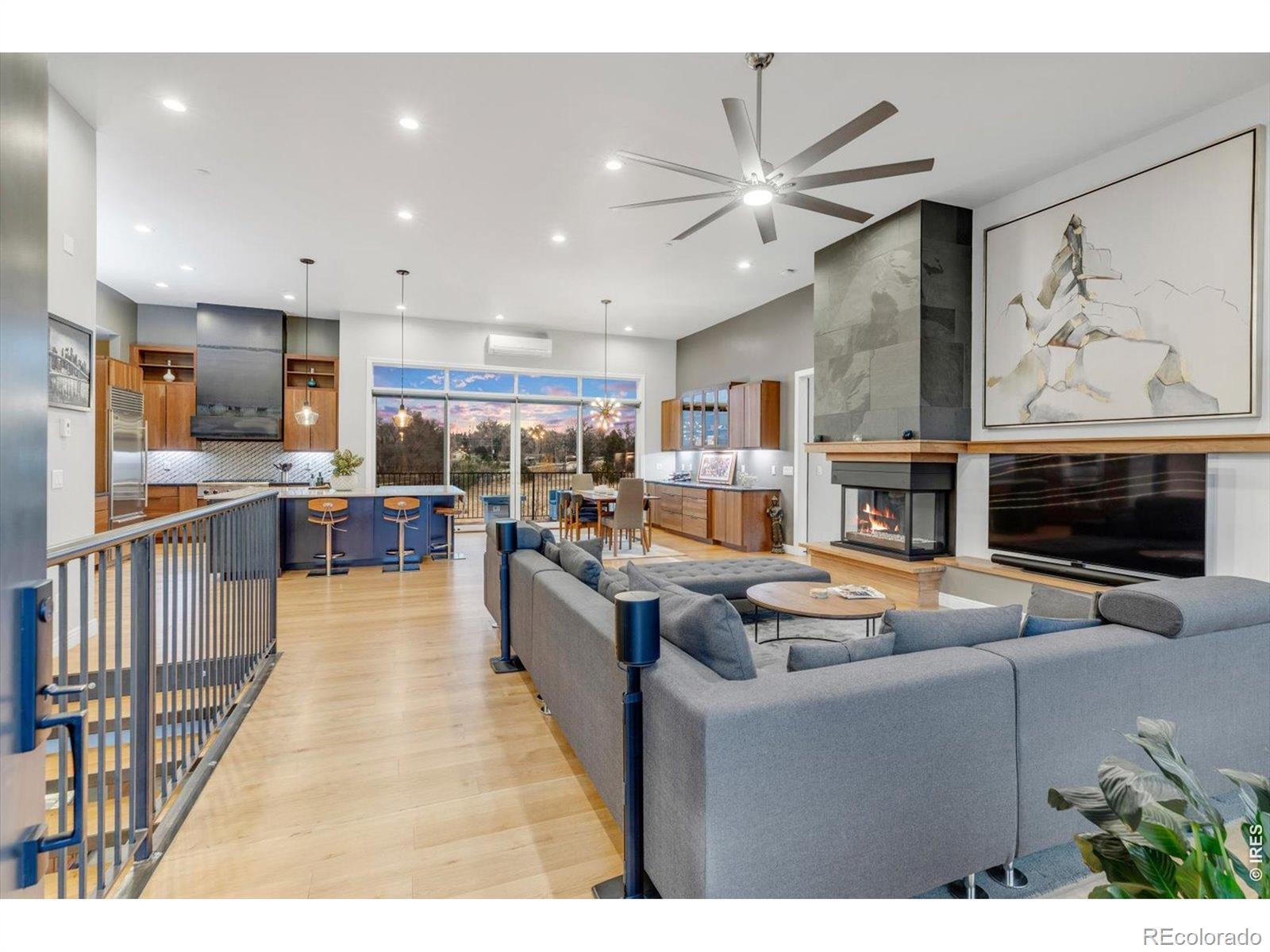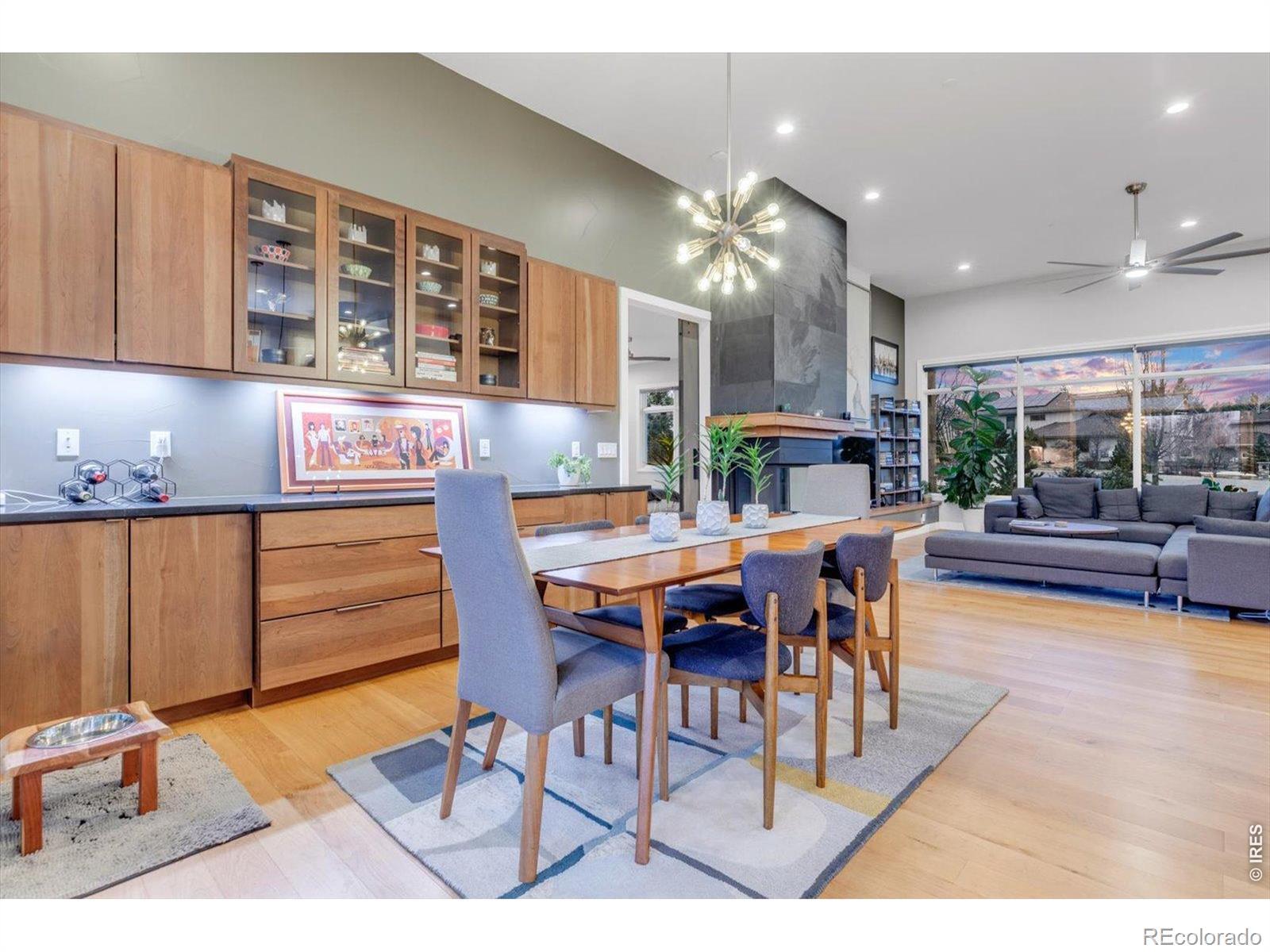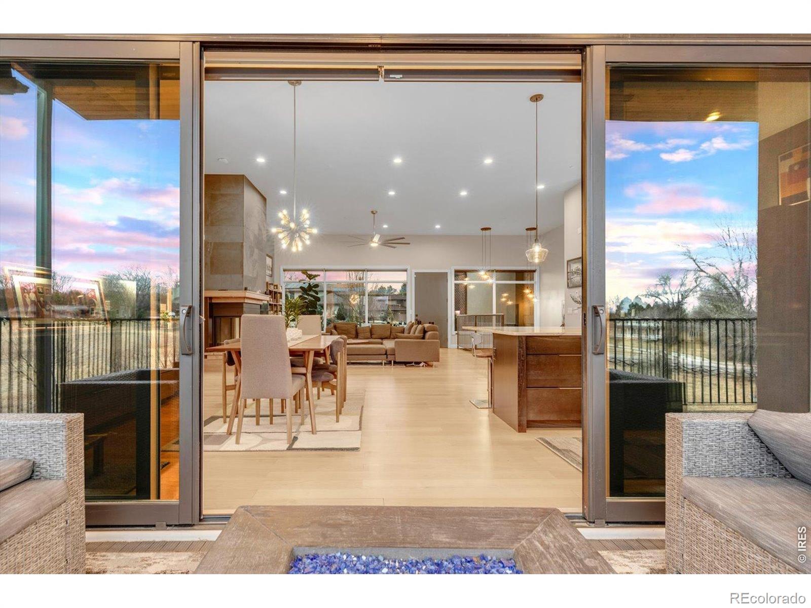 At the end of a quiet Niwot cul-de-sac, 8568 Foxhaven Drive showcases contemporary design with modern finishes, natural surroundings, and exceptional energy efficiency. This 2017 custom-built ranch offers 5,467 square feet on a 0.40-acre lot, creating a "right-sized" layout for everyday comfort and effortless entertaining.The main level features twelve-foot ceilings, natural wood and stone, industrial steel accents, and four indoor-outdoor living areas. An open, light-filled floor plan is enhanced by multi-zoned radiant floor heat, energy-efficient heating and cooling splits, automatic solar roller blinds, and UV-tinted Pella energy-rated windows.The gourmet kitchen includes Thermador and SubZero appliances, a striking single-slab Brazilian quartz island, walk-in pantry, custom steel range vent, walnut-finished cabinetry, and glass-front built-ins.The primary suite offers a spa-like ensuite with dual-head shower, oversized tub, walk-in closet, and private deck with a saline hot tub. Also on the main level are two additional bedrooms, two full baths, and a built-in work or studio space. A single step leads to the oversized, finished three-car garage with dual EV chargers and new doors.The lower level features a spacious recreation room with eight-foot sliding doors opening to a fenced, professionally landscaped yard bordering open meadow. With a kitchenette, theater room, office or play area, climate-controlled storage, and a private guest suite with dual-head steam shower, hosting is seamless.A west-facing driveway benefits from afternoon sun for easier winter maintenance. Just moments from downtown Niwot, the market, restaurants, and trails, 8568 Foxhaven is move-in ready.