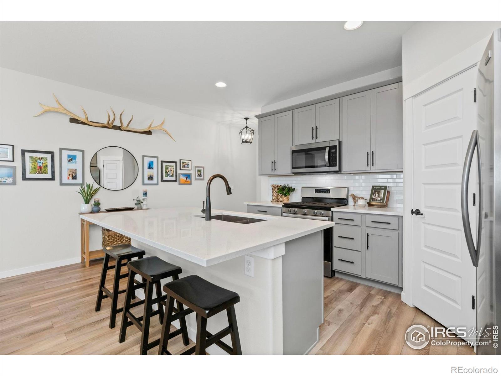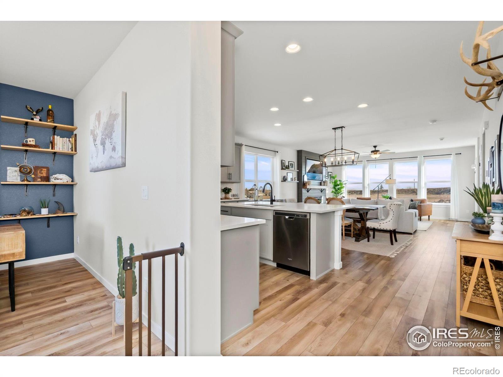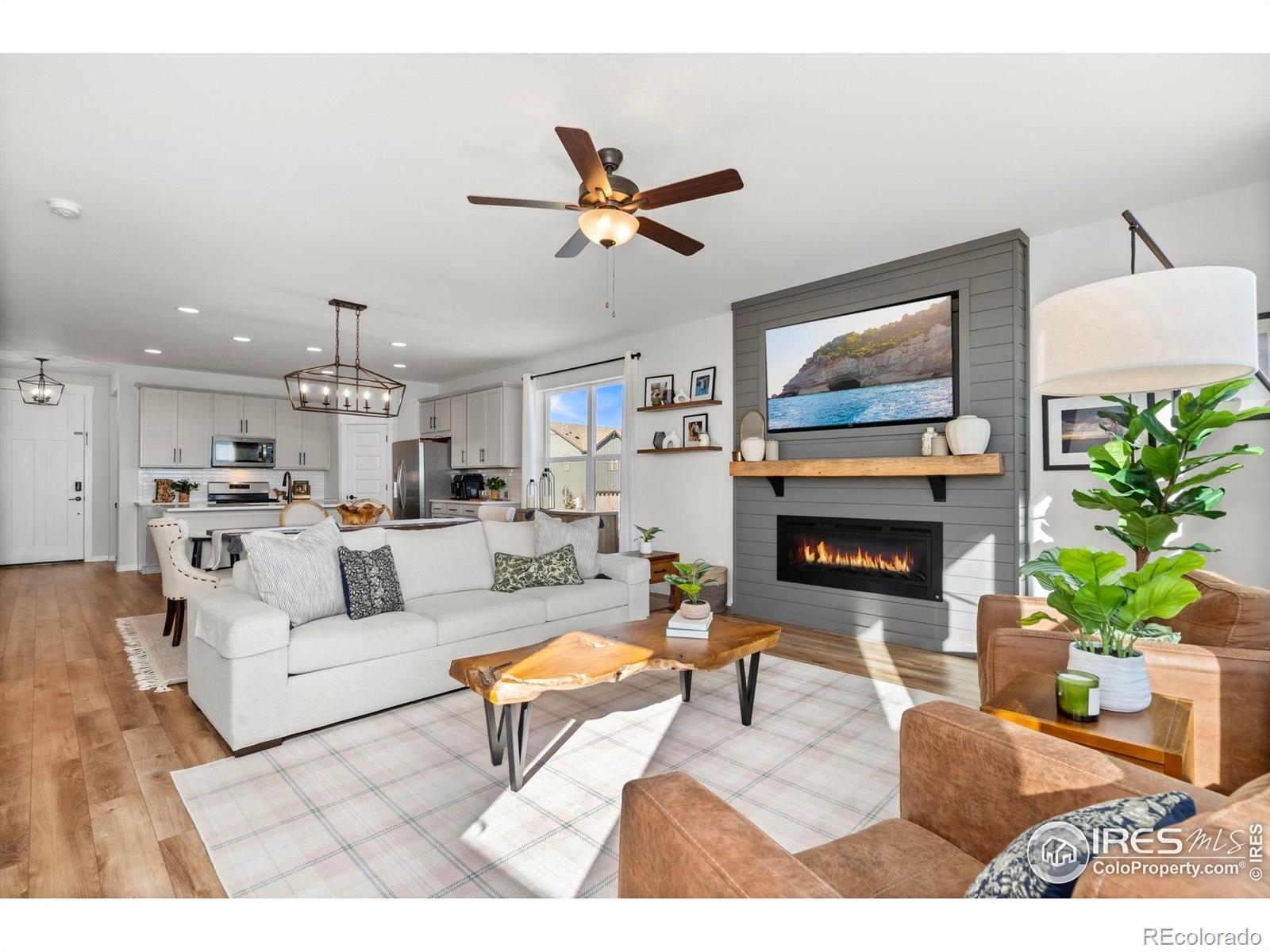 Over $50K in upgrades! This impressive home has been enhanced with tons of custom touches that give it a finished, high-end feel that easily rivals a builder's model. From the moment you step inside, the interior delivers both visual impact and everyday functionality, offering well-defined spaces that feel open and connected. The main level is filled with natural sunlight, thanks to large windows that frame the space beautifully. Window tint on the east side adds UV protection while keeping the home light-filled throughout the day. A custom fireplace and mantel in the living area create a striking focal point that instantly draws the eye. The kitchen shines with stainless steel appliances, subway tile backsplash, quartz countertops, and a center island with seating. Just off the entrance, an office area with custom shelving provides a dedicated spot for creative projects. The upper-level is a private retreat featuring a comfortable family-area loft along with three bedrooms and a convenient laundry room. The spacious primary suite stands out with its own ensuite bathroom and walk-in closet. The unfinished basement offers endless potential for expansion, with rough-ins for a bathroom and wet bar already in place to make future plans easy to bring to life. Outside, all-new landscaping creates an inviting outdoor space, complete with irrigation in both front and rear yards, raised garden beds for planting, and a fenced area to keep pets secure. Currently backing to an open area, the home also enjoys uninterrupted views of the night sky. The 3-car garage is finished with epoxy flooring, upgraded lighting, and high ceilings that provide excellent options for storage and organization. Located in Parkside Village, the home offers access to Boedecker Lake trail and is just minutes from Marianna Butte Golf Course, along with Loveland's dining, shopping, and local hotspots. Every detail here has been carefully updated to create a home that feels polished and move-in ready.