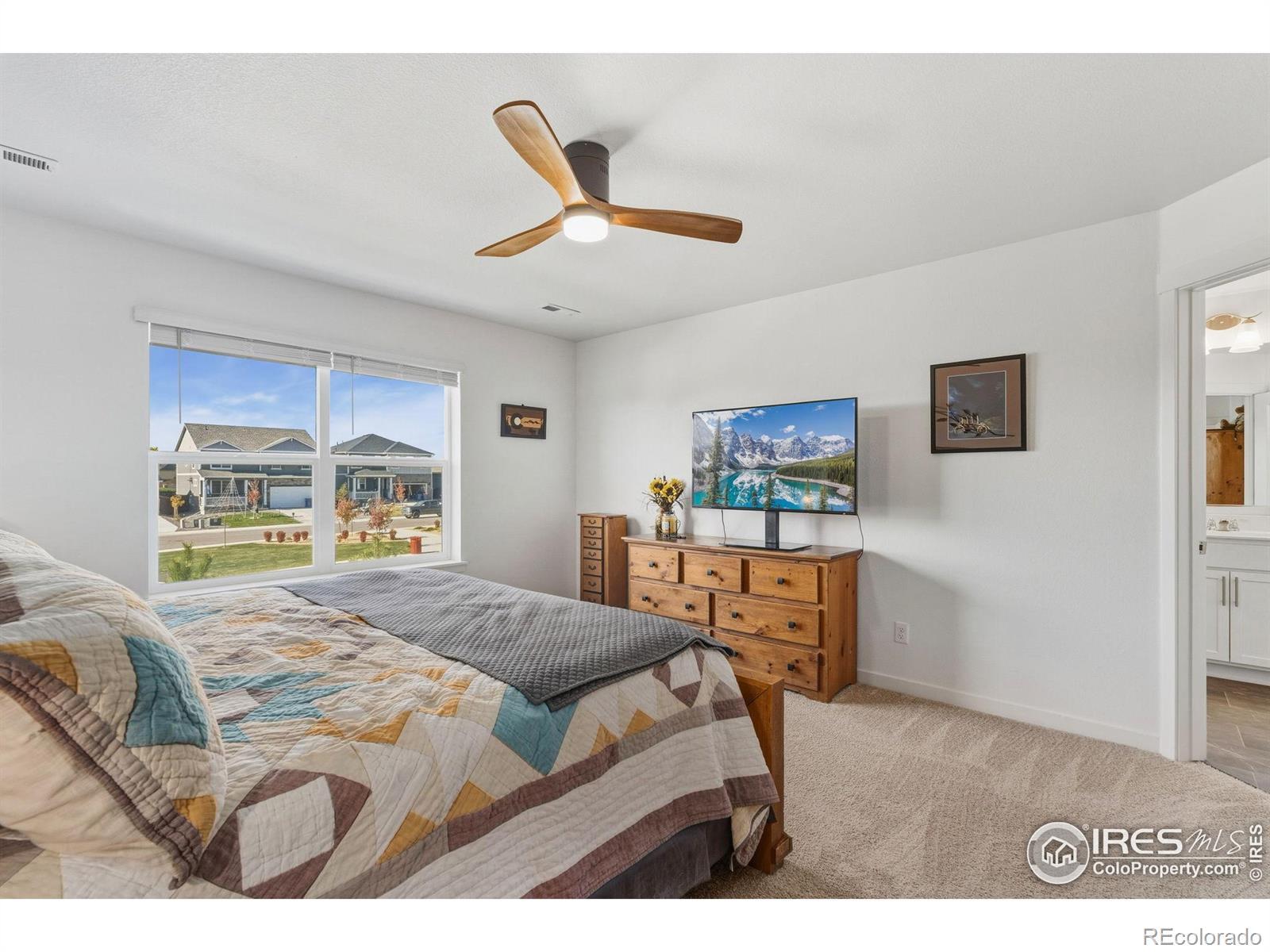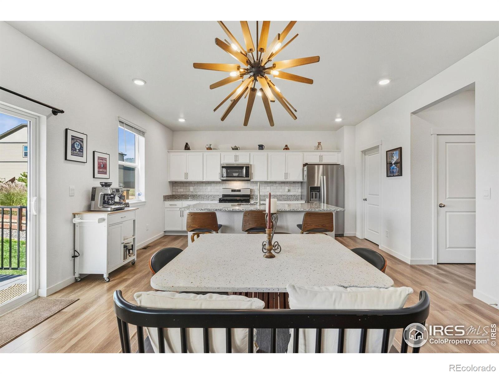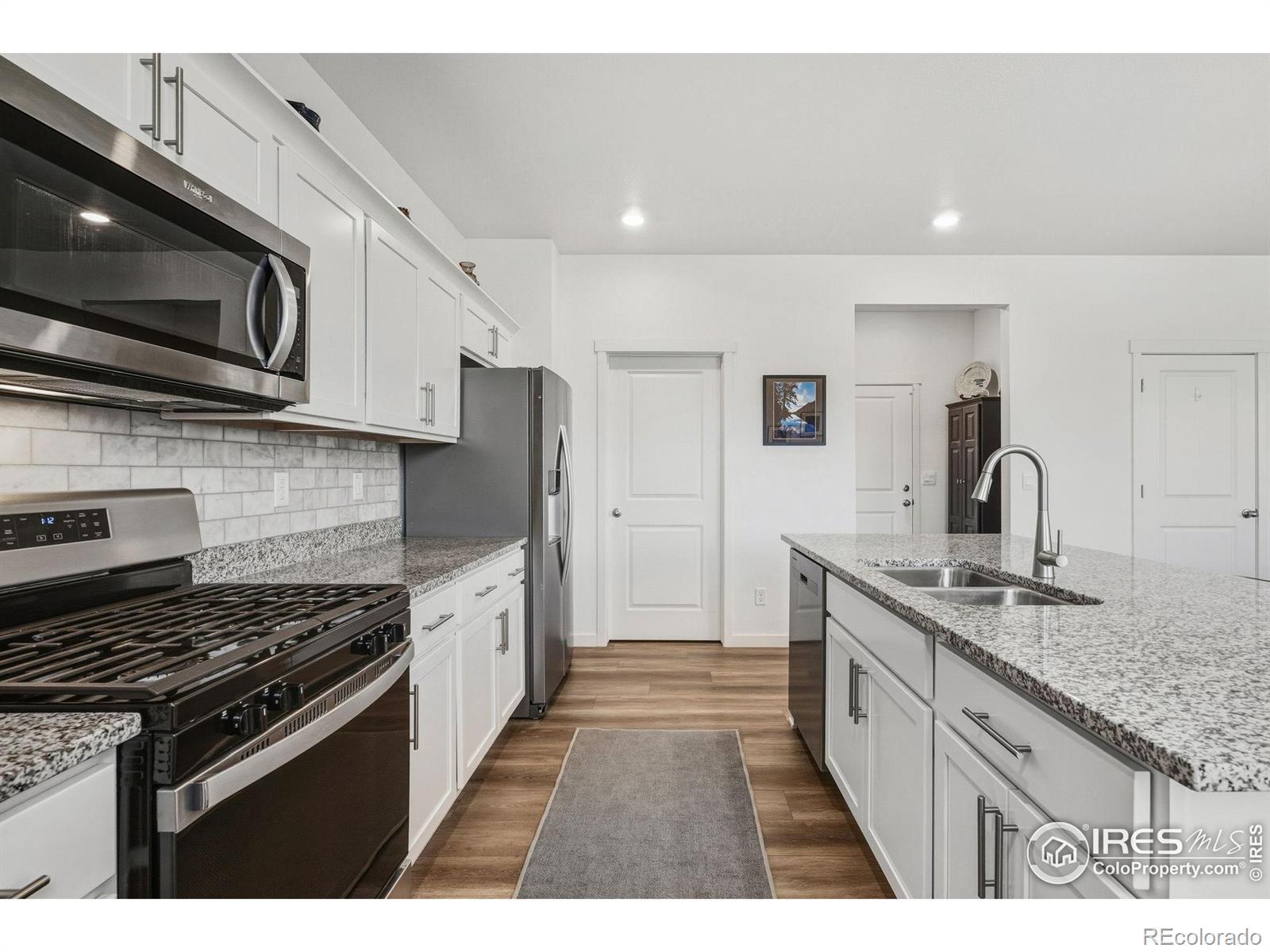 Backs to a neighborhood park + greenbelt with no rear neighbors and trail access! This 4-bed, 2.5-bath two-story blends an open Great Room with a flexible office/den on the main level and an upstairs loft for bonus living or WFH. The kitchen checks every box: granite counters, tile backsplash, a large island with double sink, walk-in pantry, Whirlpool stainless appliances and gas range, all framed by bright cabinetry. Thoughtful upgrades include a 10' 10' composite deck, fully fenced backyard, tile in all baths, fresh powder-room paint, office chair rail/accent wall, four ceiling fans, updated dining/office lighting, and a kitchen backsplash. Practical perks: central A/C, smart-home features, and a tankless water heater. Enjoy sunrise coffee on the east-facing porch and sunset dinners on the deck overlooking open space with mountain views. Minutes to I-25 and Johnstown's growing retail corridor; Woods Market (Starbucks, Freddy's, Cafe Mexicali) is just down the road. Quiet block, low-maintenance yard, spotless throughout-easy living, trail-connected, and move-in ready.