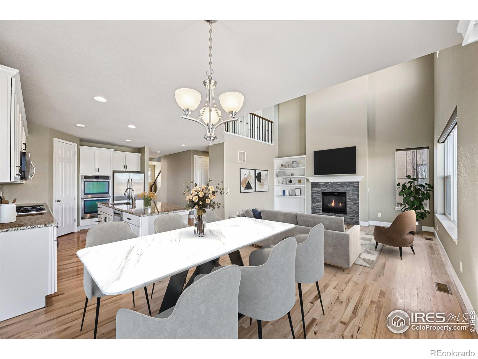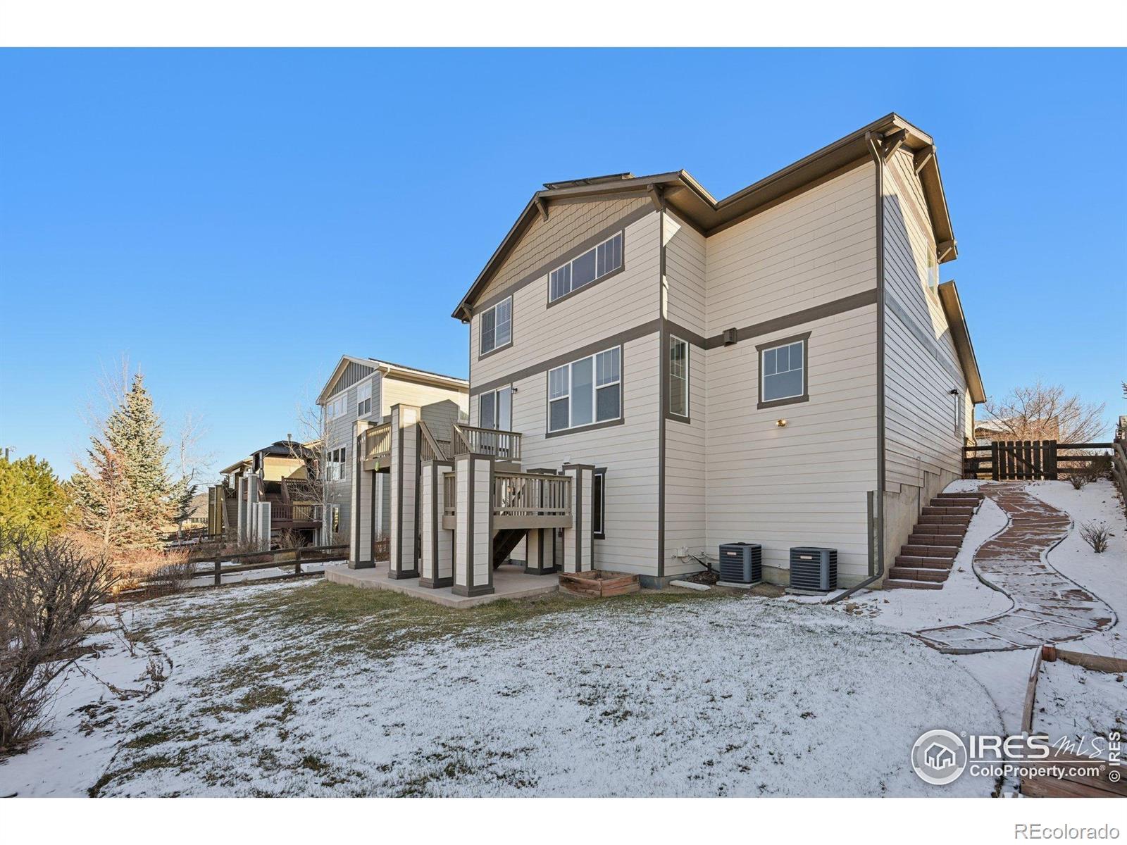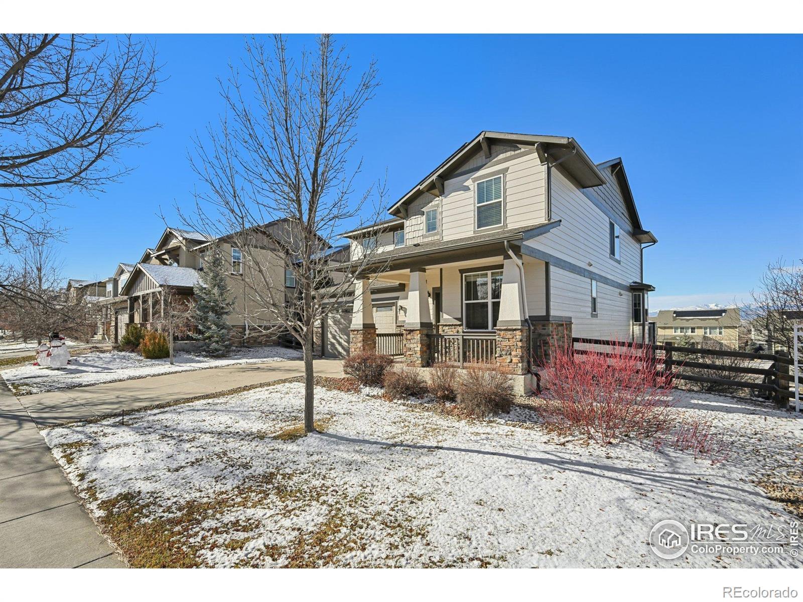 Exceptional 2 story in the desirable Flatiron Meadows community. Ideally set on a greenbelt lot, this gorgeous home blends timeless design, thoughtful upgrades and sweeping mountain views. Offering 4 beds, 4 baths, a finished walk-out basement and a 3 car garage, providing space and flexibility for today's lifestyle. Striking curb appeal welcomes you with a stone accented facade, covered front porch and manicured landscaping. Inside, rich hickory hardwood flooring and a neutral palette create a warm, inviting feel. The bright 2 story great room features expansive windows showcasing stunning Front Range views and a stacked stone gas fireplace. Gourmet kitchen is a chef's delight, designed for both daily living and entertaining, with slab granite countertops, large island with breakfast bar seating, 42" cabinetry, mosaic tile backsplash, stainless steel appliances with a gas cooktop and double ovens and a generous pantry. The dining area with bay windows flows seamlessly to the deck, perfect for enjoying sunsets and snow capped mountain scenery. French glass doors off the foyer open to a private office. Upstairs, a versatile loft offers additional living space, along with 3 good sized bedrooms and a convenient laundry room with utility sink. The spacious primary suite features a raised tray ceiling, a 5-piece bath with soaking tub, walk-in shower, dual vanities and a custom walk-in closet. Finished walk-out basement expands your living options with a large family/rec room and access to a covered patio and landscaped backyard. With no neighbors directly behind, enjoy open space, privacy, and mountain views. Walk-out also includes a large bedroom, full bath and ample storage. Upgrades galore, owned solar panels, high-efficiency dual HVAC systems, and a drywalled 3 car tandem garage. Short walk to the elem. school, trails leading to parks and lakes. Only minutes to shopping, dining and retail. The ideal combination of location, lifestyle and views. See Virtual 3-D tour.