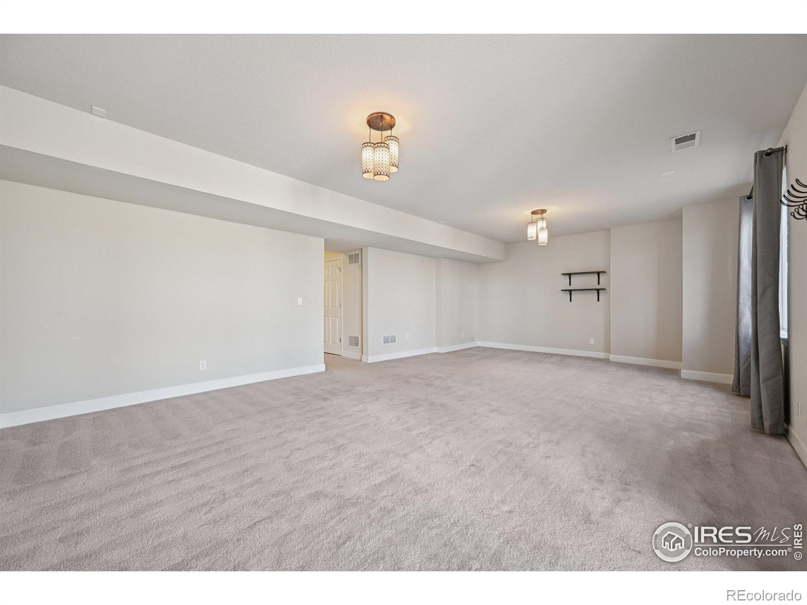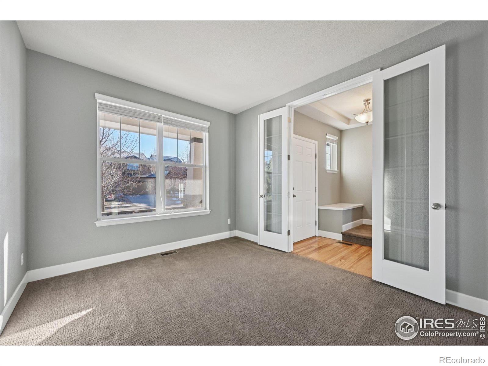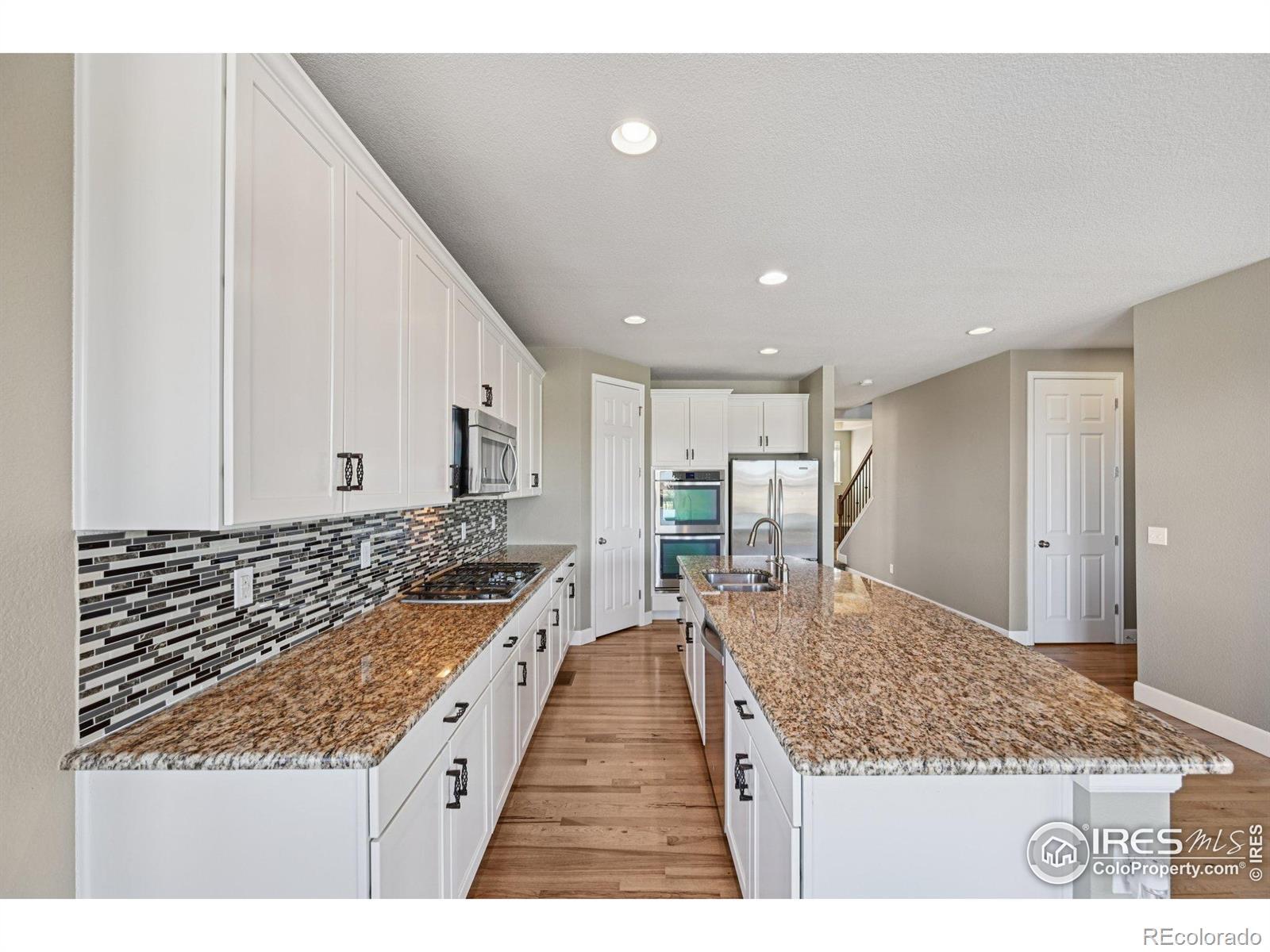 Exceptional 2 story in the desirable Flatiron Meadows community. Ideally set on a greenbelt lot, this gorgeous home blends timeless design, thoughtful upgrades and sweeping mountain views. Offering 4 beds, 4 baths, a finished walk-out basement and a 3 car garage, providing space and flexibility for today's lifestyle. Striking curb appeal welcomes you with a stone accented facade, covered front porch and manicured landscaping. Inside, rich hickory hardwood flooring and a neutral palette create a warm, inviting feel. The bright 2 story great room features expansive windows showcasing stunning Front Range views and a stacked stone gas fireplace. Gourmet kitchen is a chef's delight, designed for both daily living and entertaining, with slab granite countertops, large island with breakfast bar seating, 42" cabinetry, mosaic tile backsplash, stainless steel appliances with a gas cooktop and double ovens and a generous pantry. The dining area with bay windows flows seamlessly to the deck, perfect for enjoying sunsets and snow capped mountain scenery. French glass doors off the foyer open to a private office. Upstairs, a versatile loft offers additional living space, along with 3 good sized bedrooms and a convenient laundry room with utility sink. The spacious primary suite features a raised tray ceiling, a 5-piece bath with soaking tub, walk-in shower, dual vanities and a custom walk-in closet. Finished walk-out basement expands your living options with a large family/rec room and access to a covered patio and landscaped backyard. With no neighbors directly behind, enjoy open space, privacy, and mountain views. Walk-out also includes a large bedroom, full bath and ample storage. Upgrades galore, owned solar panels, high-efficiency dual HVAC systems, and a drywalled 3 car tandem garage. Short walk to the elem. school, trails leading to parks and lakes. Only minutes to shopping, dining and retail. The ideal combination of location, lifestyle and views. See Virtual 3-D tour.