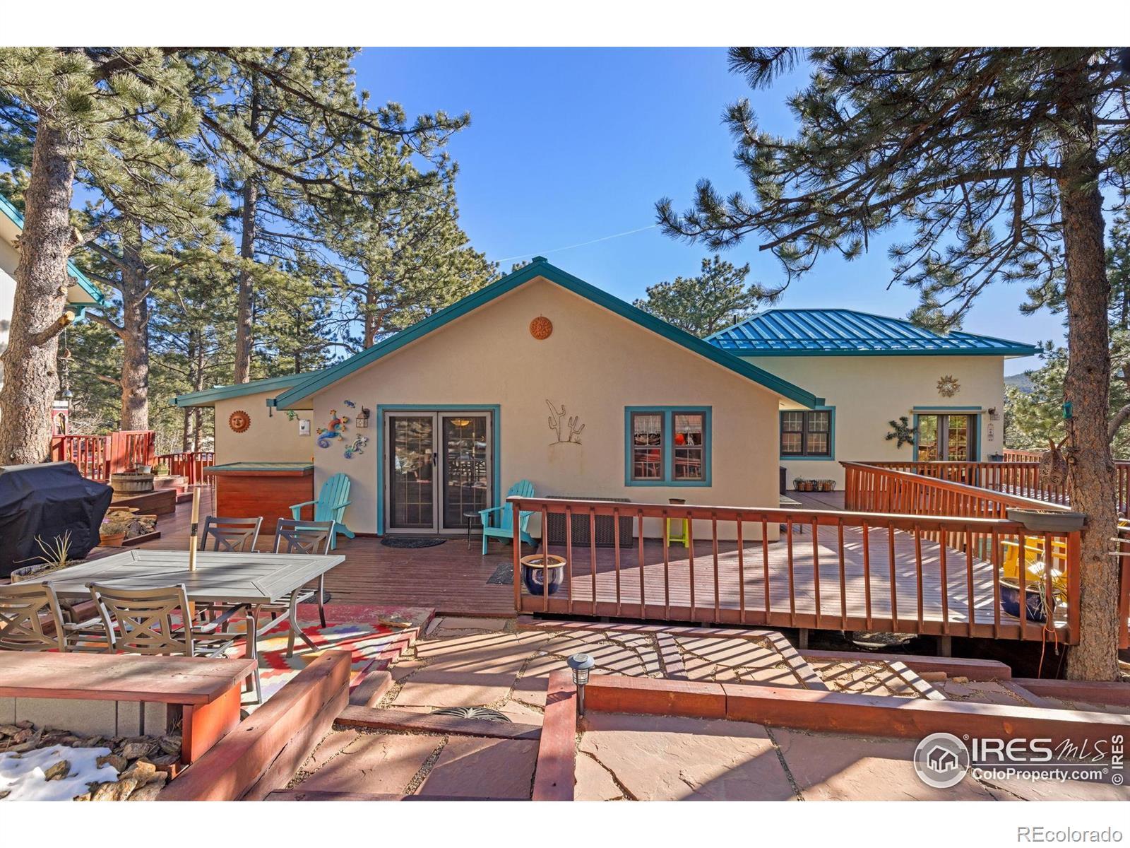Immaculately maintained and beautifully updated, this refreshed stucco home is nestled in the charming mountain town of Nederland, CO, offering a rare balance of peaceful mountain living coupled with excellent walkability to local amenities. Set on a fully fenced .52-acre lot, this property is drenched in southern sun, surrounded by mature Ponderosa pines, sweeping mountain views and enchanting water views of Barker Reservoir. Town-maintained roads lead to this serene, tucked-away neighborhood, where a paved driveway and an impressive 870 SF detached garage welcome you. Inside, the fully remodeled residence blends modern convenience with original charm and an expanded floor plan that provides thoughtful separation of space, sun-filled rooms and a warm, inviting atmosphere. The updated kitchen features Corian countertops, custom cabinetry and SS appliances, opening to the dining area ideal for entertaining. The living room showcases a striking stone fireplace with wood floors leading to a spacious primary suite with vaulted ceilings, south-facing windows, private ensuite bath and walk-in closet. A 2nd ensuite bedroom rounds out the main level. Downstairs find another generous-sized ensuite bedroom offering exceptional privacy with an adjacent large office and laundry room that includes ample storage and walkout access to the yard. Outdoor living shines with a wraparound deck, garden spaces, landscaping, fire pit, and a dedicated dining and bar area perfect for summer gatherings and mountain evenings. Added peace of mind and insurability with fire mitigation already completed, a stucco exterior and metal roof still under warranty. Enjoy the ease of in-town living without sacrificing privacy or natural beauty, just 5 miles from Eldora Ski Resort and close to numerous nearby trailheads. Plenty of available storage including the oversized detached garage + a separate shed. Effortless mountain living in a fully turnkey home, only 15 scenic miles from Boulder!