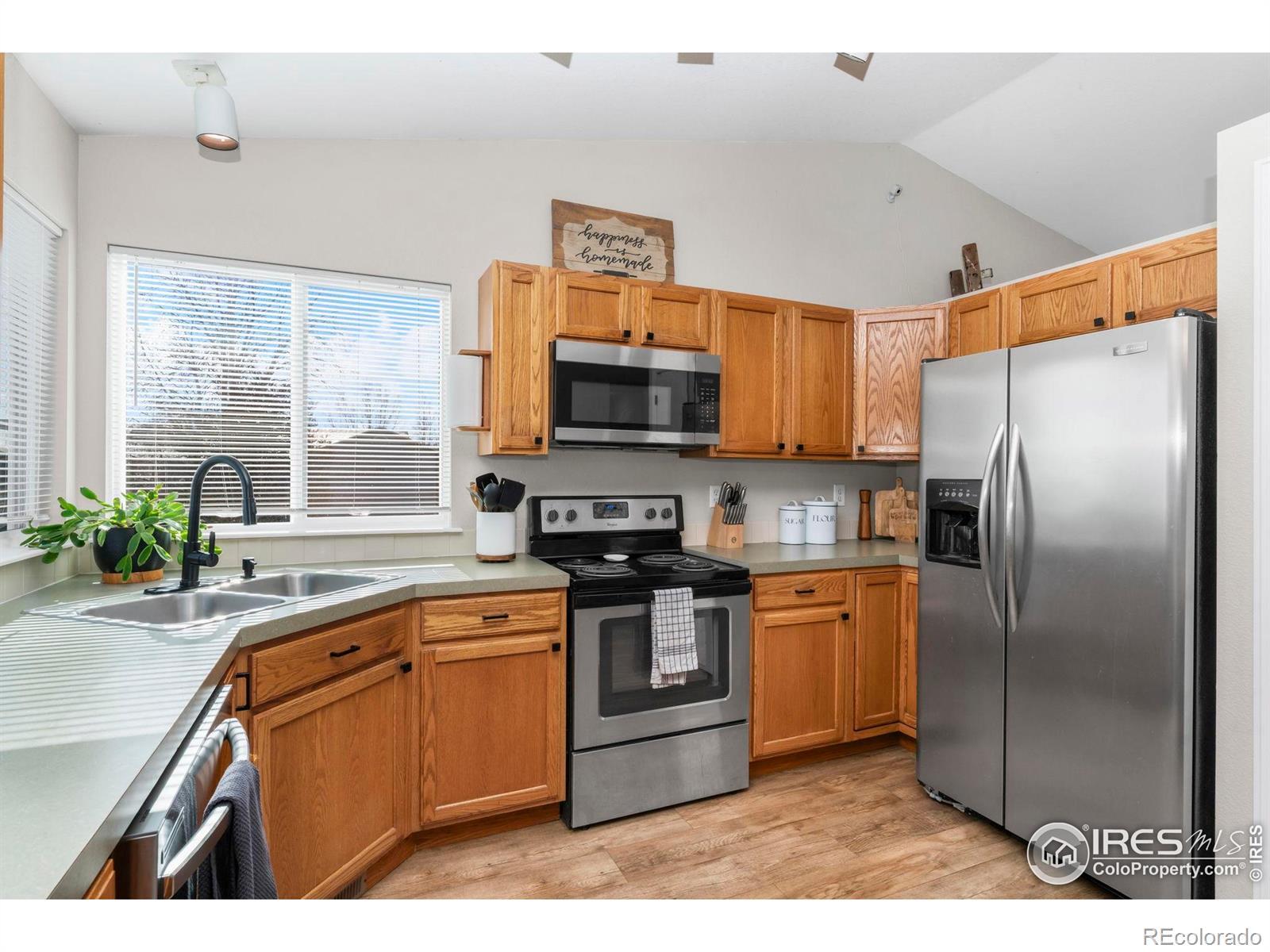 UPDATED open ranch floor plan with vaulted ceilings and abundant natural light! This well-maintained home features extensive recent upgrades, including a new roof, full HVAC system, new windows, and fresh exterior paint. Additional improvements include an extended concrete driveway for extra parking, new microwave and dishwasher, and all new faucets, toilets, carpet, interior paint, and door hardware. Enjoy newer luxury vinyl flooring throughout and a new sliding glass door that opens to a 300-square-foot deck and fully fenced backyard, perfect for entertaining or relaxing outdoors. The spacious primary suite offers a private bath and walk-in closet, while main-floor laundry adds everyday convenience. The 1,088-square-foot basement includes 4th non-conforming bedroom of which is 75% complete, excellent storage and future expansion potential. A 2-car attached garage with a new garage door opener completes the package. Located in a well-established neighborhood, one block from park and NO HOA, this move-in-ready home is a fantastic opportunity!