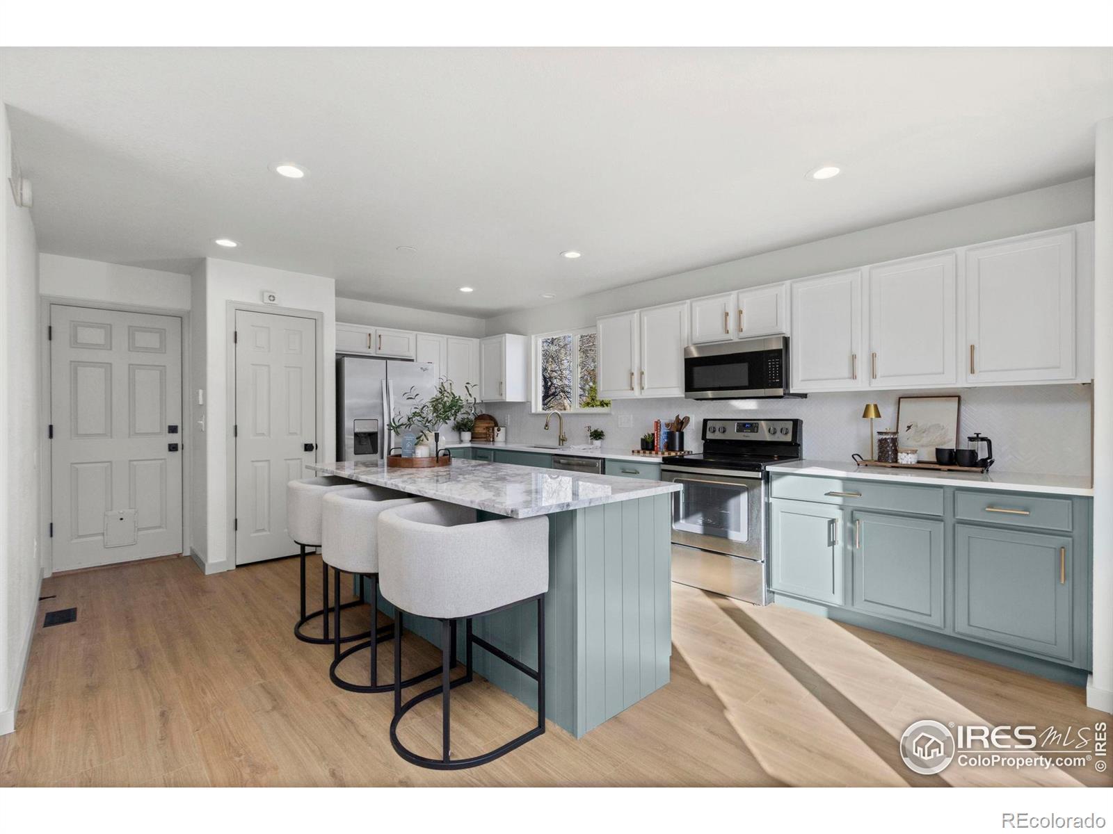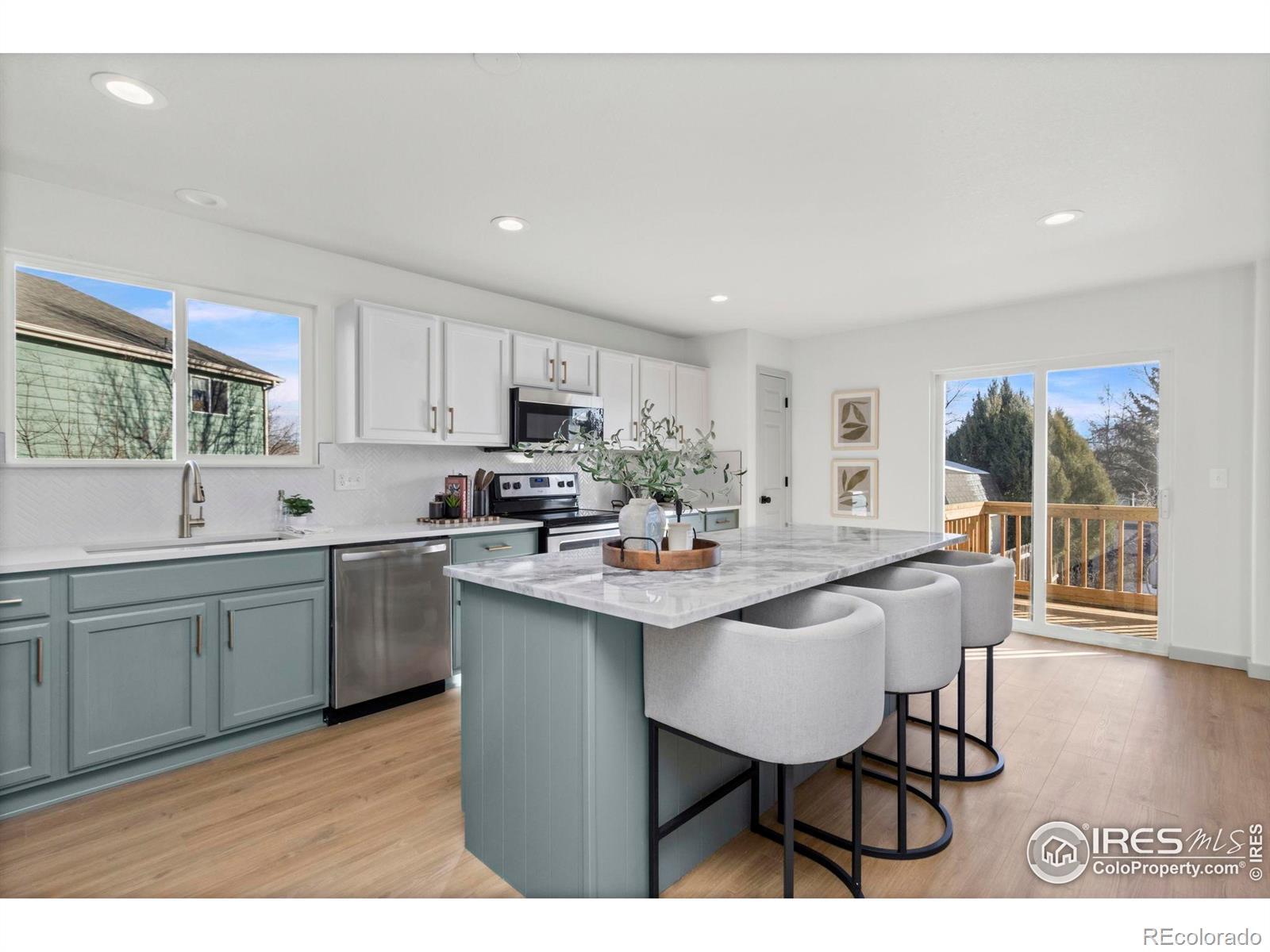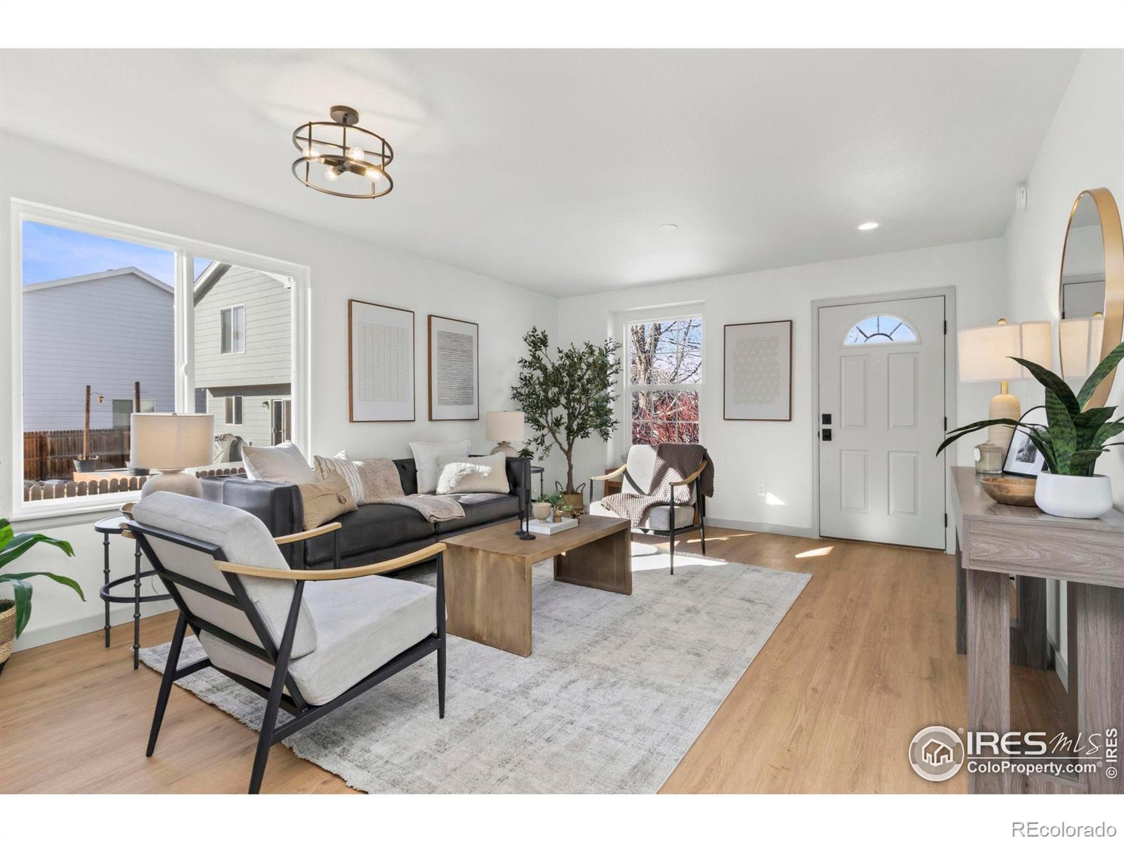 Tucked away on a quiet cul-de-sac in Loveland, this beautifully updated two-story home is warm, welcoming, and completely move-in ready, featuring a brand new roof + brand new furnace for comfort and peace of mind from day one! Sunlight fills the home, highlighting new luxury vinyl plank flooring, fresh interior and exterior paint, updated hardware, and charming modern light fixtures that create a cozy yet contemporary feel. The oversized kitchen is the heart of the home, offering stainless steel appliances, quartz countertops, generous prep space, and a show stopping solid slab granite island! A layout perfect for hosting friends or enjoying everyday moments. All bathrooms have been fully remodeled with stylish tile, modern vanities, and updated fixtures, adding a fresh, clean look throughout. Just a few of the MAJOR upgrades include new windows, a brand new roof, and a brand new furnace, making this home as efficient as it is adorable! Downstairs, the garden-level unfinished basement provides excellent natural light and endless potential for future living space, a home gym, office, or additional storage. Your blank canvas! Outside, enjoy a new deck, raised planter boxes, and a fully fenced backyard with irrigation system, ideal for summer evenings, gardening, and weekend gatherings. Located close to parks, shopping, dining, and local amenities, this home offers the perfect blend of charm, privacy, and modern updates. A truly turn-key Loveland home that's cute, comfortable, and ready to be loved!