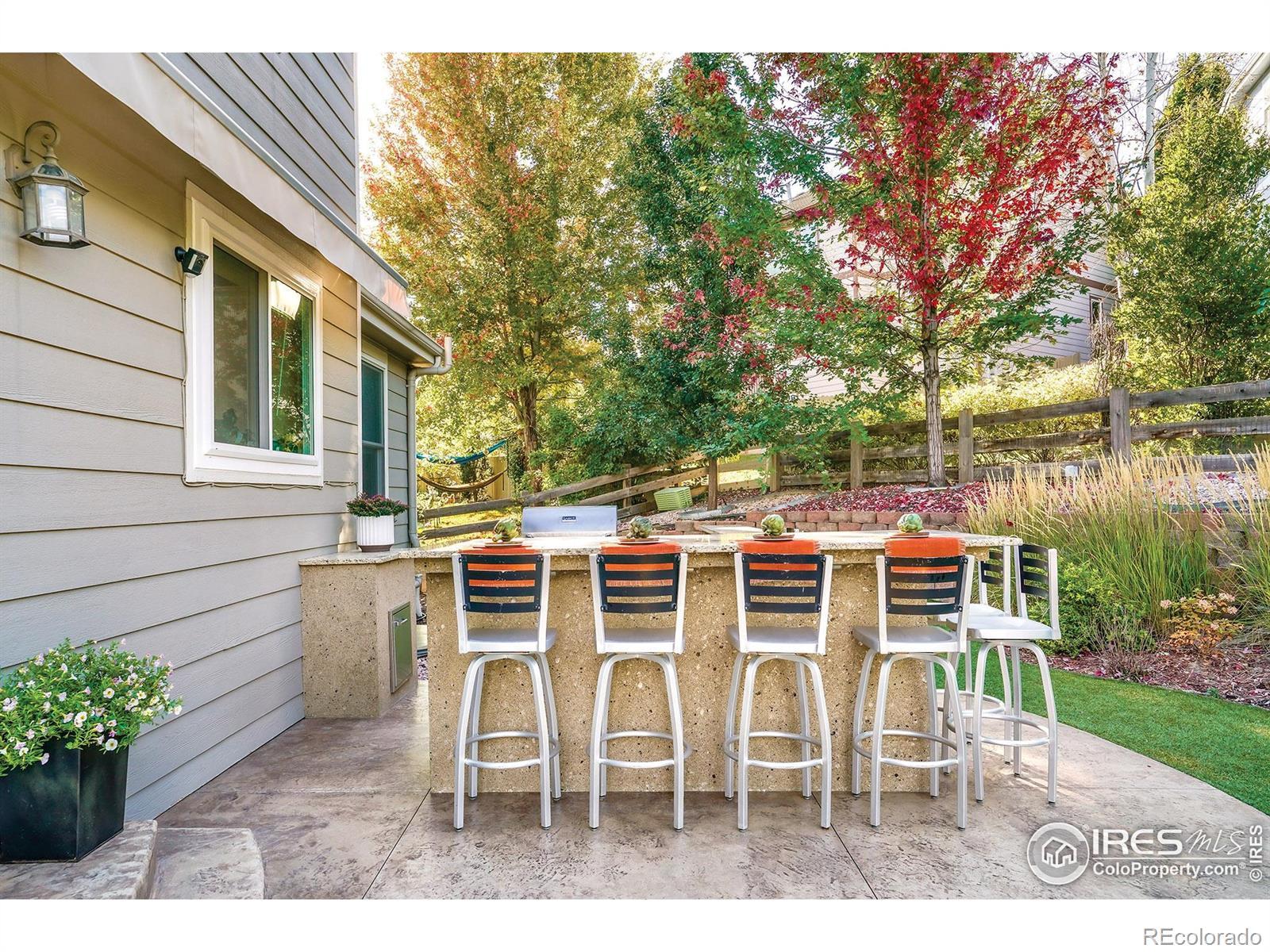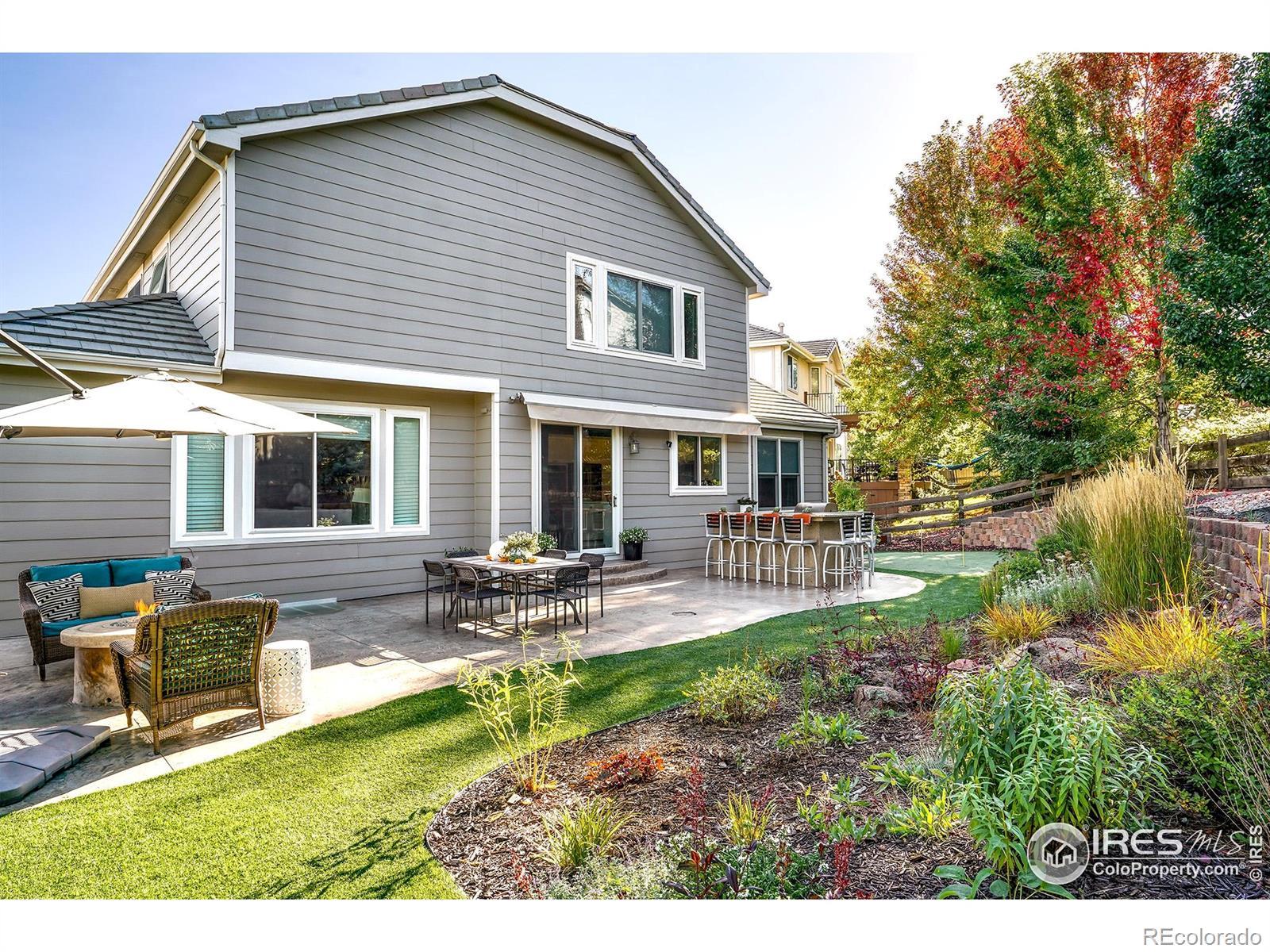 Radiant from the outside in, this ideally situated residence crafts a sensational lifestyle. Sleek curb appeal flows inward to a formal sitting room and dining area with vaulted ceilings. Full bath and main level bedroom can function as a convenient guest retreat or sunny office. The beautifully updated kitchen inspires culinary creativity with quartz countertops, an eat-in area and seamless patio access. Continue the soiree outdoors, where an outdoor living space features a kitchen, bar, fire pit, retractable awning, stamped concrete patio + putting green. A true gardener's delight with perennial gardens and the peaceful sounds of a custom year-round water feature. Upstairs, a generous primary suite showcases mountain views and an updated, spa-like bath with a soaking tub. Three additional bedrooms and a full bath complete this luminous layout. Retreat to an entertainer's lower level to find ample space for entertaining with a pool table, standalone bar, tv area, workout space and a 6th bedroom. Green features include newer energy efficient windows, owned solar panels and two Tesla power walls (providing up to two days of power during power outages). The spacious 3-car garage is equipped with an EV car charger + wiring in place for an additional charger. This vibrant, connected community offers easy access to scenic trails, community pools, restaurants and shopping.