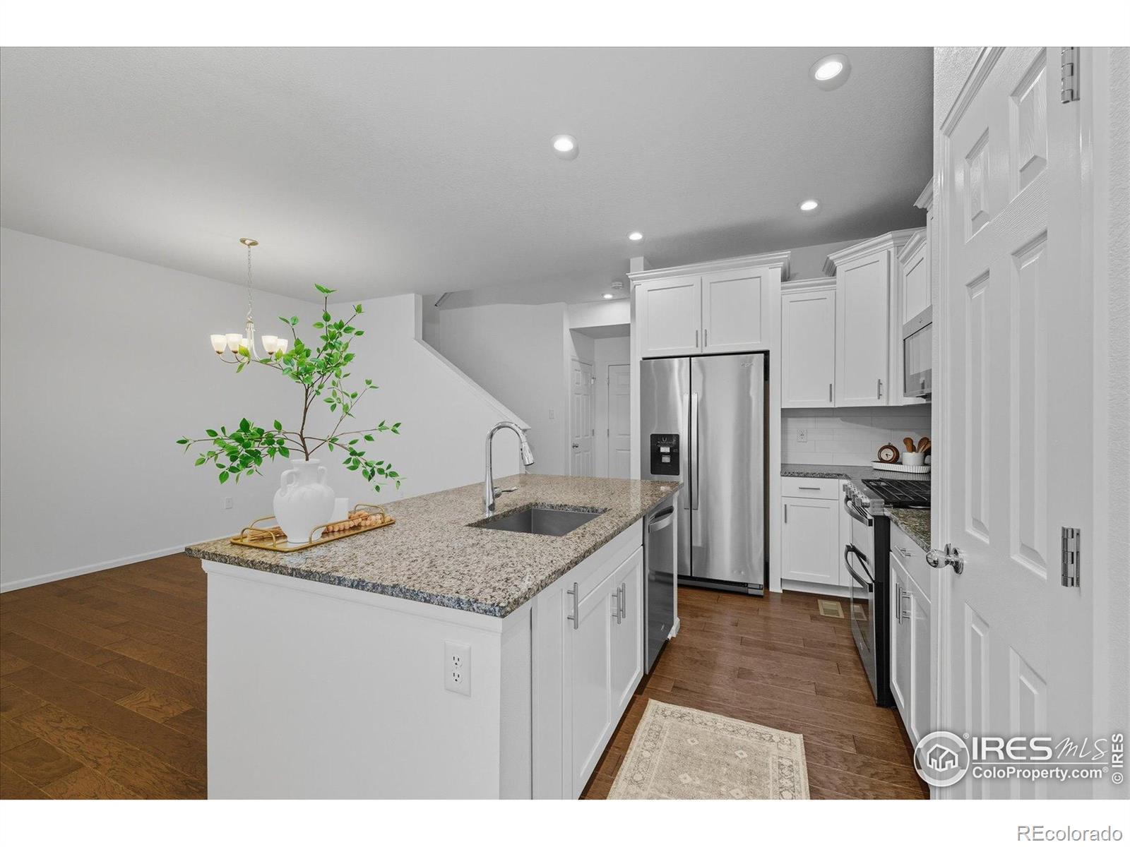 Step into effortless living at this charming Creekside townhome at 93 Jackson Lane, 3 bed, 2.5 bath with timeless Craftsman style. Enjoy a bright kitchen with white cabinets, subway tile, granite island, engineered hardwoods, and smart outlets. Private primary suite (no shared walls!) with a walk-in closet and upstairs laundry. Outside: Fenced, shady courtyard patio for BBQs, with mature landscaping and steps from trail access. HOA covers it all from new roof (2024), fresh paint (2025), landscaping, snow removal. Low utilities (tankless H2O heater), current insurance just $87/mo. Oversized 2-car garage + off-street parking with no building behind offering extra parking and green space. Prime location: Walk to elementary school, parks, near Old Town Erie, trails, recreation center, library and more. But talk about added value, walkable to future Erie Town Center (retail, grocer, restaurants)! No metro tax! Warrantable. Bring a roommate, build wealth!