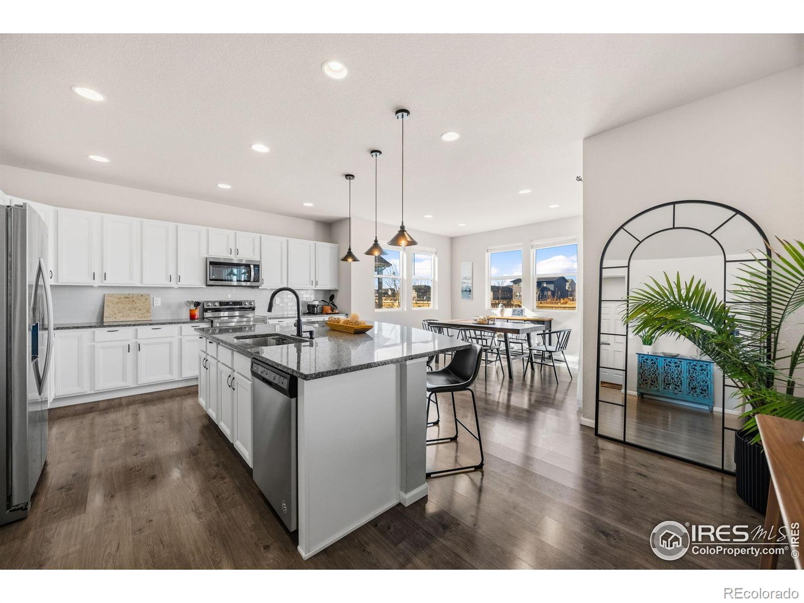 Beautifully maintained 3-bedroom, 2-story home filled with natural light and thoughtful updates throughout. The heart of the home is the stunning kitchen, featuring stainless steel appliances, an expansive granite island, and abundant cabinetry-perfect for everyday living and entertaining. The open dining area flows seamlessly into the inviting family room with a cozy fireplace, creating a warm and welcoming space.Upstairs, you'll find all three bedrooms, including a spacious primary suite with a full bath, along with a conveniently located laundry room. The full unfinished basement offers 9-foot ceilings and endless potential for future expansion or storage.Step outside to enjoy the new covered patio and refreshed landscaping, all within a fully fenced backyard-ideal for relaxing evenings, outdoor dining, and taking in Colorado's beautiful sunset views. With generous indoor and outdoor living spaces, this home is move-in ready and offers room to grow. Don't miss the opportunity to make it yours!