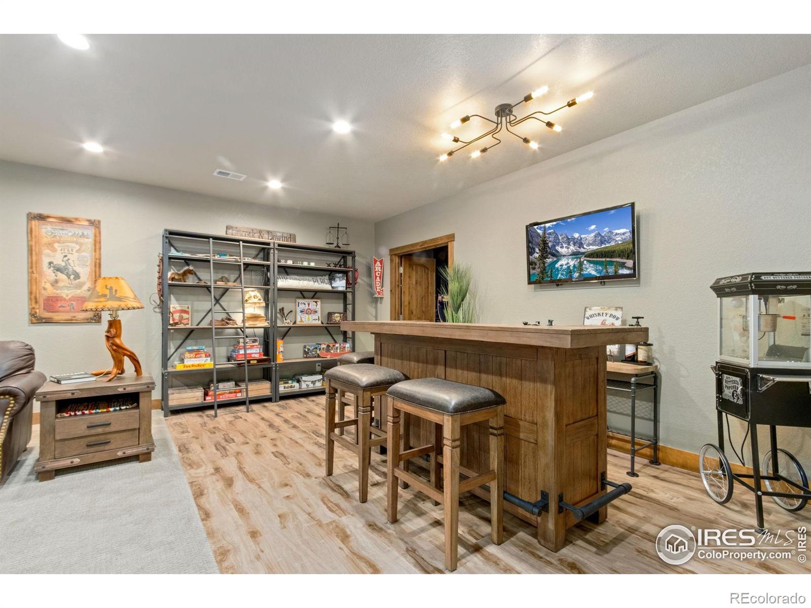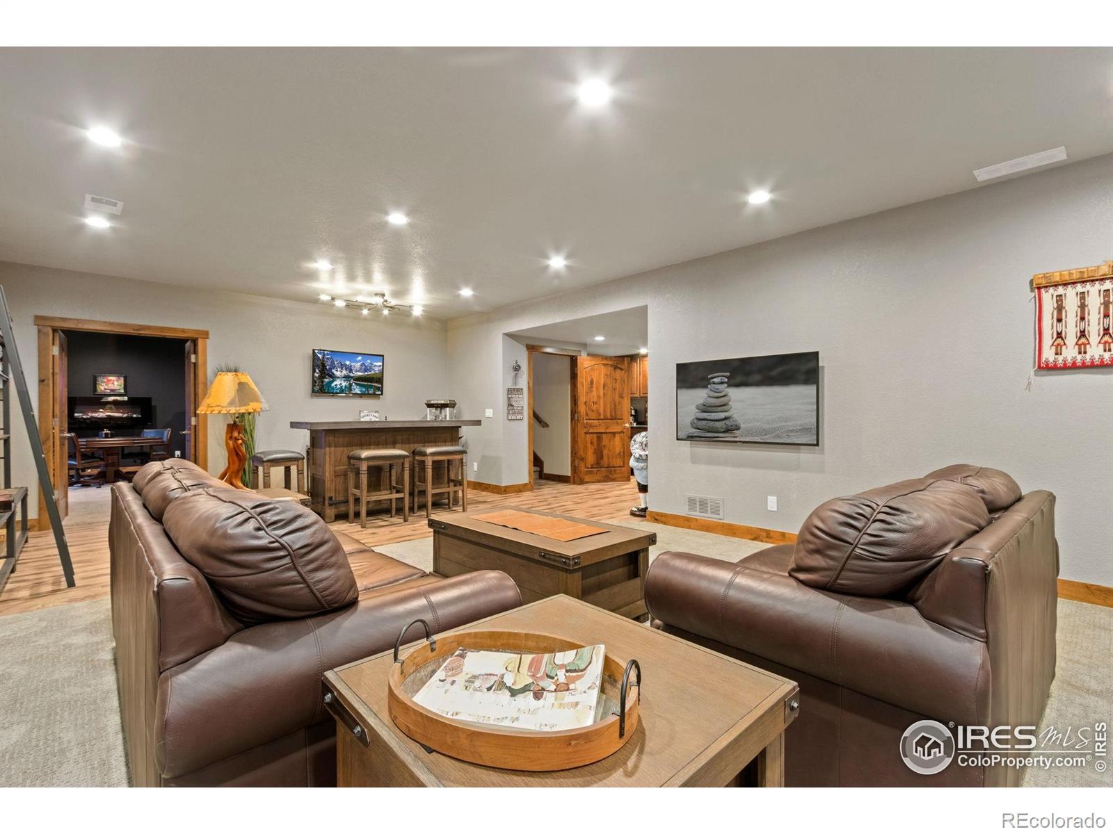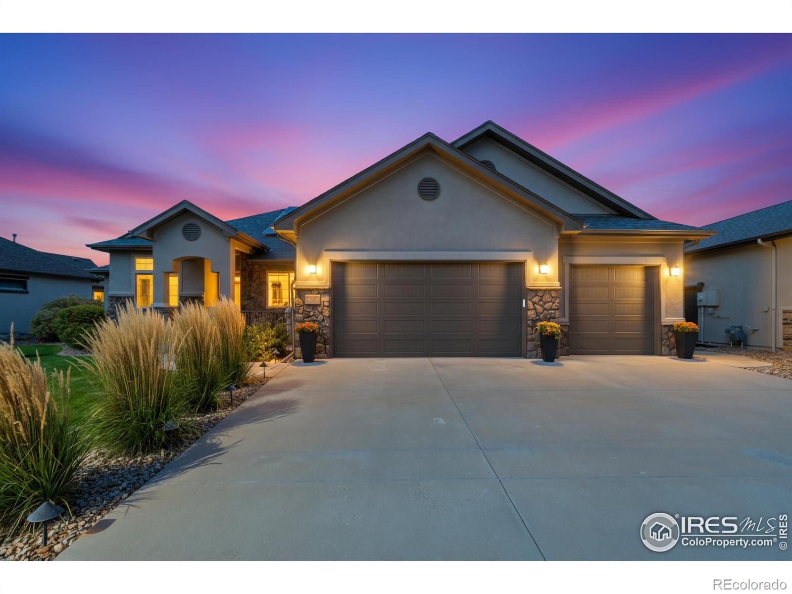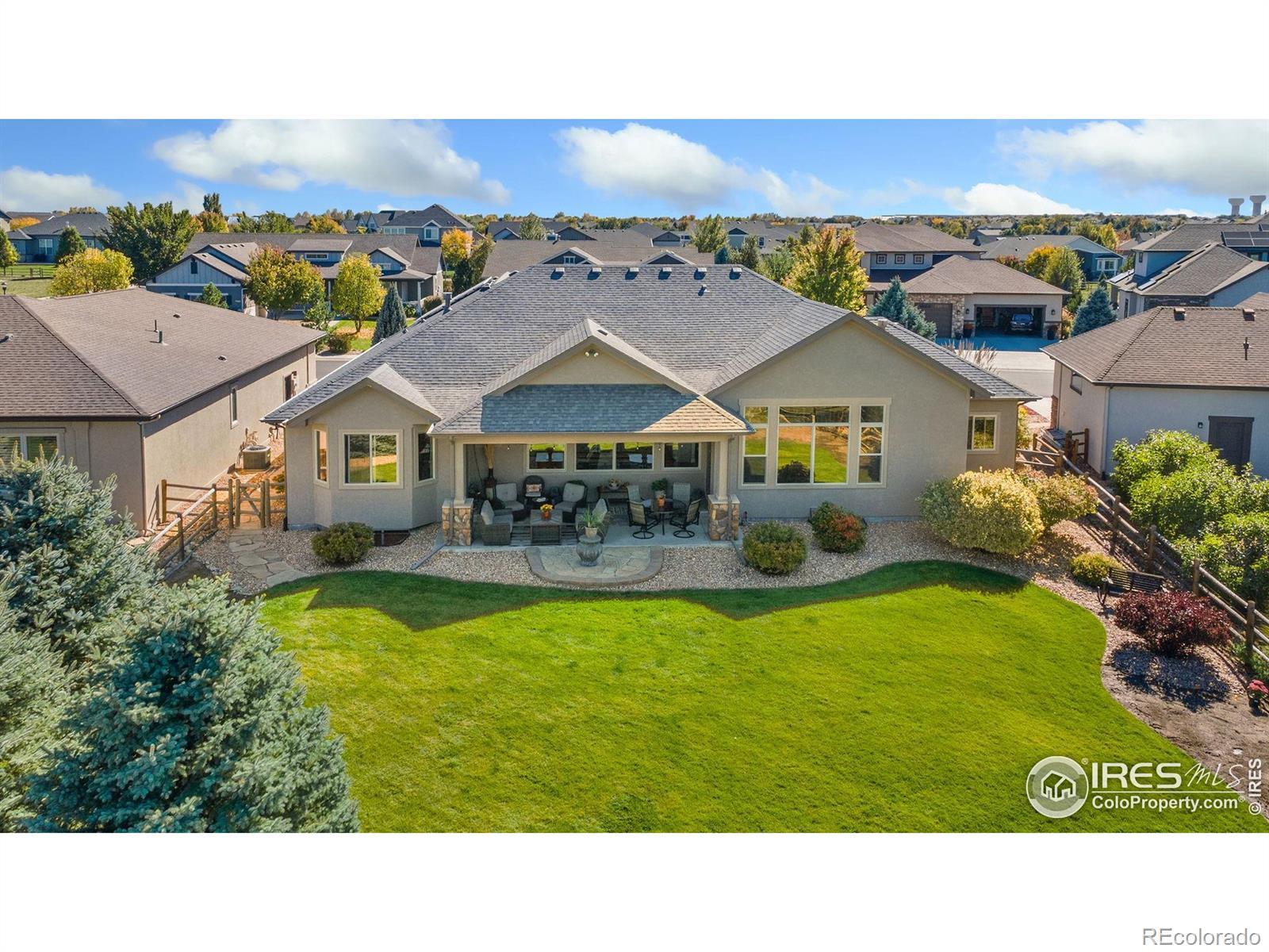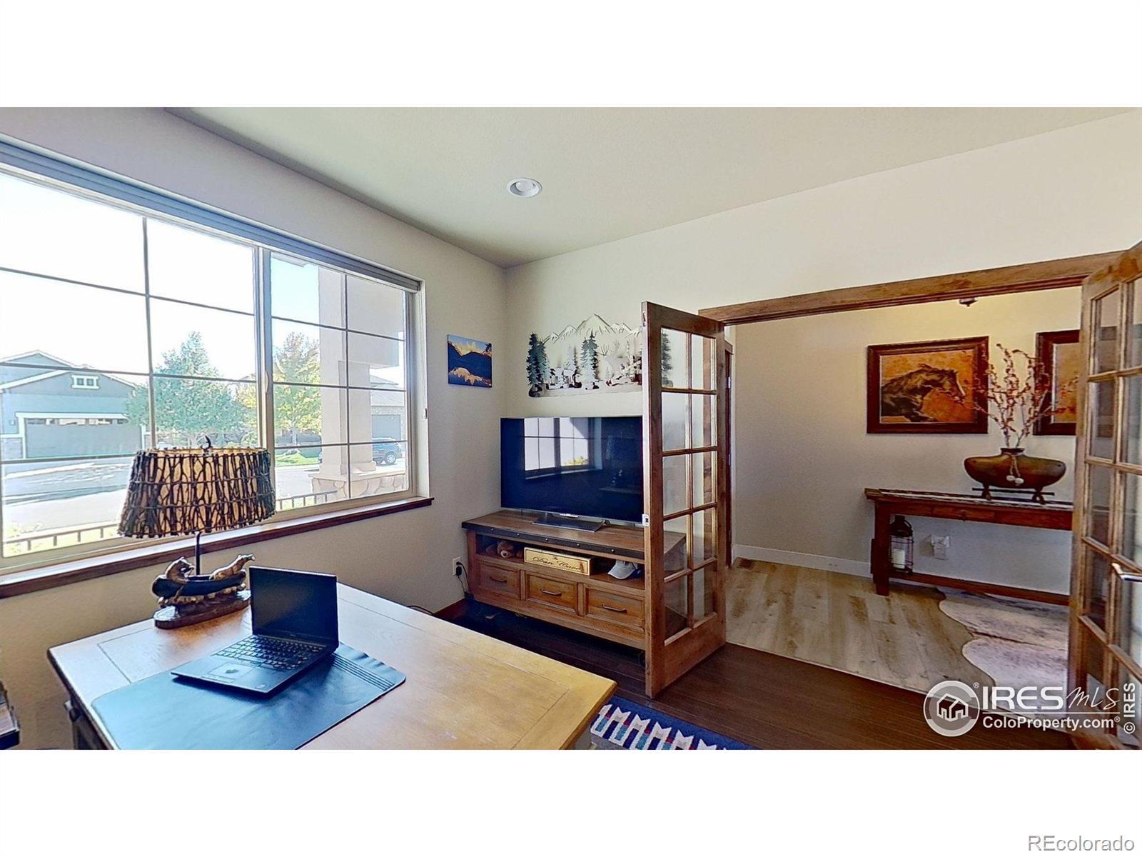 This impressive home in Highpointe is a showstopper packed with thoughtful upgrades, high-end features, and modern comforts for a truly move-in-ready experience. Sitting on more than a quarter-acre, this property welcomes you with a professionally landscaped yard that backs to open space and wonderful mountain views. Inside, you'll find a beautifully designed open floorplan with brand new LVP flooring and large windows that bathe every corner in natural light. The living area features vaulted ceilings and a stunning stacked stone electric fireplace, perfectly complemented by a mounted 65-inch TV and Sonos soundbar that stay with the home for a complete entertainment setup. The spacious kitchen showcases new and upgraded cabinets enhanced by under-cabinet lighting, stainless steel appliances including a new LG refrigerator, a kitchen island, and extensive prep space and storage. The split-bedroom layout on the main level offers ideal privacy, with the primary suite featuring tray ceilings, a cozy double-sided fireplace that connects to the luxurious 5-piece ensuite bath, a walk-in closet, and private access to the covered patio. A dedicated office by the entrance provides the ideal space for remote work or study. The finished basement is the ULTIMATE entertainment hub, complete with a spacious recreation area that includes a wet bar with a kegerator and a dry bar, plus two large guest suites currently used as hobby rooms. Premium-grade furnaces recently installed and a Owned solar system ensures energy efficiency and comfort year-round. The oversized 3-car garage is well-equipped with tool pegboards and a workbench, making it a perfect space for projects and storage as well. Just a few blocks away, you'll find the community amenities, including an outdoor pool and clubhouse. Excellent biking and trekking trails near by. Minutes from downtown, major highways, shopping, and dining, this home offers both comfort and luxury in one of Windsor's premier neighborhoods.