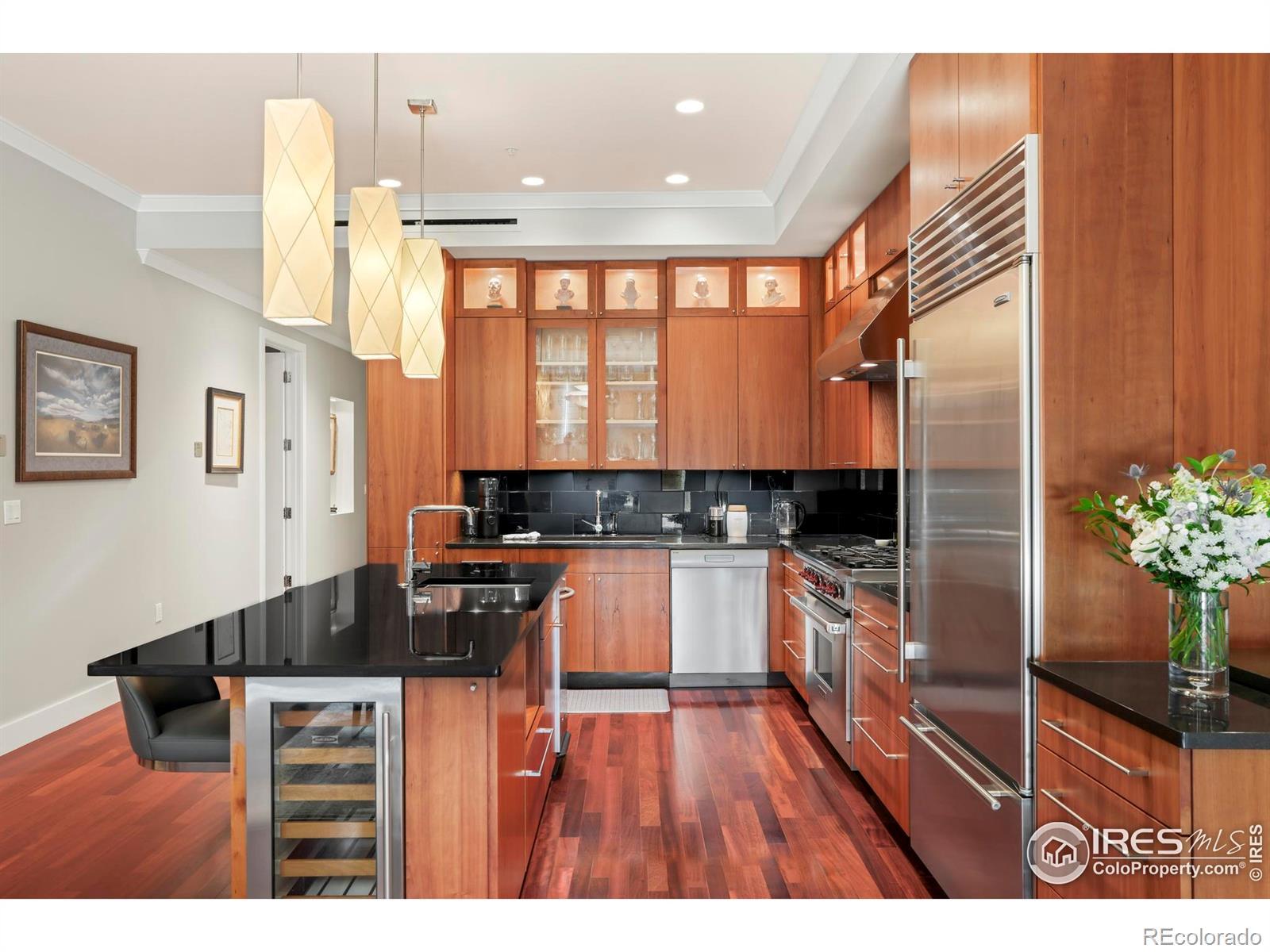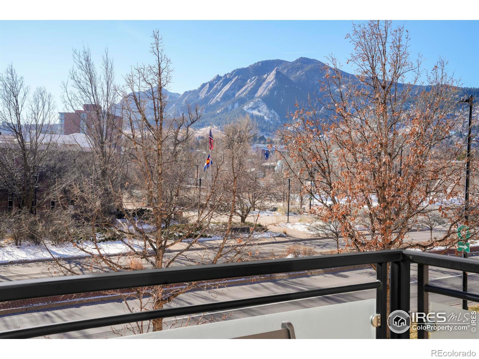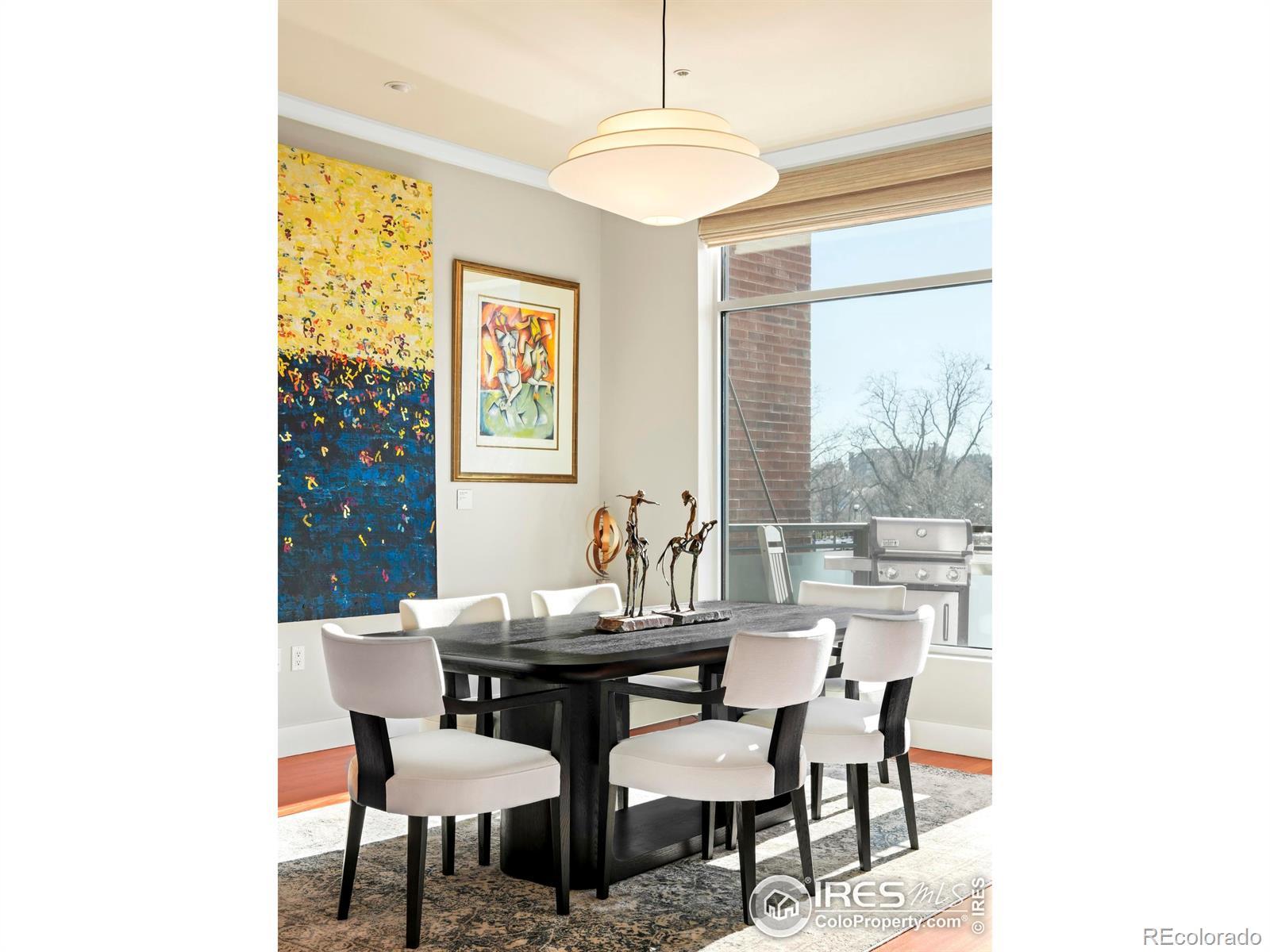 Bathed in southern light with iconic Flatiron views, this downtown Boulder residence delivers refined living just moments from Pearl Street. Set within a secure, high-end building, this spacious single-level condo balances a timeless, comfortably modern aesthetic with exquisite craftsmanship throughout. The open-concept living and dining area is anchored by a gas fireplace with a floor-to-ceiling Fieldstone surround and framed by a wall of windows that capture dramatic mountain views. Brazilian cherry floors, 10-foot ceilings, custom built-ins and a dedicated work alcove elevate both form and function. The updated chef's kitchen features custom wood cabinetry, quartz countertops, an island with a breakfast bar and wine fridge and a premium appliance suite including Sub-Zero, Wolf, and Asko. A private terrace extends the living space outdoors. The primary suite offers a luxurious five-piece bath with a steam shower and a walk-in closet. Additional highlights include remote-controlled window coverings, two designated underground parking spaces, storage, bike parking and a well-run HOA with internet included.