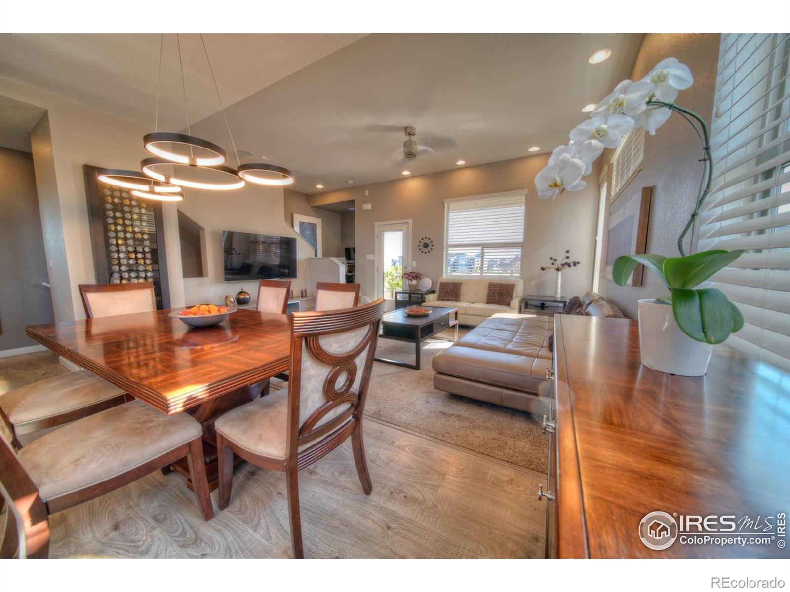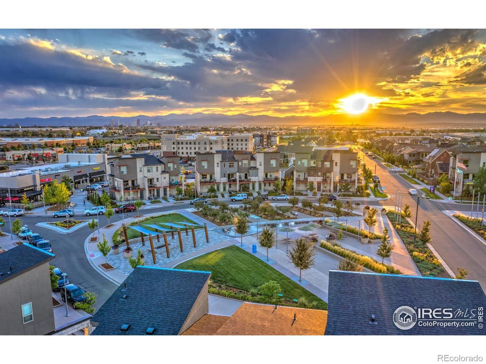 LOCATION, LOCATION, LOCATION! Fantastic mountain, city, and park views from this three-story townhome fronting Conservatory Green, and just steps to the Shops at Northfield, a comedy club, bowling alley, grocery, Torchy's Tacos, and many more dining options! LVP flooring, mudroom, mechanicals, 2-car garage, and storage room on the first floor. Gourmet kitchen with gas-burning range/oven, stainless steel appliances, vented microwave, Bosch dishwasher, 42-inch cabs with crown moldings, and a center island on the second floor. Formal dining area and a large living room with 10' ceilings, 5.1 surround sound, and a walk-out to a large partially covered Trex balcony overlooking the fountain and park. Small office space with built-ins and a desk. Three bedrooms, two full baths, and a full-size laundry on the upper level. The primary suite has 10' ceilings, a walk-in closet, a five-piece bath with custom tile, a deep soaking tub, a pebble shower floor, and in-ceiling speakers. Mountain & city views from bedrooms two and three, and park views from the primary suite. The East/West exposures make for an ideal cross-breeze with the windows open, and enjoy shady afternoons on the East-facing patio and balcony. The sunrises and sunsets are amazing from this location! Custom ceiling fans and lighting fixtures throughout. Central air conditioning. Enjoy live music, farmers markets, an annual art show, and much more right out front on Conservatory Green, along with gorgeous views, a fire pit, a fountain, picnic areas, benches, and gorgeous holiday lighting and summer flowers. Minutes from Central Park's seven swimming pools, Stanley Marketplace, Dick's Sporting Goods Park, and Downtown Denver. This prime location blends urban convenience with suburban tranquility. SEE STREAMING VIRTUAL TOUR!
