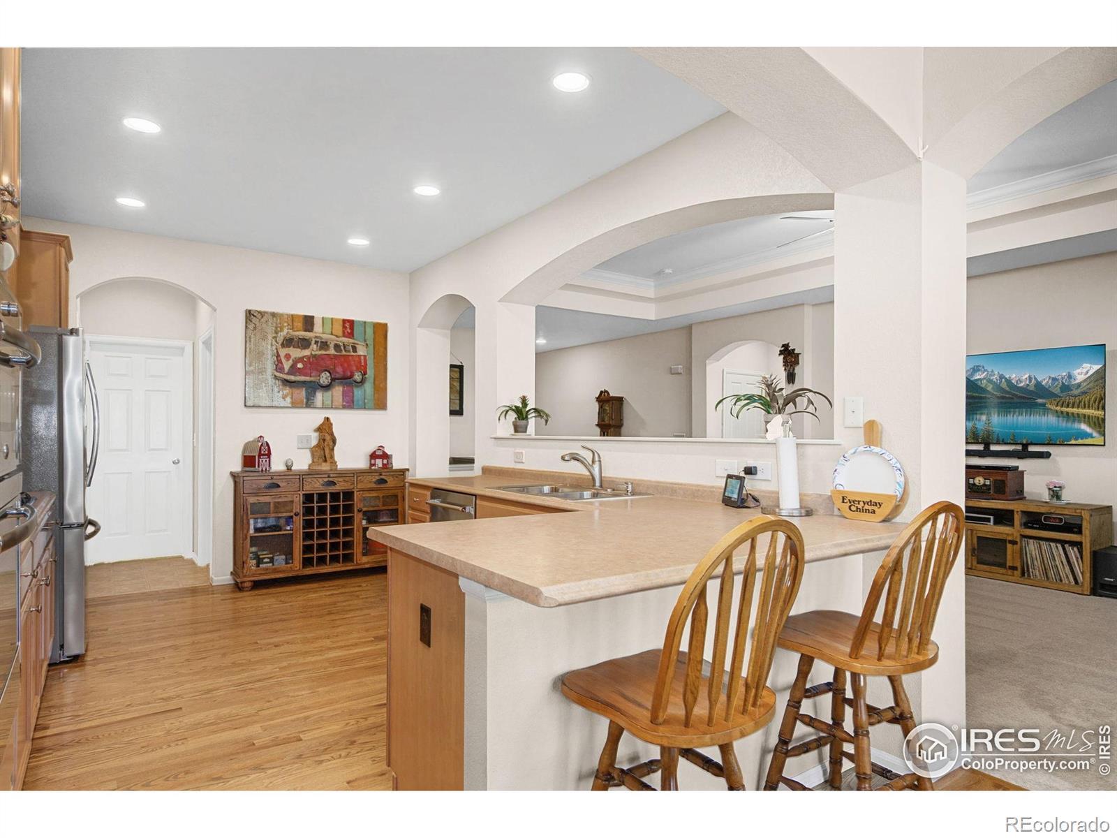 Nestled on one of the most premier lots in the neighborhood and bathed in south-facing sunshine, this exquisite ranch home offers the perfect blend of comfort and style, all while backing to picturesque open space and breathtaking mountain views. As you step inside, you're welcomed by the warmth of hardwood floors that flow seamlessly from the entryway to the kitchen and dining area. The 9-foot ceilings create an airy ambiance, while coffered ceilings and elegant archways add a touch of sophistication. The heart of the home, a spacious kitchen, is truly a chef's delight. Outfitted with stainless-steel appliances, including a gas range, and abundant cabinet space, it invites culinary creativity and entertaining. If you want to expand and add a recreation room or additional bedroom, the unfinished basement, equipped with a rough-in, is ready for your personal touch and customization. The sunroom and back deck are the true showstoppers! Whether it's retreating to the sunroom for a beverage or watching the sunset from your back deck, both retreats offer the perfect sanctuary to take in the sweeping mountain vistas and the natural beauty of the open space. Meticulously cared for by the original owners, the property features newer carpet, exterior paint, and water heater, and lives better than new. Situated in the heart of it all, this home provides quick access to nearby parks, trails, natural areas, Old Town, I-25, and more! This ranch home is not just a place to live; it's the Colorado lifestyle at its finest!