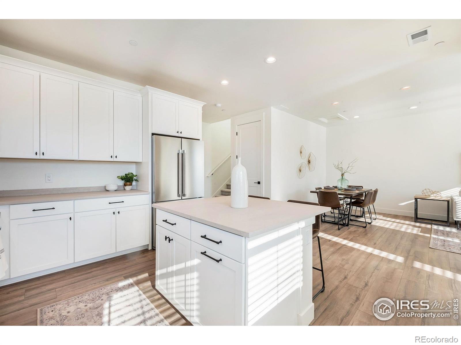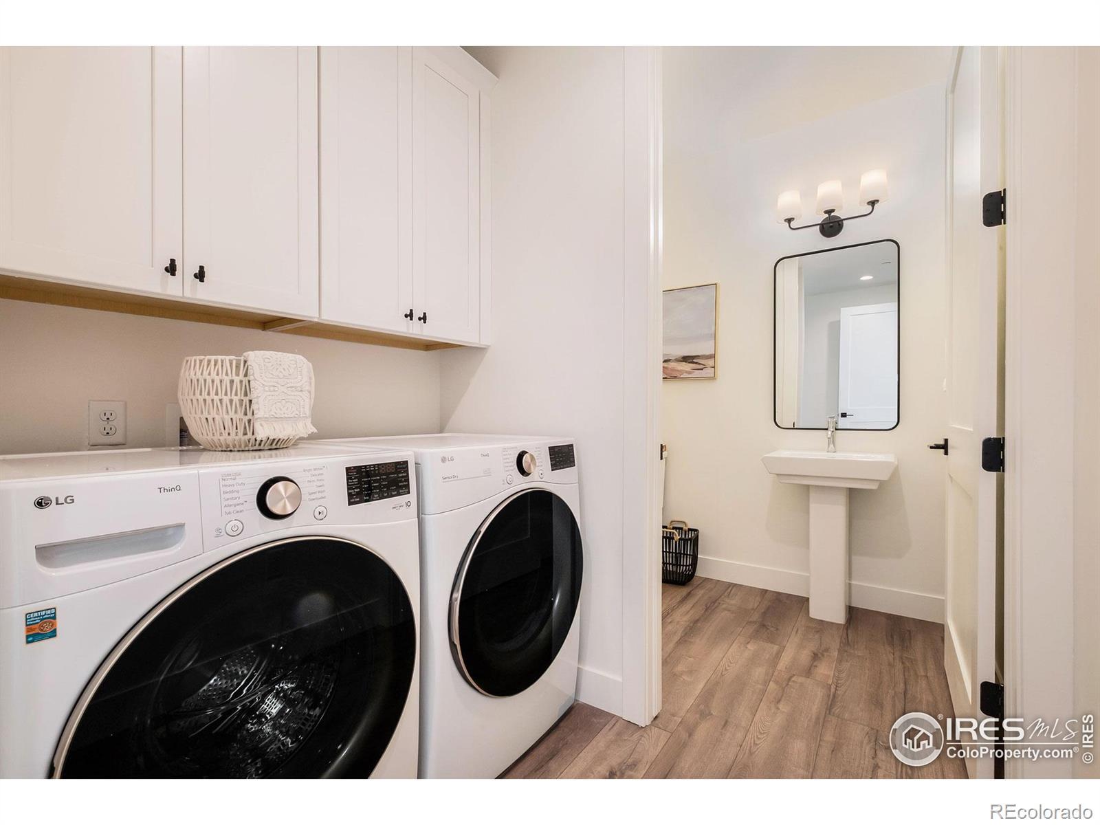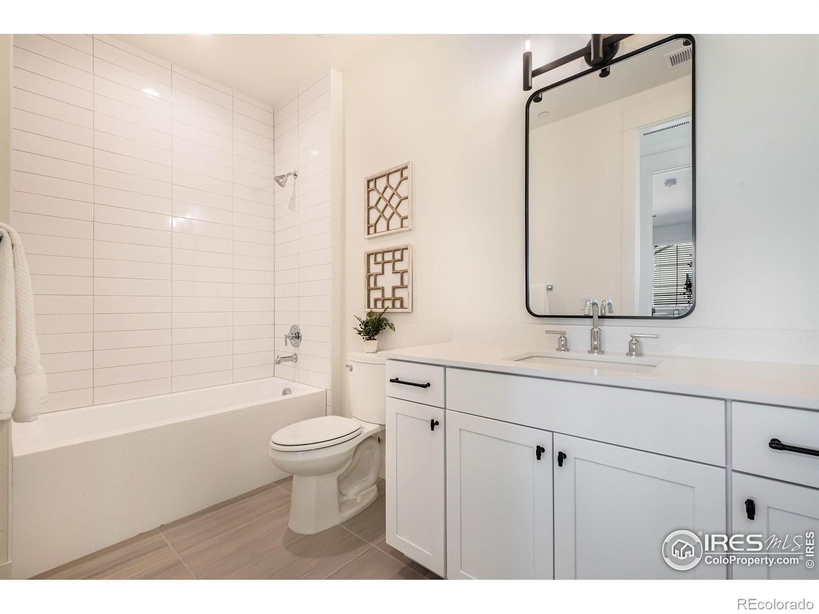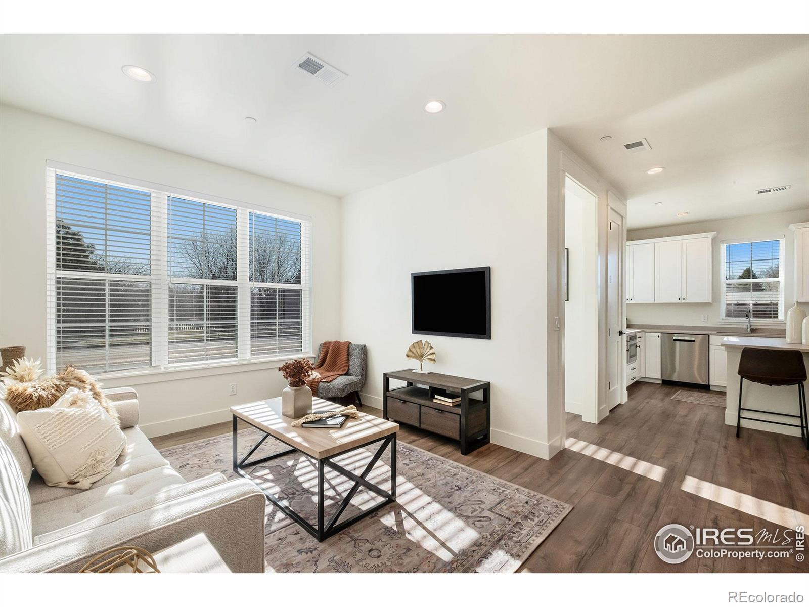 The Acadia plan features a main floor primary suite with 2 bedrooms and a spacious loft upstairs. This end-unit features an open floor plan with tons of natural light, standard finish package including quartz countertops, tile showers, shaker style cabinets with 42" uppers and crown molding, stainless appliances and window blinds included. Finished Basement. Each home has a fenced front yard and there is a community dog park, play structure, and greenbelts throughout the development. The oversized 2 car garage provides ample parking. This incredible community is conveniently located in Northwest Loveland, close to regional trails, open space, shopping, easy access to Fort Collins, Loveland and breathtaking mountain views. Photos of previously built home, same floorplan.