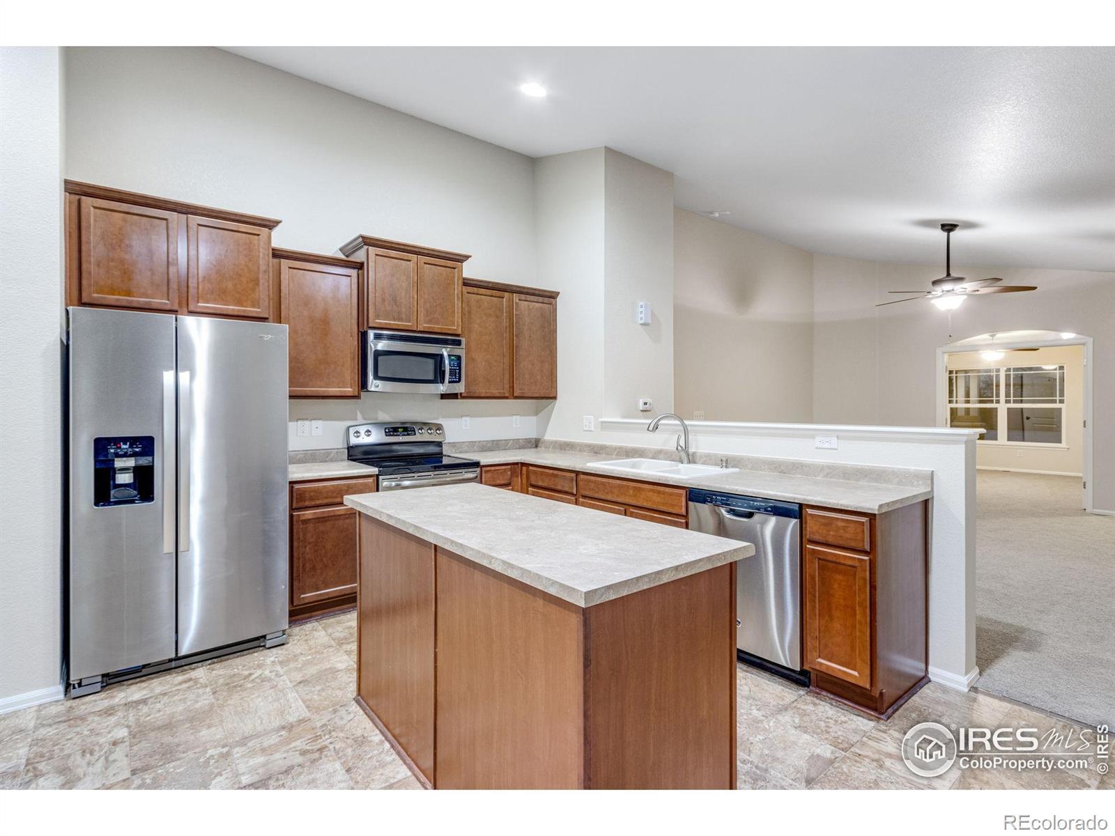 This refreshed ranch style home offers effortless main floor living. With 2 bedrooms plus an office, 2 bathrooms, and an open floor plan, the layout is designed for comfort and flexibility. Fresh interior paint and brand new carpet make the home feel crisp and move in ready. The spacious kitchen and living areas flow seamlessly together, creating an ideal setting for everyday living or entertaining. Main floor laundry adds convenience, while the unfinished basement provides room to grow, store, or customize to your needs. Step outside to a fully fenced backyard backing to a greenbelt buffer, offering privacy and a peaceful outdoor setting. Enjoy morning coffee on the covered front porch or take advantage of the neighborhood's walking paths and community pool. Tucked in a cul de sac, this home combines tranquility with easy access to Windsor's amenities, parks, and schools.