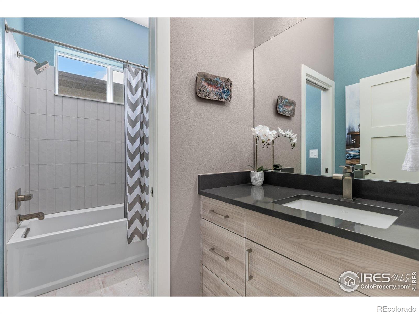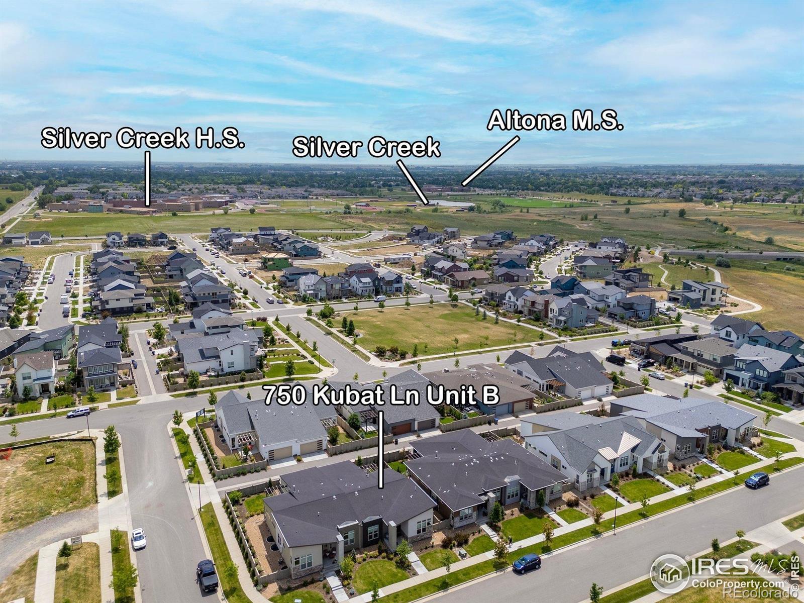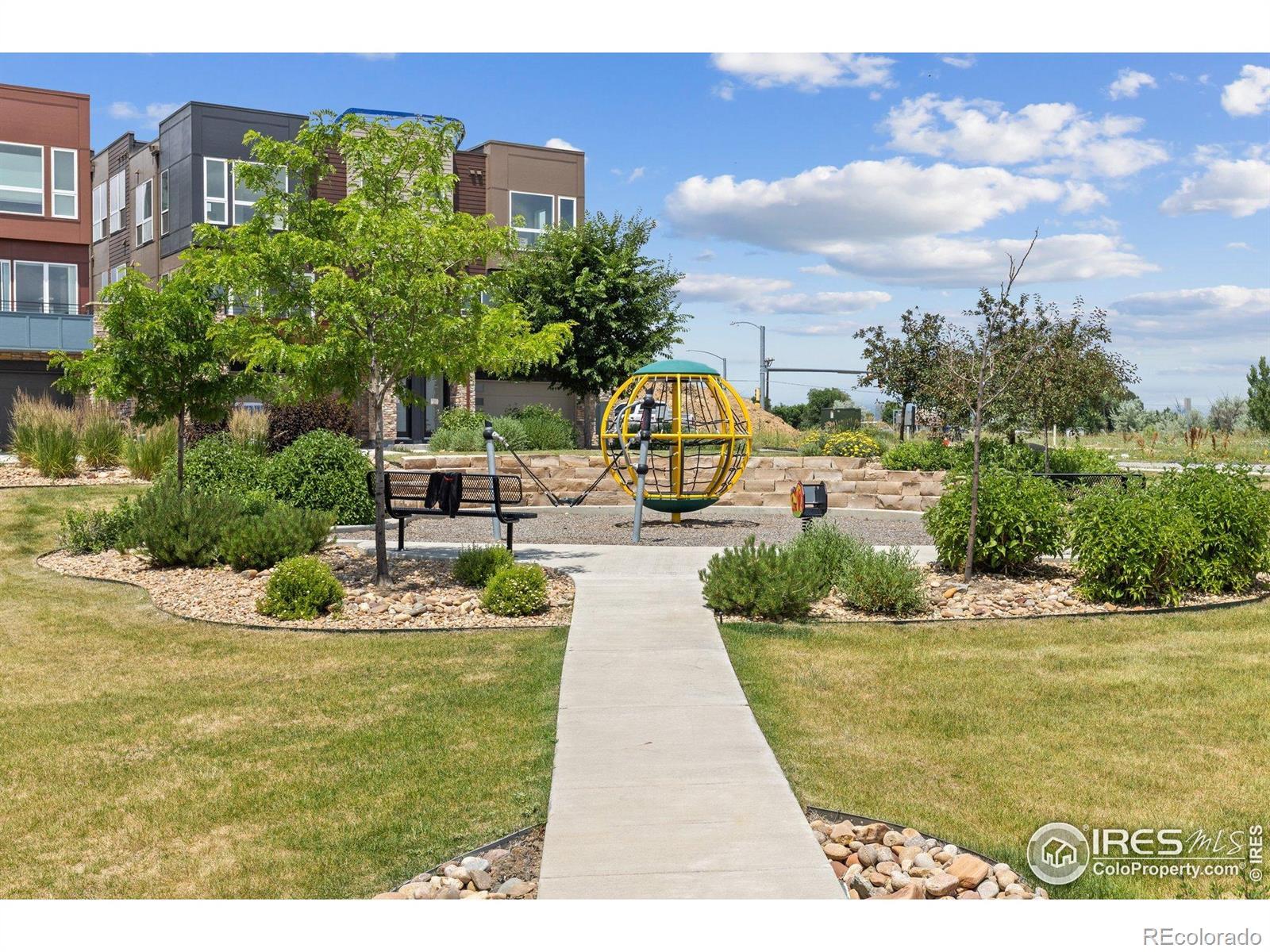 Ranch-style, west-facing home with park views and striking modern butterfly roof design. Enjoy bright, single-level, low-maintenance living with 10' & vaulted ceilings, large windows, and an open floor plan. The gourmet kitchen features Kitchen Craft cabinetry, quartz countertops, Whirlpool appliances, undermount sink, and a spacious island. Luxurious primary suite includes a 5-piece bath with freestanding tub. Stylish EVP flooring throughout main living spaces. Upgrades include living room fireplace, patio trellis, and gourmet kitchen package. Energy-efficient with central A/C, Navien tankless water heater, and smart thermostat. Optional basement finish offers potential for additional bedroom, bath, and rec room. Overlooking the neighborhood park, this home blends modern design, comfort, and Colorado living in one thoughtfully designed space