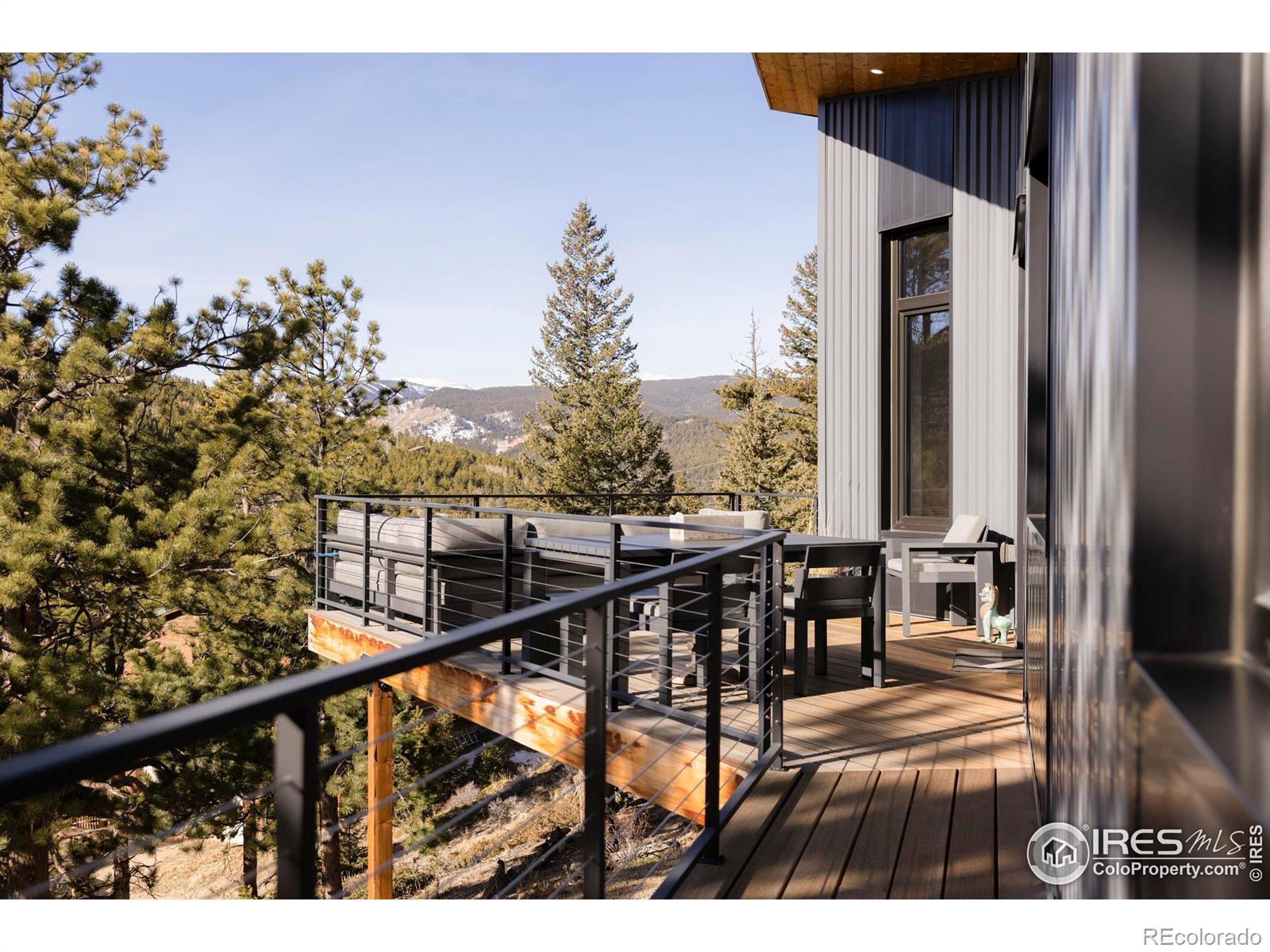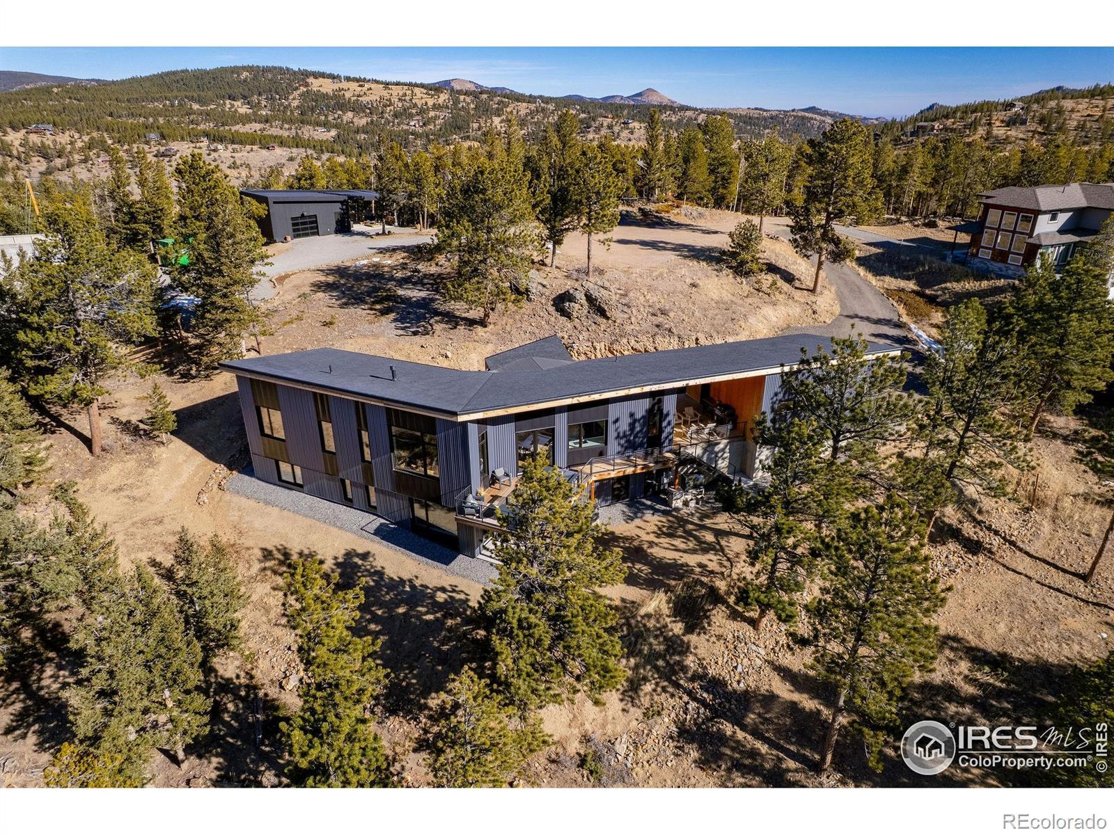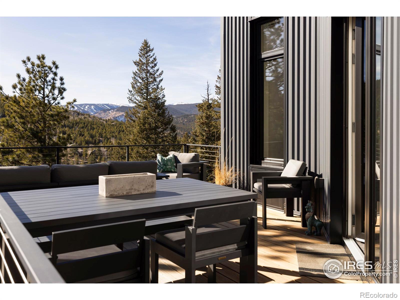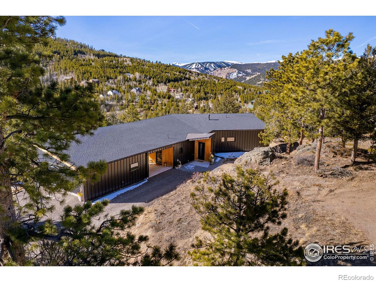 Tucked into a ponderosa grove, 103 Wildewood Drive offers 4 bedrooms, 4 bathrooms, and 3,326 square feet of award-winning architecture with views of Indian Peaks Wilderness and Eldora's ski runs. Just a mile from downtown Nederland and five miles to Eldora, this Passive House Institute US certified home was named Colorado's 2023 Green Building of the Year. Triple-pane European windows, air-tight insulation, and energy recovery ventilation keep the home comfortable year-round with minimal energy use, while southern exposure maximizes natural light and solar gain. The main level flows seamlessly from kitchen to dining to living room under high ceilings, with large Alpen windows framing Indian Peaks views. A waterfall-edge island, custom wood cabinetry, and glass doors opening to the deck blur the line between inside and out. A sleek gas fireplace anchors the living area. The main-floor primary suite captures mountain views, with a walk-in closet featuring custom built-ins, a freestanding soaking tub beneath a window, a walk-in shower with dual heads facing the peaks, and radiant heat underfoot. The walk-out lower level features polished concrete floors with radiant heat, a wet bar, and a large recreation space. A private guest suite includes its own bathroom and mountain views, while two additional bedrooms share a full bathroom, offering flex space for offices or creative pursuits. A covered breezeway connects the main house to the two-car garage and doubles as a sheltered patio. The deck off the main living area captures southern exposure and panoramic views, with trails and wilderness beyond. Nederland offers authentic mountain living an hour from Denver and twenty-five minutes from Boulder, where the Peak to Peak Scenic Byway meets coffee shops, hardware stores, and weekend live music. This home is for those who want to ski in the morning, grab lunch in town, and return to a place that's welcoming, sustainable, and beautifully designed.