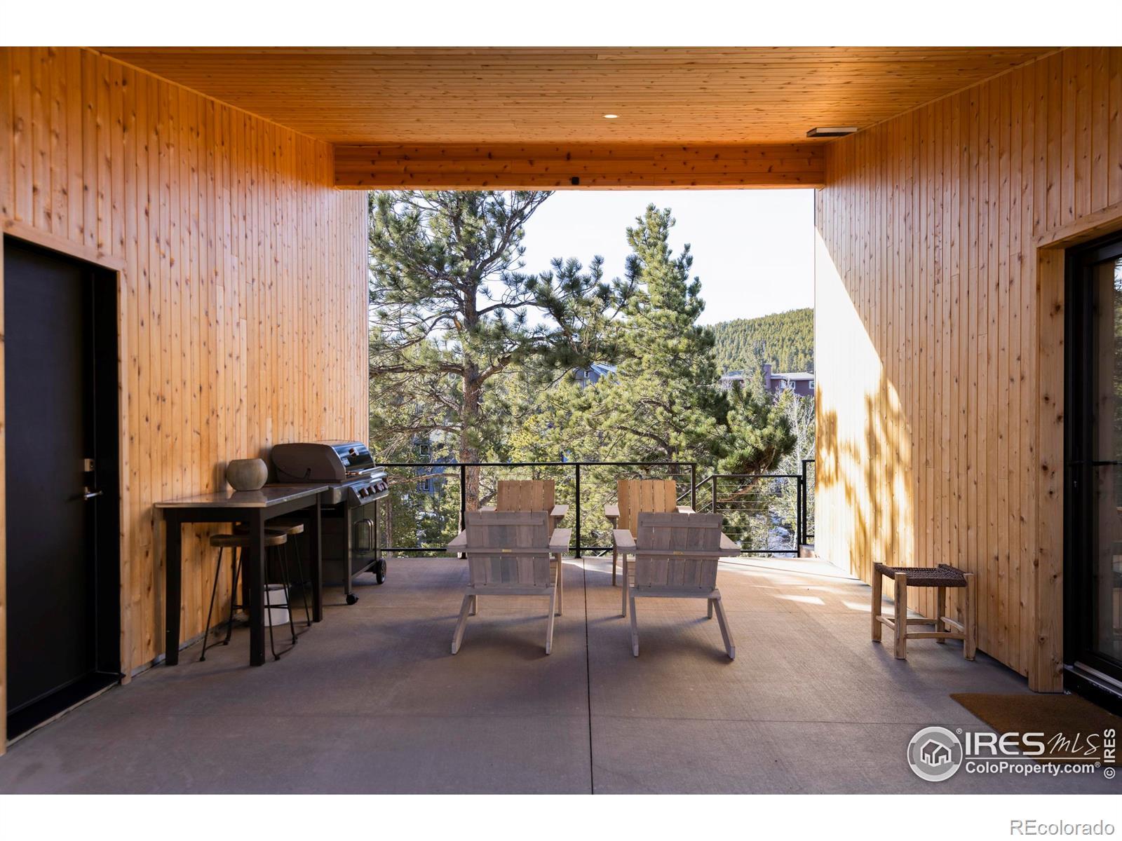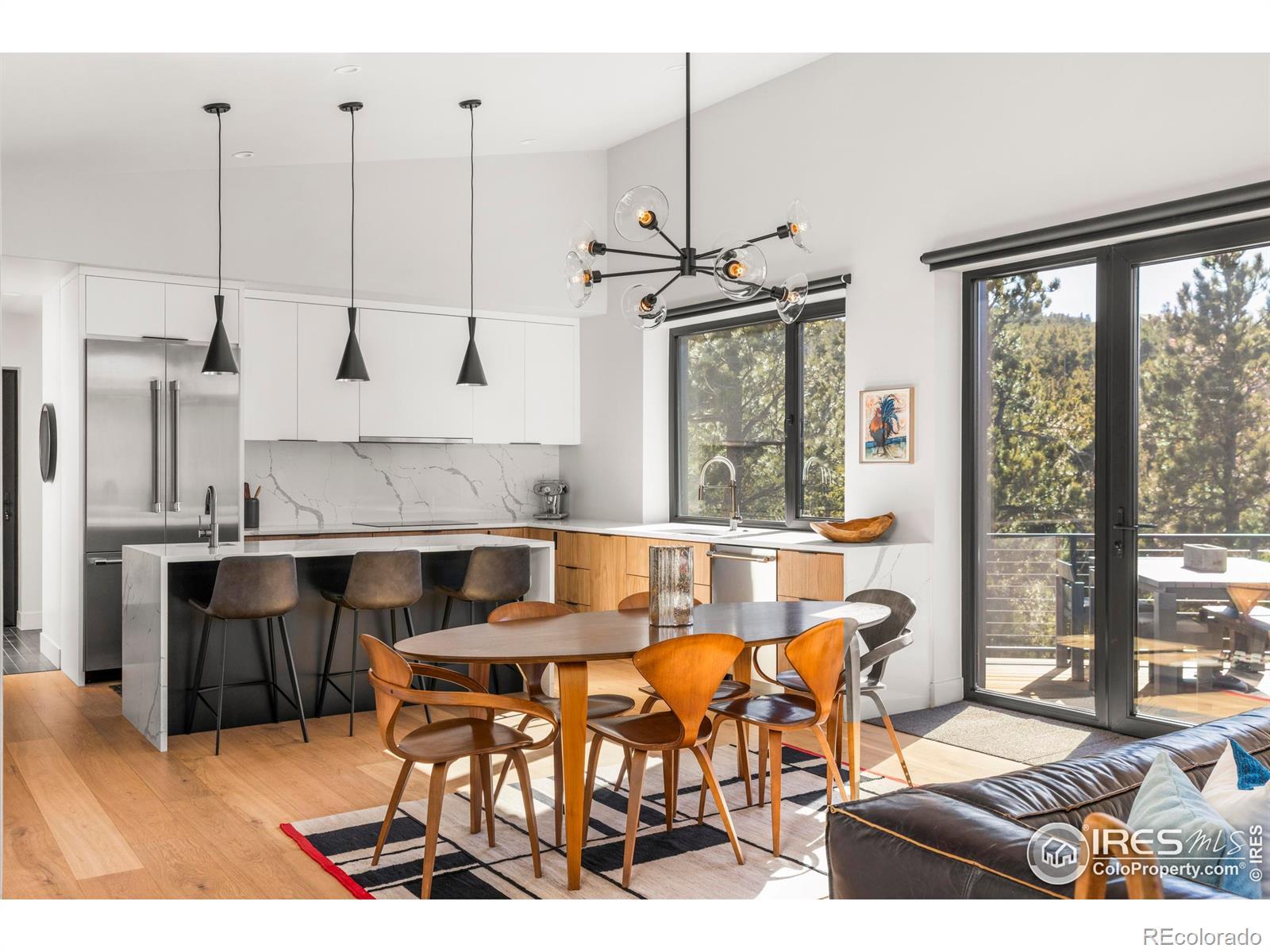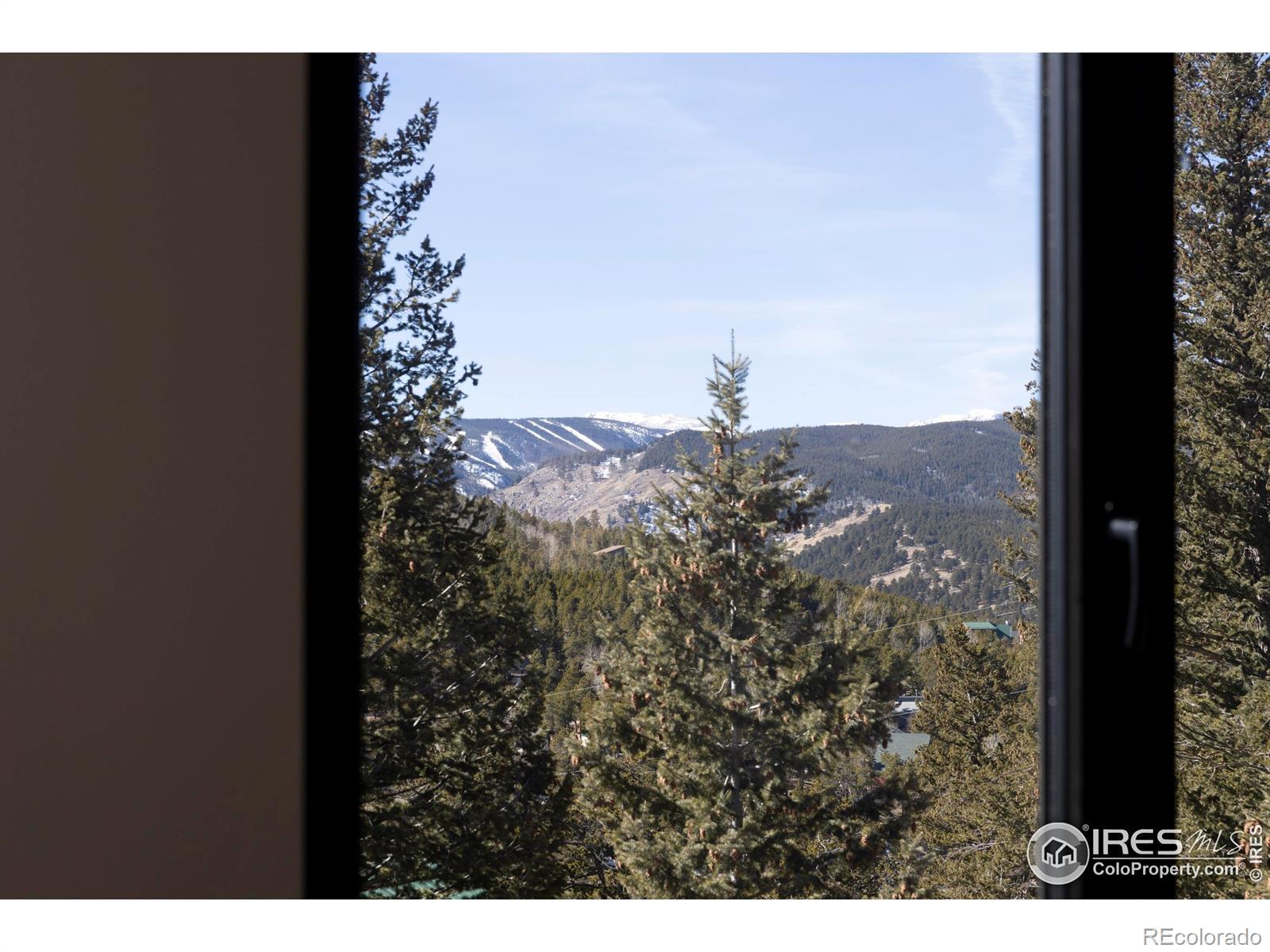 Tucked into a ponderosa grove, 103 Wildewood Drive offers 4 bedrooms, 4 bathrooms, and 3,326 square feet of award-winning architecture with views of Indian Peaks Wilderness and Eldora's ski runs. Just a mile from downtown Nederland and five miles to Eldora, this Passive House Institute US certified home was named Colorado's 2023 Green Building of the Year. Triple-pane European windows, air-tight insulation, and energy recovery ventilation keep the home comfortable year-round with minimal energy use, while southern exposure maximizes natural light and solar gain. The main level flows seamlessly from kitchen to dining to living room under high ceilings, with large Alpen windows framing Indian Peaks views. A waterfall-edge island, custom wood cabinetry, and glass doors opening to the deck blur the line between inside and out. A sleek gas fireplace anchors the living area. The main-floor primary suite captures mountain views, with a walk-in closet featuring custom built-ins, a freestanding soaking tub beneath a window, a walk-in shower with dual heads facing the peaks, and radiant heat underfoot. The walk-out lower level features polished concrete floors with radiant heat, a wet bar, and a large recreation space. A private guest suite includes its own bathroom and mountain views, while two additional bedrooms share a full bathroom, offering flex space for offices or creative pursuits. A covered breezeway connects the main house to the two-car garage and doubles as a sheltered patio. The deck off the main living area captures southern exposure and panoramic views, with trails and wilderness beyond. Nederland offers authentic mountain living an hour from Denver and twenty-five minutes from Boulder, where the Peak to Peak Scenic Byway meets coffee shops, hardware stores, and weekend live music. This home is for those who want to ski in the morning, grab lunch in town, and return to a place that's welcoming, sustainable, and beautifully designed.