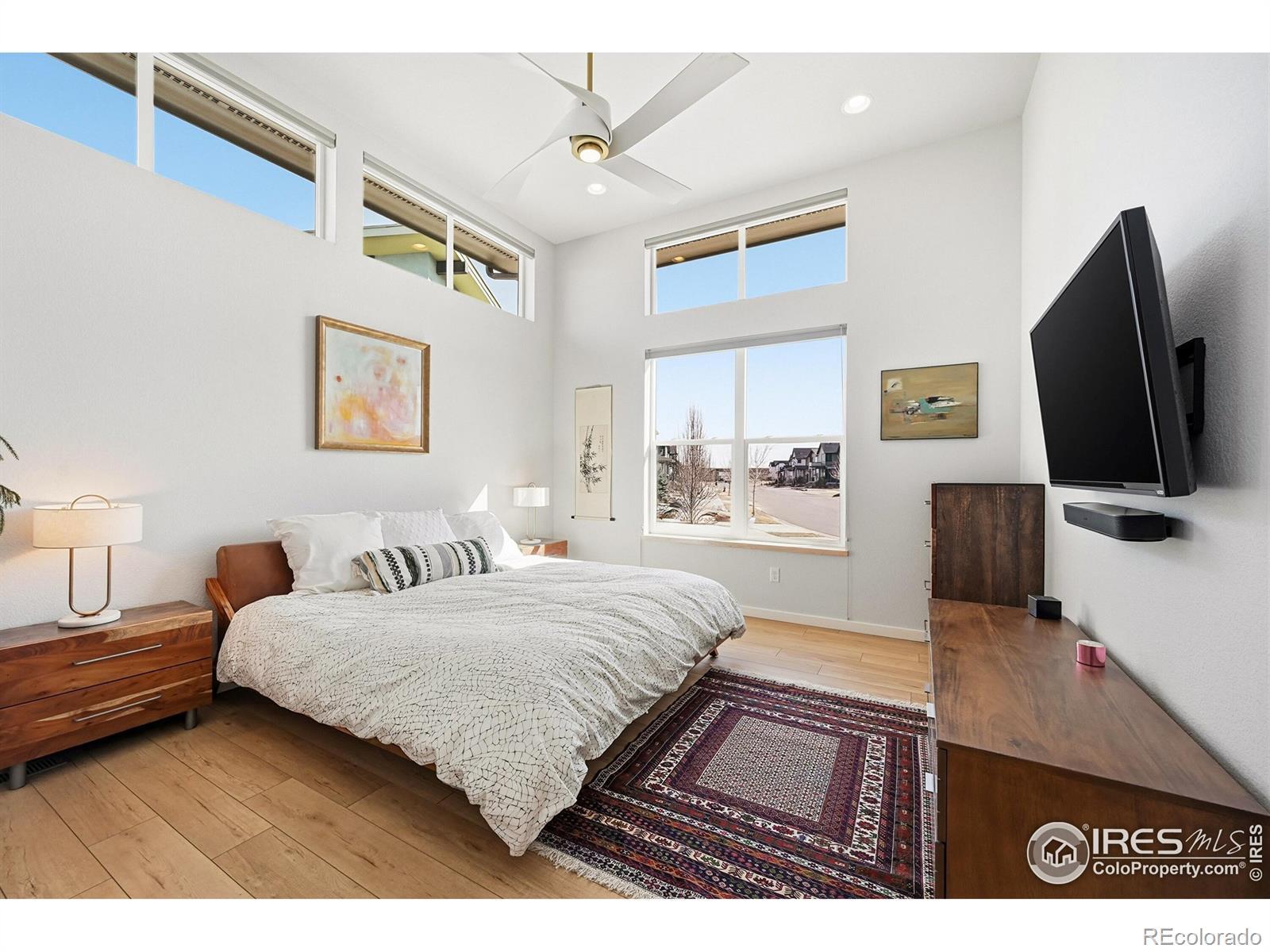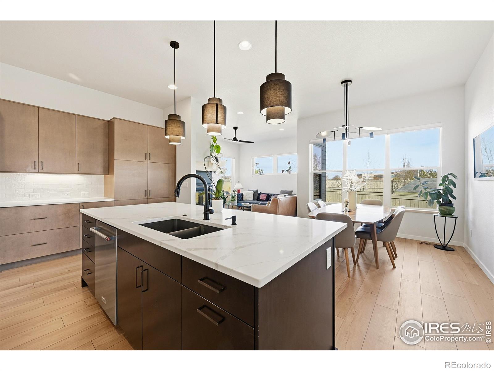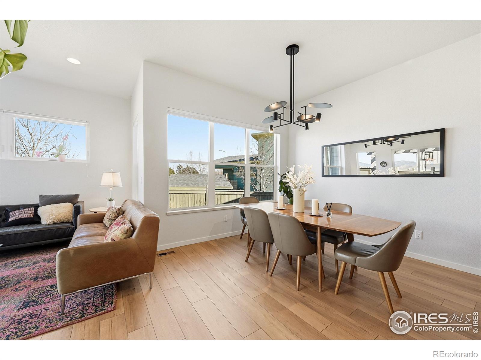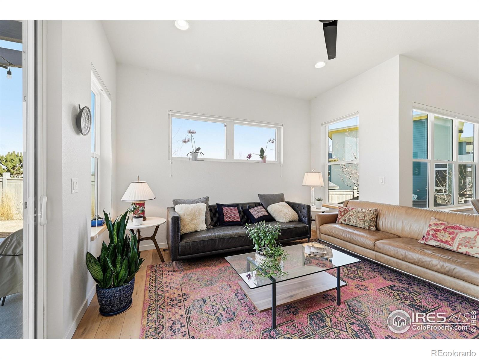 Modern Ranch Living with Longs Peak Views on a spacious .18-Acre Lot. Welcome to this stunning ranch-style single-family home, perfectly positioned on one of the larger lots in West Grange with mountain views and added privacy. Designed with a modern aesthetic and impeccable attention to detail, this home offers light-filled living spaces, soaring 10 ft high ceilings, and beautiful (engineered vinyl EVP) flooring throughout the main level. The open-concept floor plan creates a seamless flow between the living, dining, and kitchen areas - ideal for both everyday comfort and entertaining. A stylish corner gas fireplace anchors the great room, adding warmth and architectural interest. The home's contemporary interior finishes and clean, sophisticated design elevate every space. The primary suite (with automatic shades on all windows) is complete with a private and luxurious primary bath. The fully finished light filled basement with high ceilings expands your living options with a spacious family / rec room, an additional bedroom, and a full bathroom - perfect for guests, a home office, or multi-generational living. In excellent like new condition and truly move-in ready, this modern ranch offers the perfect blend of comfort, outdoor living space, and stunning Colorado views. A Community Park is a block away and a great western Longmont community, with easy access to Boulder. Cycling is a dream in this west Longmont location!