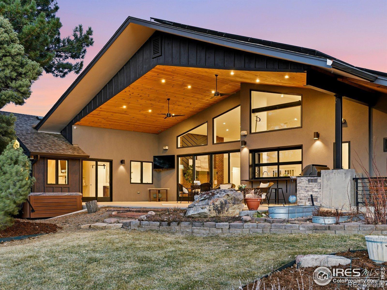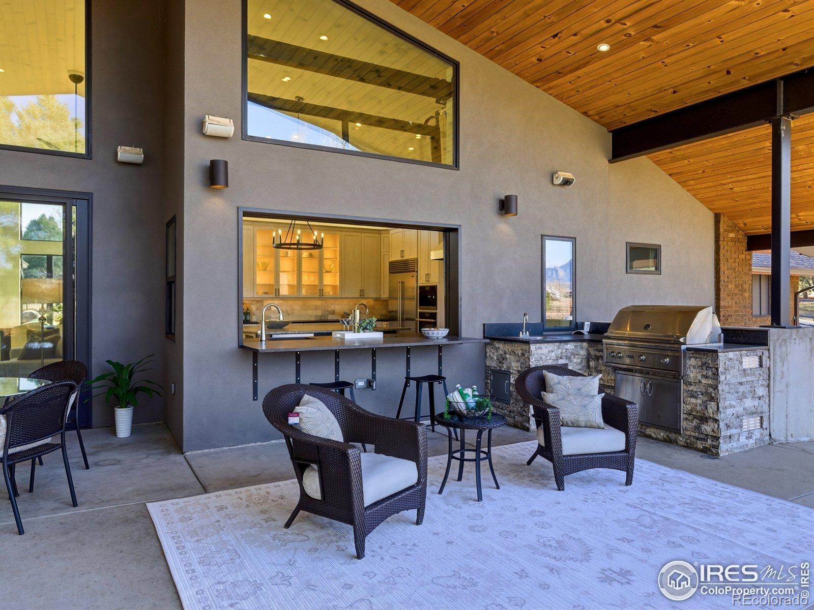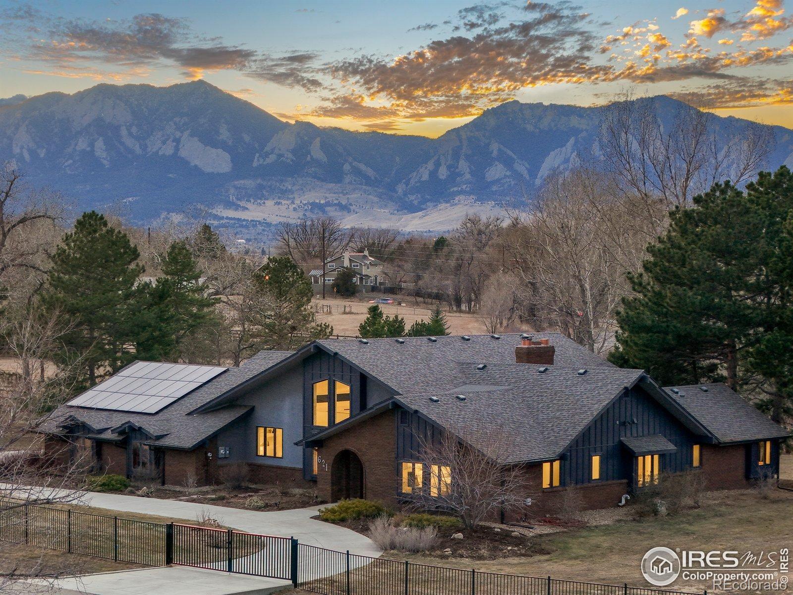 Main level living, STUNNING views, and 1.5 fully fenced acres just minutes from downtown Boulder! This private retreat delivers the rare balance of space, sunlight, and seamless indoor-outdoor living with breathtaking views of the Flatirons. Vaulted ceilings and thoughtfully placed windows bask the home in natural light, creating bright, open spaces that feel warm, airy, and connected to the landscape. The main-level primary suite offers effortless single-level living, while expansive gathering areas flow naturally for both quiet mornings and lively evenings with friends. At the heart of the home is the kitchen, a true culinary experience featuring Thermador, Miele, Sub-Zero, and Bosch appliances, leathered and honed granite surfaces, and a motorized lift-up servery window that opens at the touch of a button-blurring the line between inside and out and connecting directly to the patio bar. A Lynx outdoor kitchen, a vast covered patio complete the outdoor entertaining spaces. Whole-home Sonos sound system and RadioRA Lutron lighting allow you to set the mood from day to night as you wish. High-performance systems elevate everyday comfort and efficiency, including geothermal heating and cooling, radiant in-floor heat, steam humidification, dual whole-house fans, an 80-gallon high-efficiency hot water system, whole-house filtration, and a 19kW owned solar array for near-zero energy costs. The lower level offers a media and recreation retreat, along with a fully permitted guest suite with private entrance. The guest suite has strong short-term rental history for those seeking additional income and is also perfect for multigenerational living. Equestrian zoning allows for up to two horses, well irrigation, and a loafing shed. Four-car garage with EV charging, easy access to trails, transit, and Boulder amenities complete the lifestyle. Big skies. Incredible light. Mountain views. Room to breathe. Colorado living-done right!