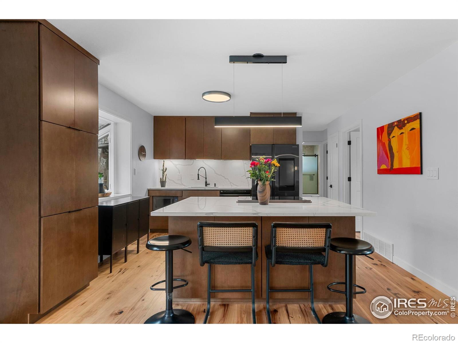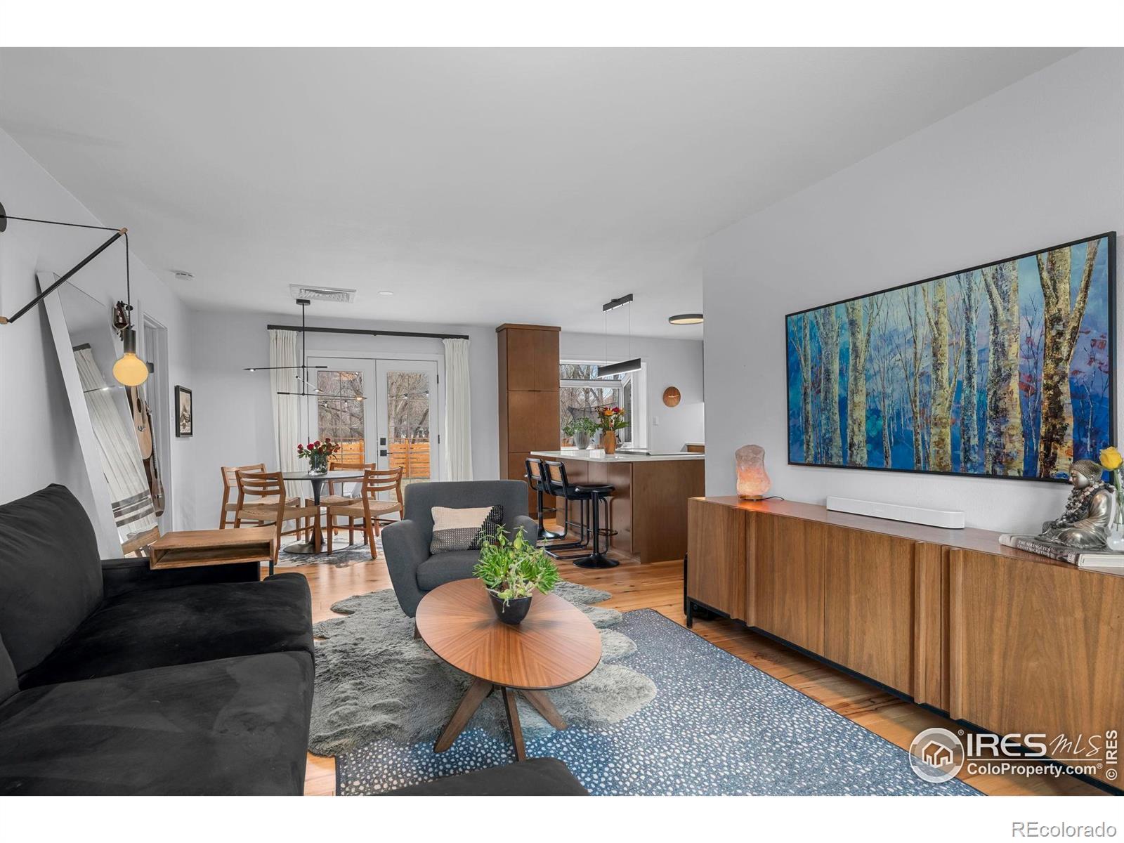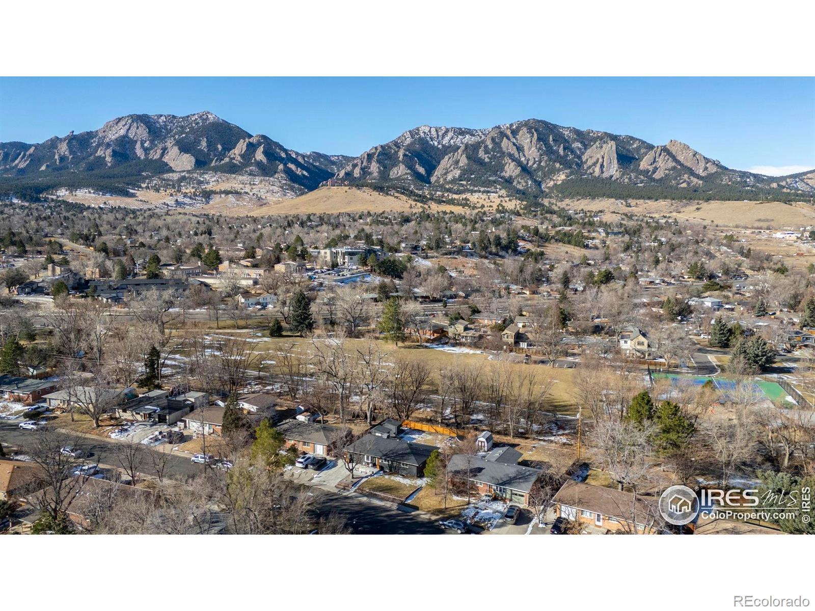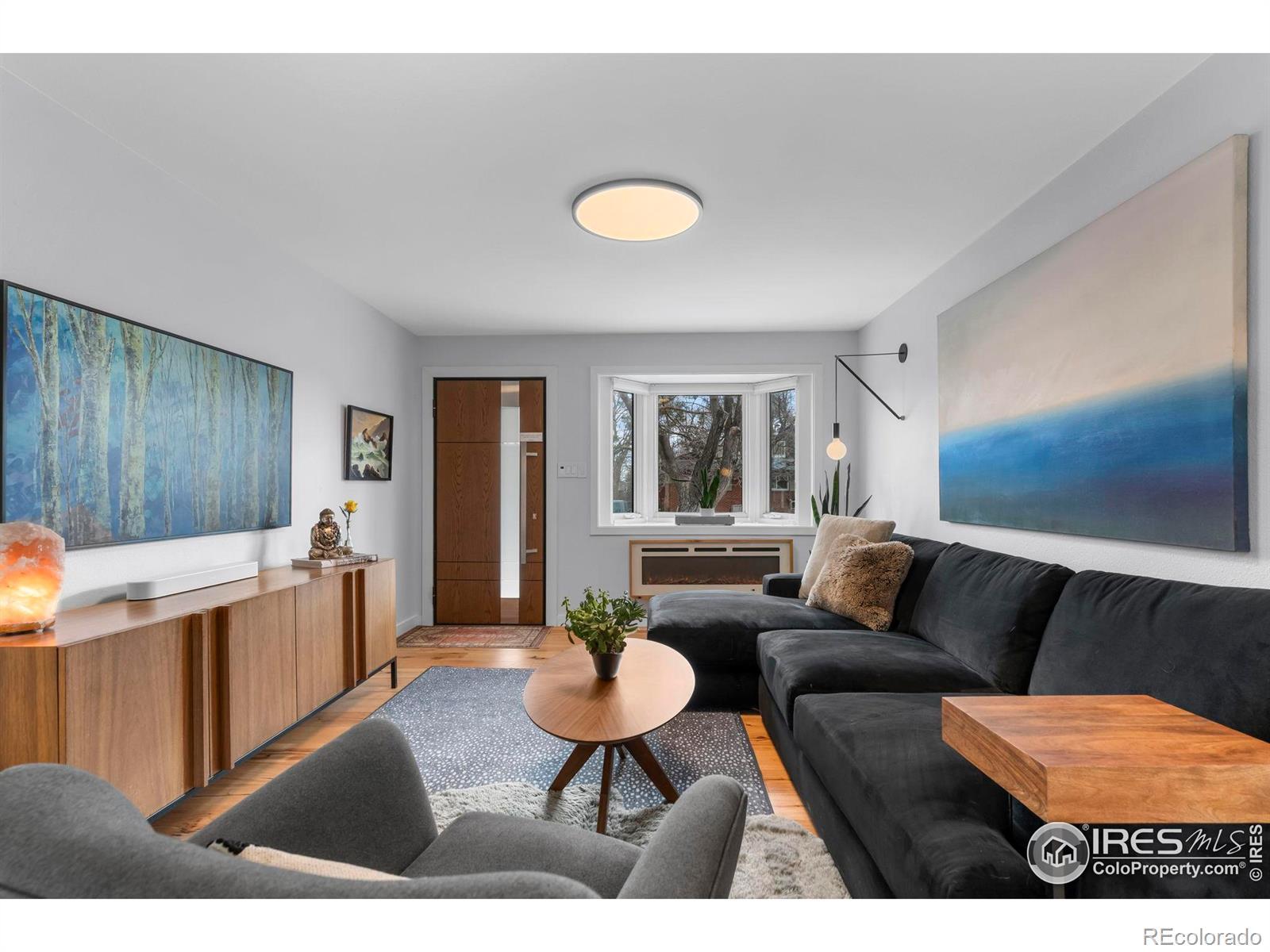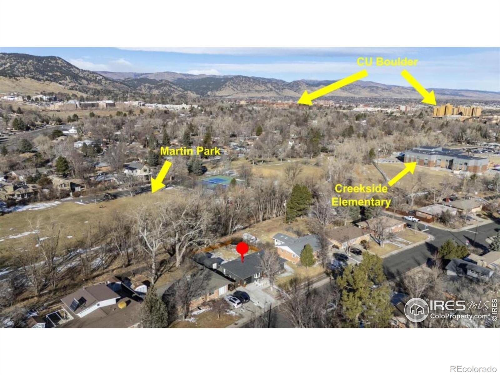 SHOWINGS START SAT, FEB. 21st! Love Where You Live in this beautifully updated mid-century modern, ranch-style home, offering exceptional value in Boulder. With striking modern curb appeal featuring a sleek black brick exterior and new front and garage doors, this home makes a memorable first impression. Perfectly situated on one of the neighborhood's premier lots, the property backs to Martin Park and the Bear Creek Path, showcasing stunning west-facing Flatiron views and just a short walk to top-rated Creekside Elementary. Inside, the extensively renovated main-level shines with new hickory wood flooring & a thoughtfully redesigned chef's kitchen complete with rich walnut-toned soft-close cabinetry, quartz countertops, center island with seating, and high-end appliances including a Bosch induction cooktop and Samsung Smart Refrigerator. The inviting living room features a stylish electric fireplace and custom designer lighting thru-out. Three well-sized bedrooms on the main-level, along with an expanded and beautifully updated full bath offering a double-sink vanity & additional storage. Step outside to a fully fenced backyard retreat with a spacious flagstone patio - perfect for relaxing or entertaining while enjoying the views. The fully finished basement adds valuable living space, including a family room, flexible exercise/bonus room, powder bath, 4th bedroom, a spacious work from home space/5th bedroom, and updated bath with double sinks and walk-in shower. Additional updates include a newer roof and windows. Unbeatable location within walking distance to Martin Park, Creekside Elementary, Under the Sun, Southern Sun Brewery, Whole Foods, King Soopers, Sweet Cow, and more. Easy access to Pearl Street, CU Boulder, and a convenient commute to Denver. Don't miss this opportunity to enjoy the very best of Boulder living!