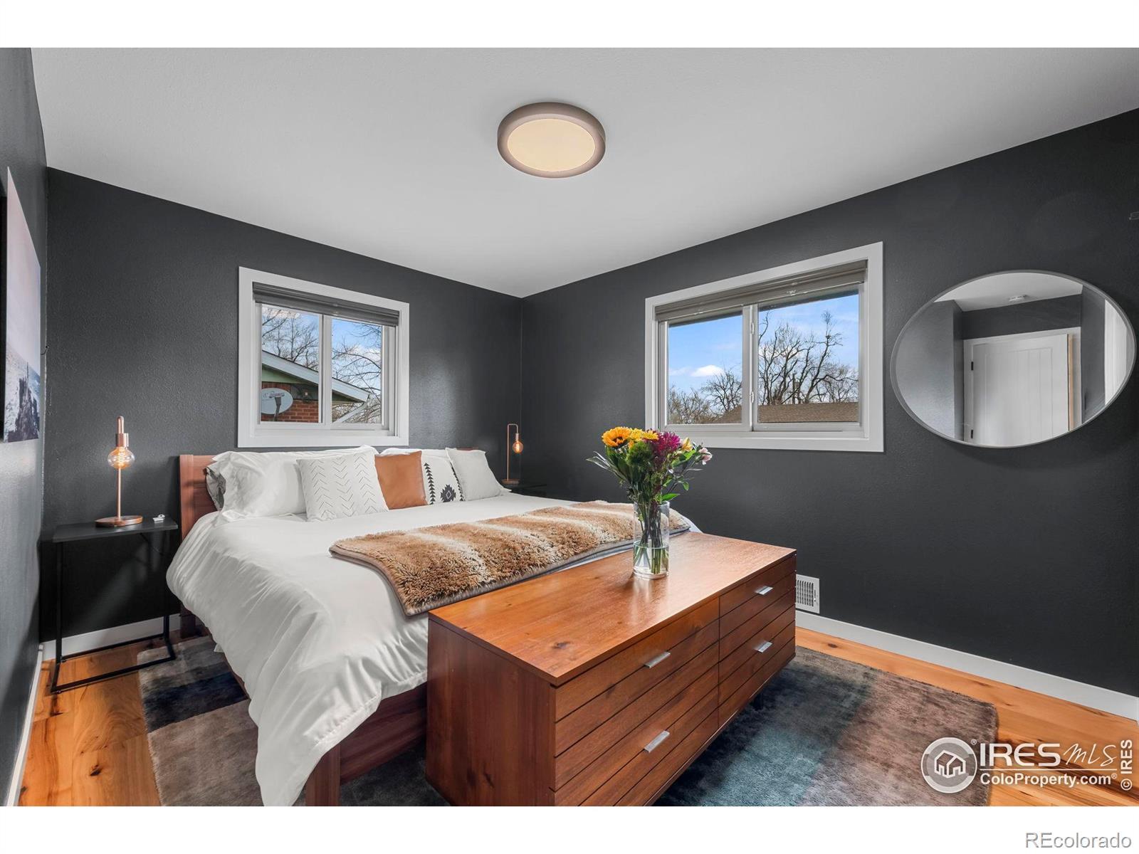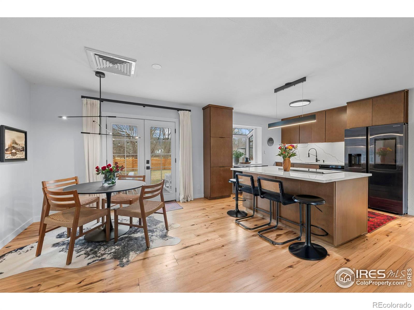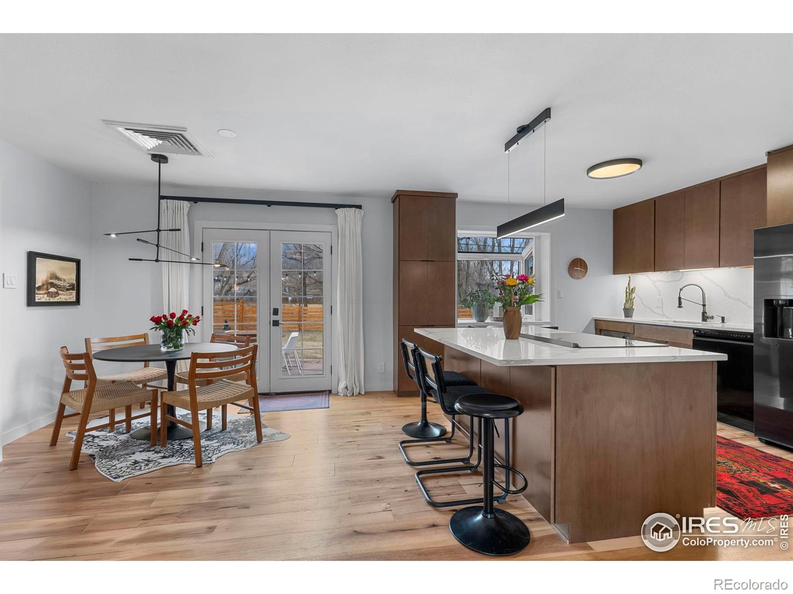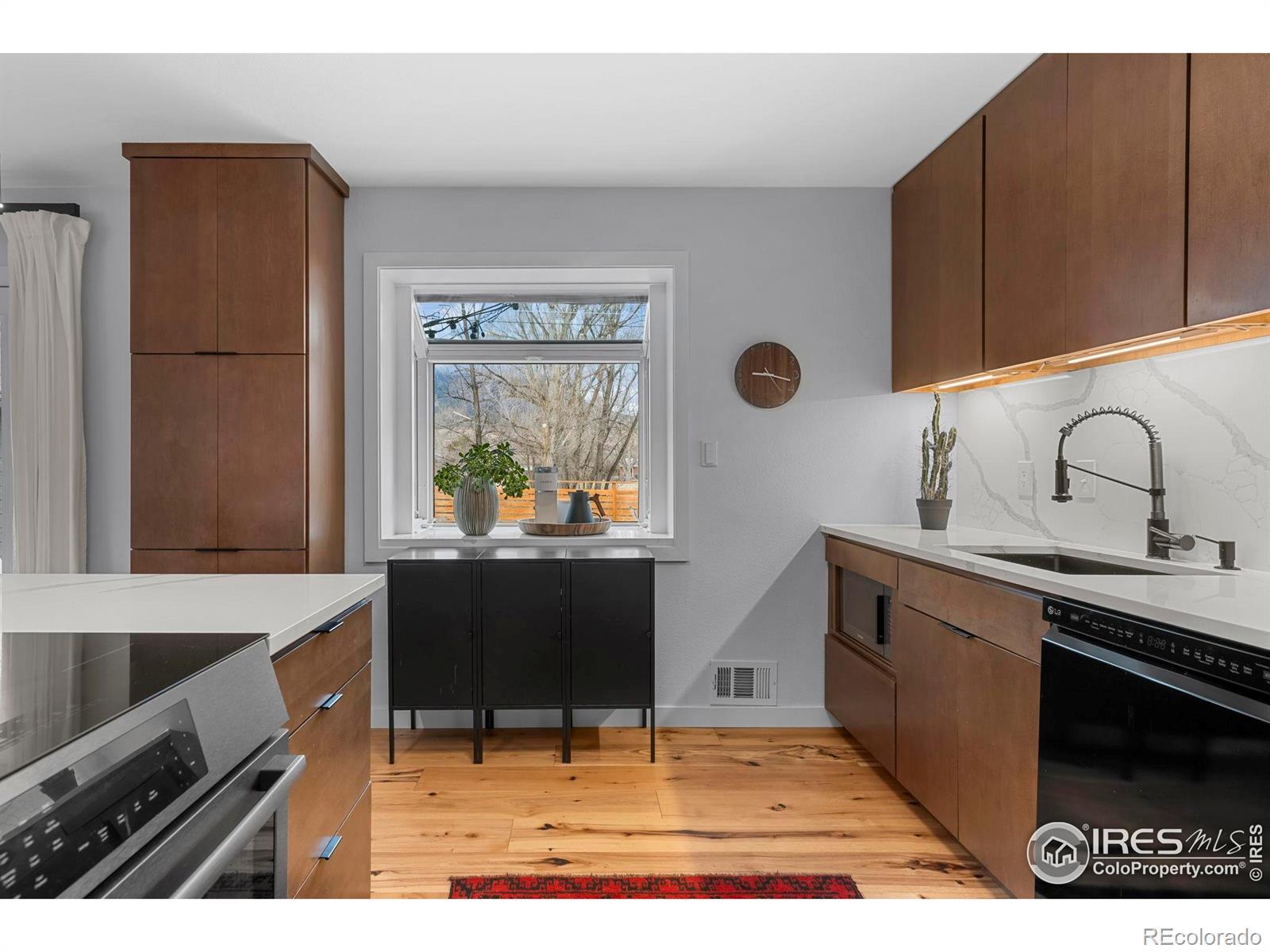 SHOWINGS START SAT, FEB. 21st! Love Where You Live in this beautifully updated mid-century modern, ranch-style home, offering exceptional value in Boulder. With striking modern curb appeal featuring a sleek black brick exterior and new front and garage doors, this home makes a memorable first impression. Perfectly situated on one of the neighborhood's premier lots, the property backs to Martin Park and the Bear Creek Path, showcasing stunning west-facing Flatiron views and just a short walk to top-rated Creekside Elementary. Inside, the extensively renovated main-level shines with new hickory wood flooring & a thoughtfully redesigned chef's kitchen complete with rich walnut-toned soft-close cabinetry, quartz countertops, center island with seating, and high-end appliances including a Bosch induction cooktop and Samsung Smart Refrigerator. The inviting living room features a stylish electric fireplace and custom designer lighting thru-out. Three well-sized bedrooms on the main-level, along with an expanded and beautifully updated full bath offering a double-sink vanity & additional storage. Step outside to a fully fenced backyard retreat with a spacious flagstone patio - perfect for relaxing or entertaining while enjoying the views. The fully finished basement adds valuable living space, including a family room, flexible exercise/bonus room, powder bath, 4th bedroom, a spacious work from home space/5th bedroom, and updated bath with double sinks and walk-in shower. Additional updates include a newer roof and windows. Unbeatable location within walking distance to Martin Park, Creekside Elementary, Under the Sun, Southern Sun Brewery, Whole Foods, King Soopers, Sweet Cow, and more. Easy access to Pearl Street, CU Boulder, and a convenient commute to Denver. Don't miss this opportunity to enjoy the very best of Boulder living!
