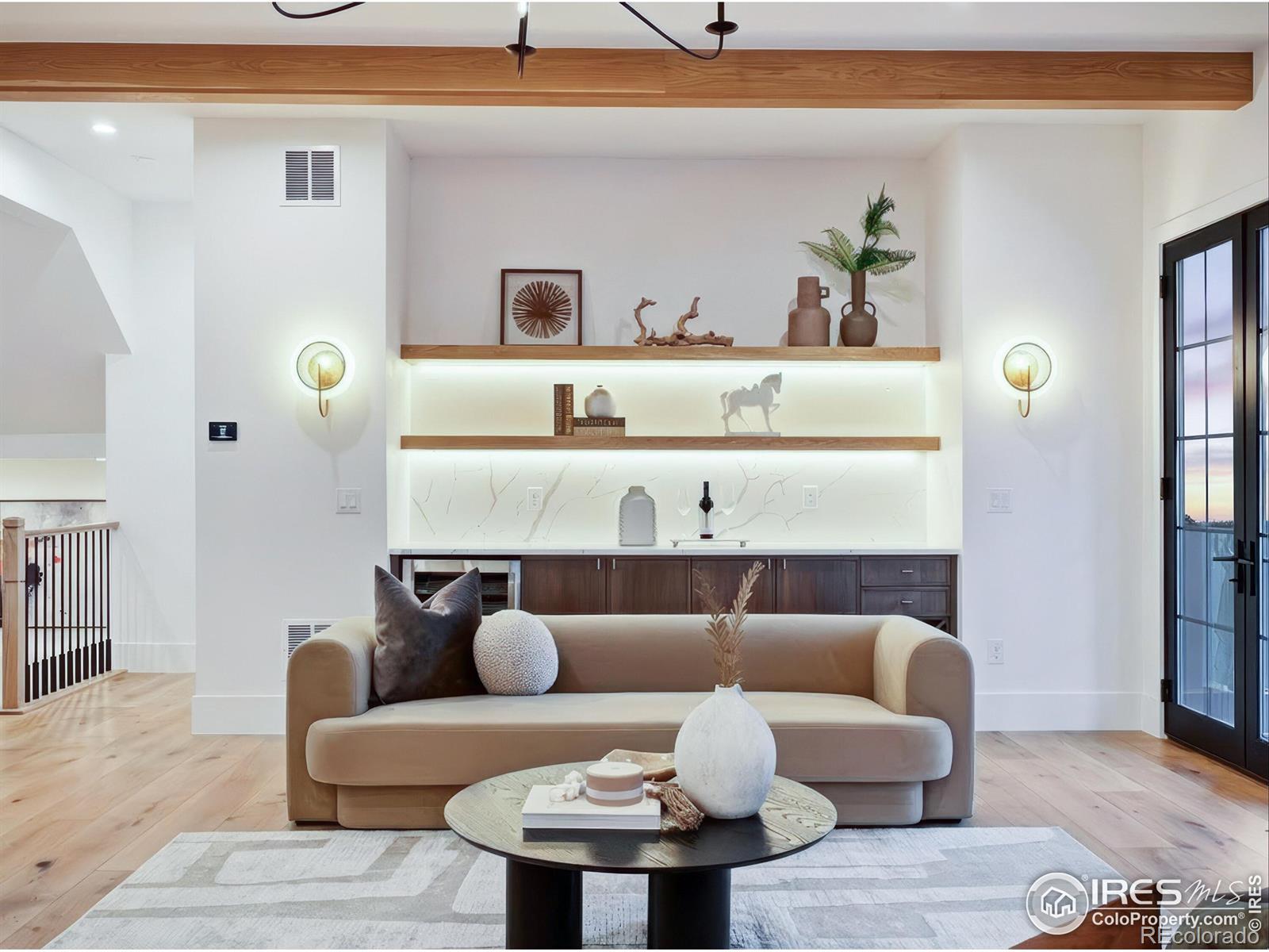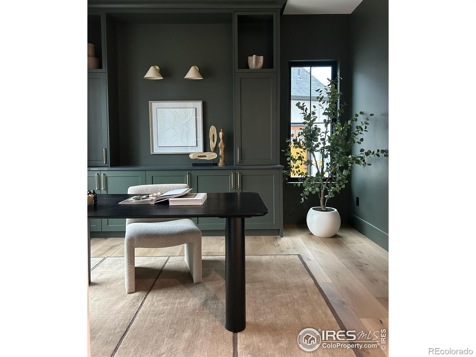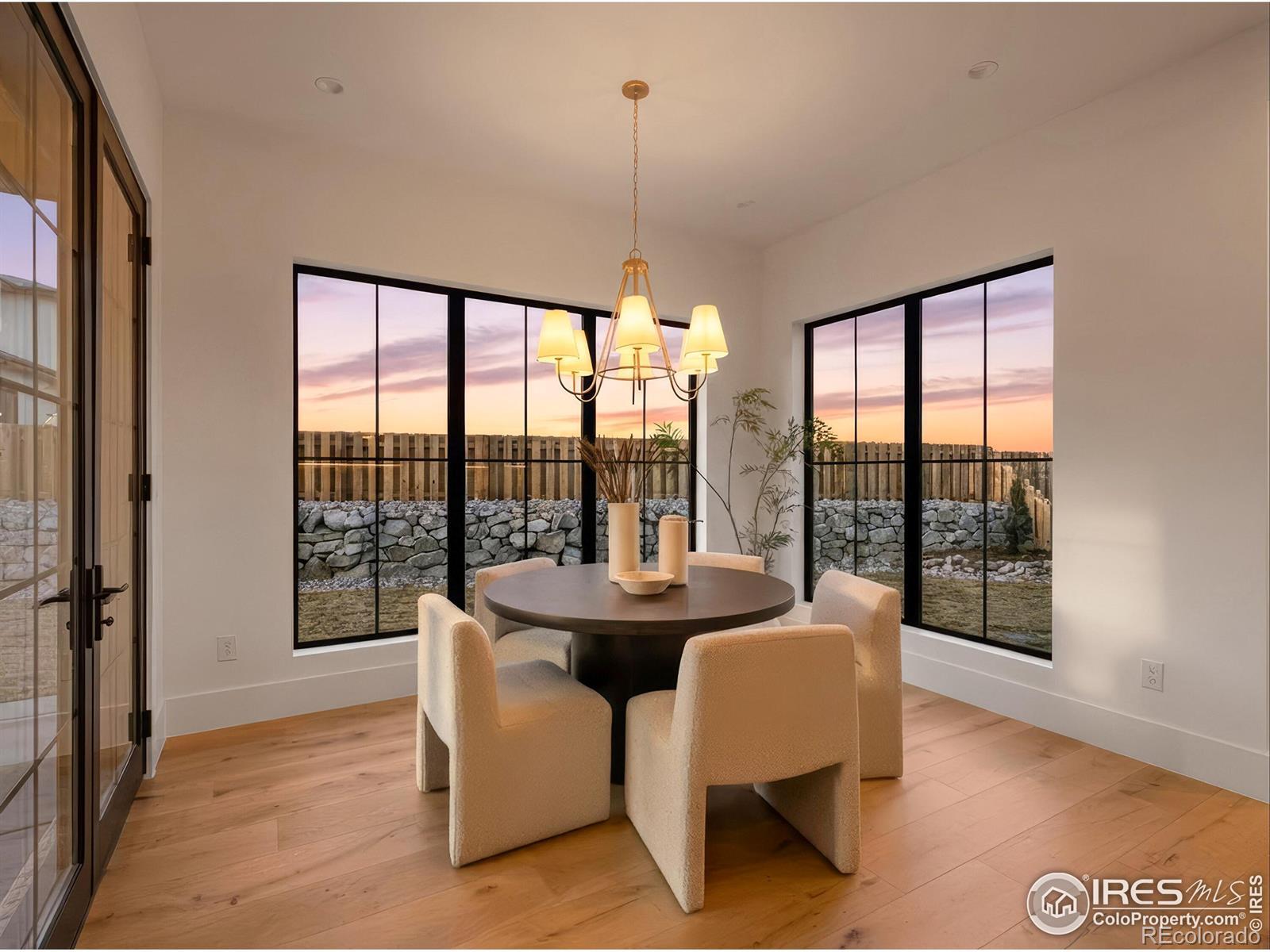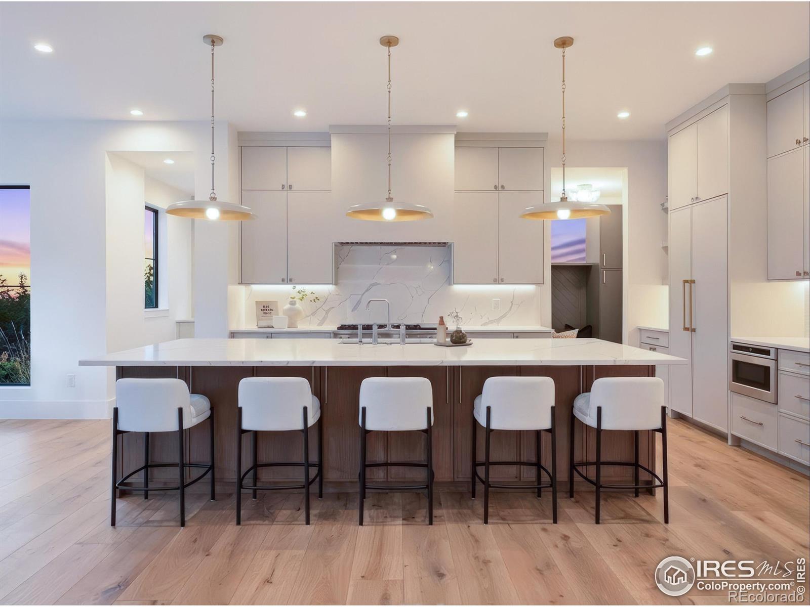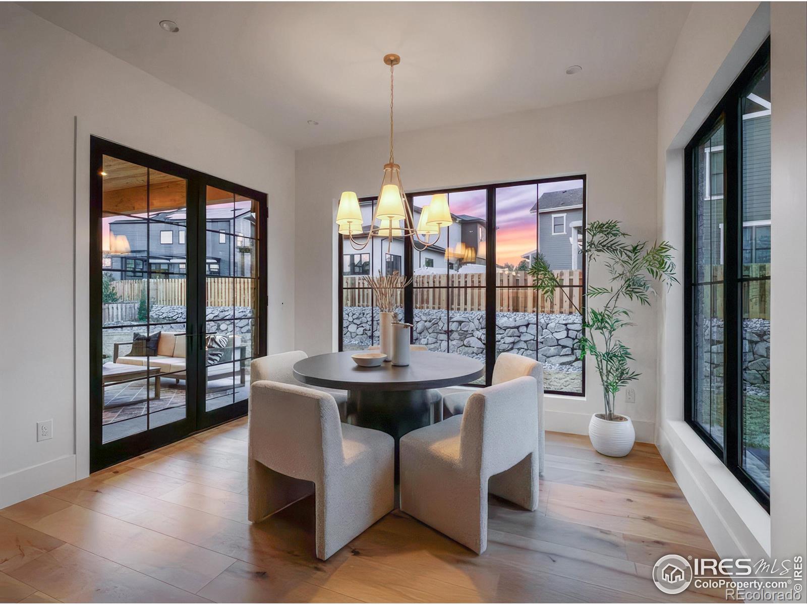 Experience refined living in this exclusive Wood Brothers Homes custom residence, where sophisticated earthtones and timeless design welcome you into a world of comfort and elegance. Step into the great room, where the white oak beams, and a stunning double-sided brick fireplace create a warm, inviting ambiance. An open-concept chef's kitchen-an entertainer's dream. The gourmet kitchen boasts Monogram 48" 6 burner dual-fuel professional range with griddle, a full quartz slab backsplash, integrated 28" refrigerator and 18" freezer, a spacious island, and an adjacent dining area perfect for gatherings. A separate back kitchen with walk-in pantry ensures ample storage and prep space. The main floor executive office features custom built-ins, 8-foot glass French doors, and designer lighting, offering a serene workspace. A private main floor bedroom with a shared 3/4 bath includes a zero-entry shower and wash bench, ideal for guests or multigenerational living. Upstairs Retreat to the spa-inspired primary suite, where a raised 10' ceiling, white oak beams, wainscoting, and designer wall coverings set a tranquil tone. The luxurious bath offers a composite stone soaking tub, dual side by side vanities, and a dual-head shower with wand. The expansive 13'x12' walk-in closet features built-in organization, a packing table, and direct laundry access for ultimate convenience. Each additional bedroom offers a private ensuite bath and walk-in closet. The finished basement extends your living space with a workout room, fifth bedroom, and bath-perfect for recreation or guests. Enjoy Colorado's seasons through any of the 3 French doors leading to the covered patio with tongue-and-groove ceiling and a double-sided fireplace, creating an inviting outdoor retreat. This home blends thoughtful design, luxury finishes, and everyday functionality for a truly exceptional living experience. Wood Brothers Homes Custom professionally designed by Godden Sudik Architects and Studio Shelter