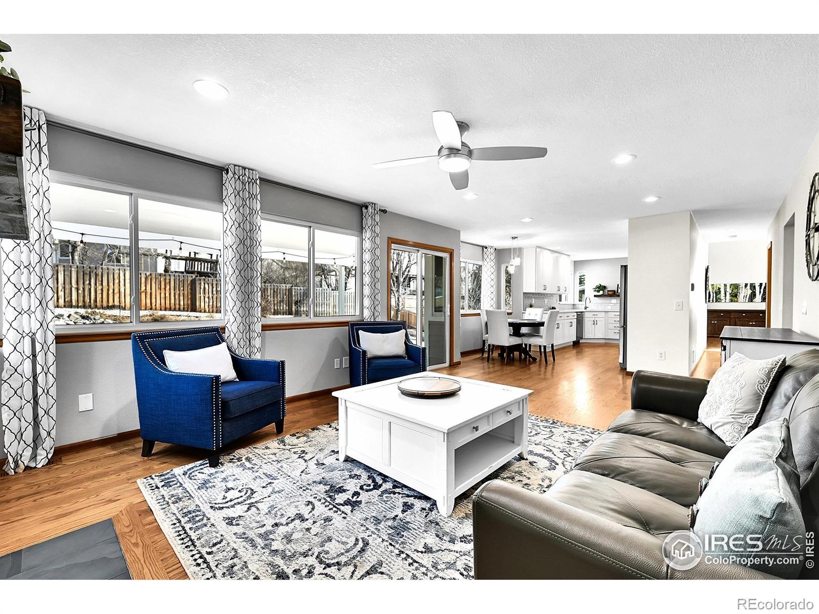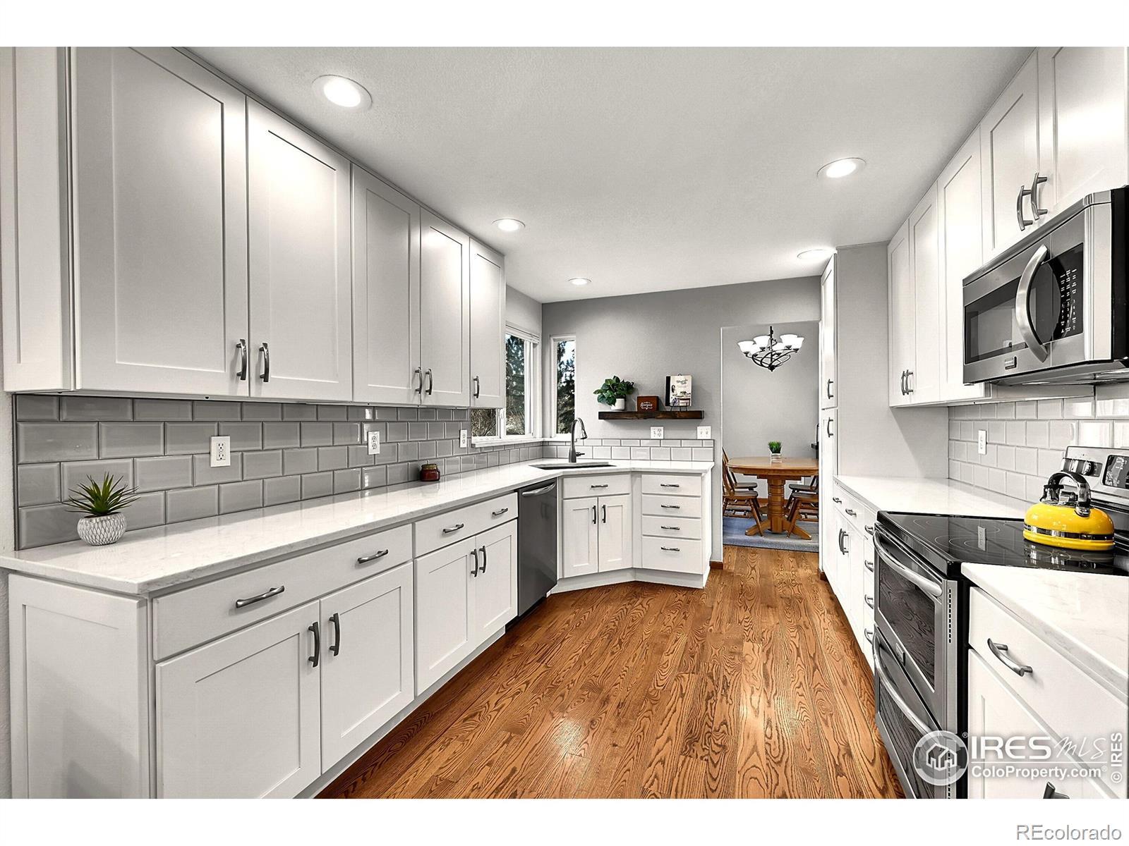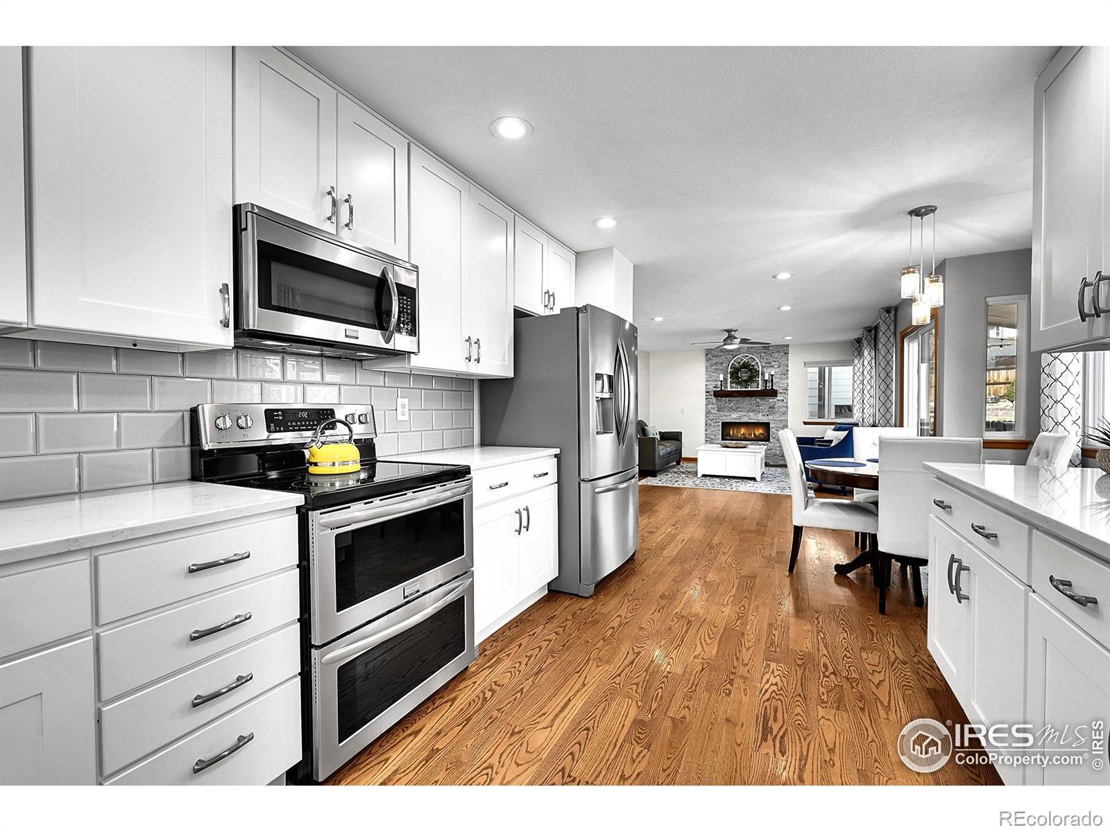 Simply gorgeous remodeled home in the highly sought-after Harvest Lane neighborhood of Arvada. Upon entering, you'll be greeted by a soaring foyer and beautiful natural hardwood floors throughout the main level. The renovated kitchen is the heart of this stunning home which connects the breakfast nook and family room seamlessly - ideal for both everyday living or hosting parties & holiday gatherings. The kitchen features quartz countertops, Frigidaire Gallery SS appliances, subway tile backsplash and custom soft-close cabinetry & drawers. In the remodeled family room you will find an upgraded gas fireplace with stacked stone surround and recessed ceiling lighting. The spacious primary suite boasts vaulted ceilings, mountain views and renovated 5pc bathroom with walk-in closet. There are 3 additional secondary bedrooms on the upper floor along with the remodeled secondary full bathroom. The finished basement features new carpet, rec room with built-in shelving and private guest suite with 3/4 bath & large walk-in closet. The back yard is an outdoor oasis with covered flagstone patio, soothing waterfall & pond and numerous plants, flowers & shrubs. 3 car oversized garage with bonus work shop area that has a work bench and elevated storage area. Unbelievable location that is walkable to Stanley Lake, the APEX recreation center, the Ralston Creek Trail, Double E Park, Leyden Creek Park and I-70 is only a 10 minute drive down Ward road - which provides easy access to Denver, downtown Golden, and the Rocky Mountains. New Basement Carpet (2026), New exterior paint (2024), New furnace & AC (2022), New water heater (2022), New Hardwood Floors, (2021) Updated Windows, Radon Mitigation, Class 4 Roof with 5 Year Certification, Main floor laundry, 3 Car Garage, tranquil back yard, remodeled kitchen & bathrooms, No HOA, Low taxes (no Metro District!), unbeatable location, quick possession possible - this home has it all. (Showings start Friday, 2/20)