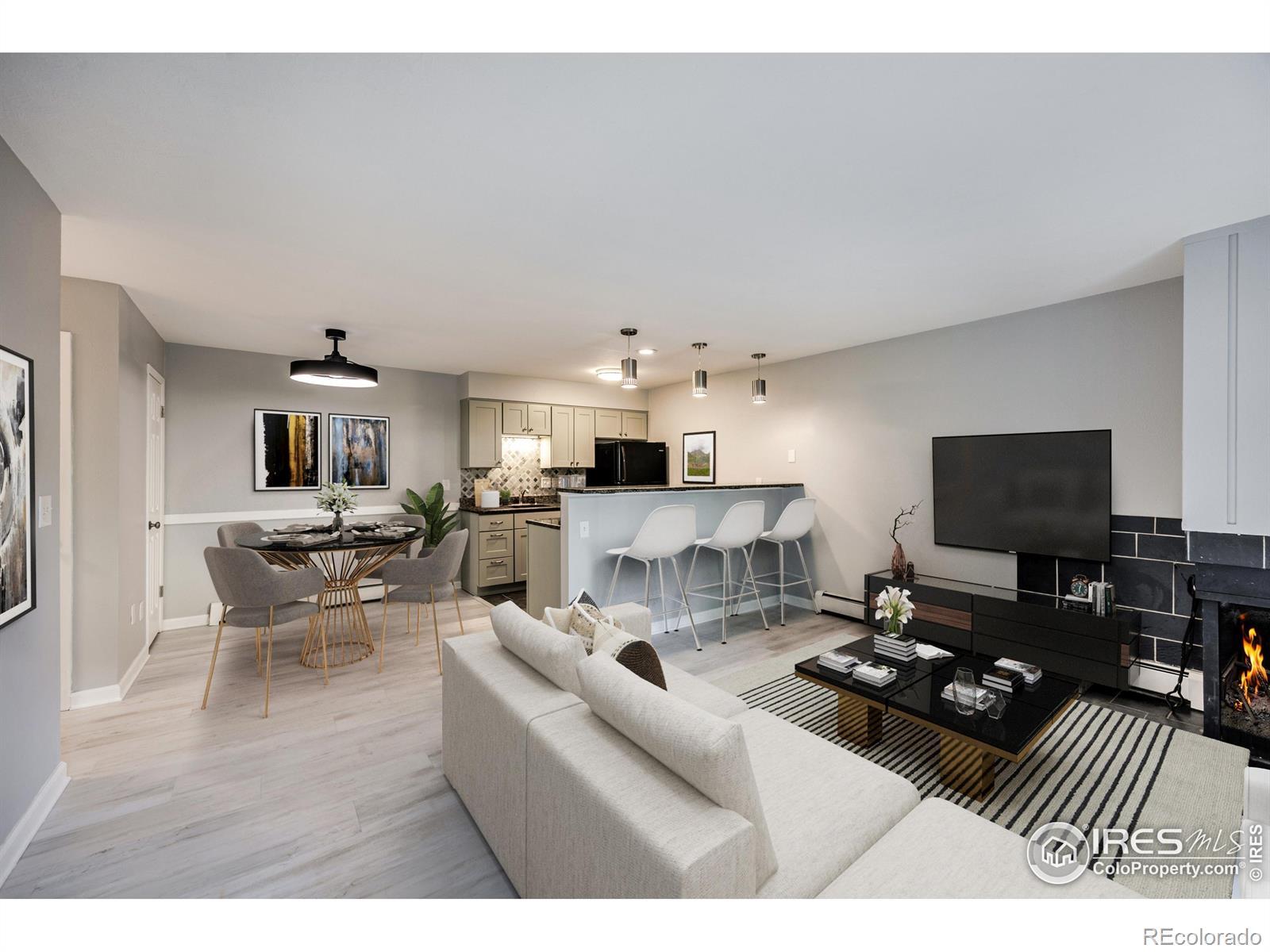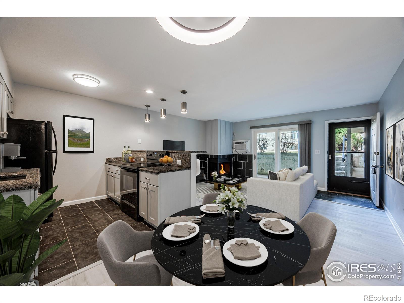 EXCELLENT OPPORTUNITY-COMPLETELY REMODELED! Some photos are virtually staged. Modern 7 bright ground-level condo in quiet location fronts to interior grassy area of the complex. NEW features include interior paint, luxury vinyl plank flooring, carpet, sliding door to patio, window coverings, light fixtures/ceiling fan, full-size stackable washer/dryer. Stylish open floor plan, beautifully remodeled kitchen w/ breakfast bar, full-size pantry, large dining area & spacious living room w/ cozy fireplace for Winter&A/C for Summer. Ready for move in or rental! Enjoy sunny patio, sparkling seasonal swimming pool & convenient location - bus stop & bike paths are next to complex. CU is a short bus or bike ride away. EZ commute to shopping/restaurants 3 blocks away. 2 parking permits included- plenty of visitor parking. Well-priced-quick close available.