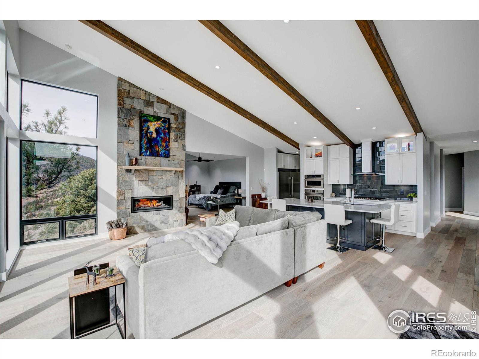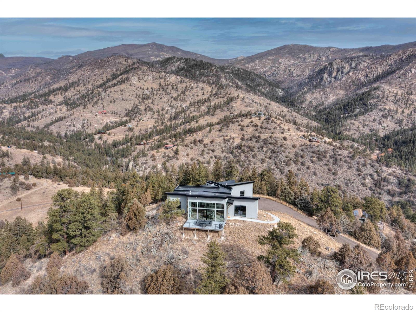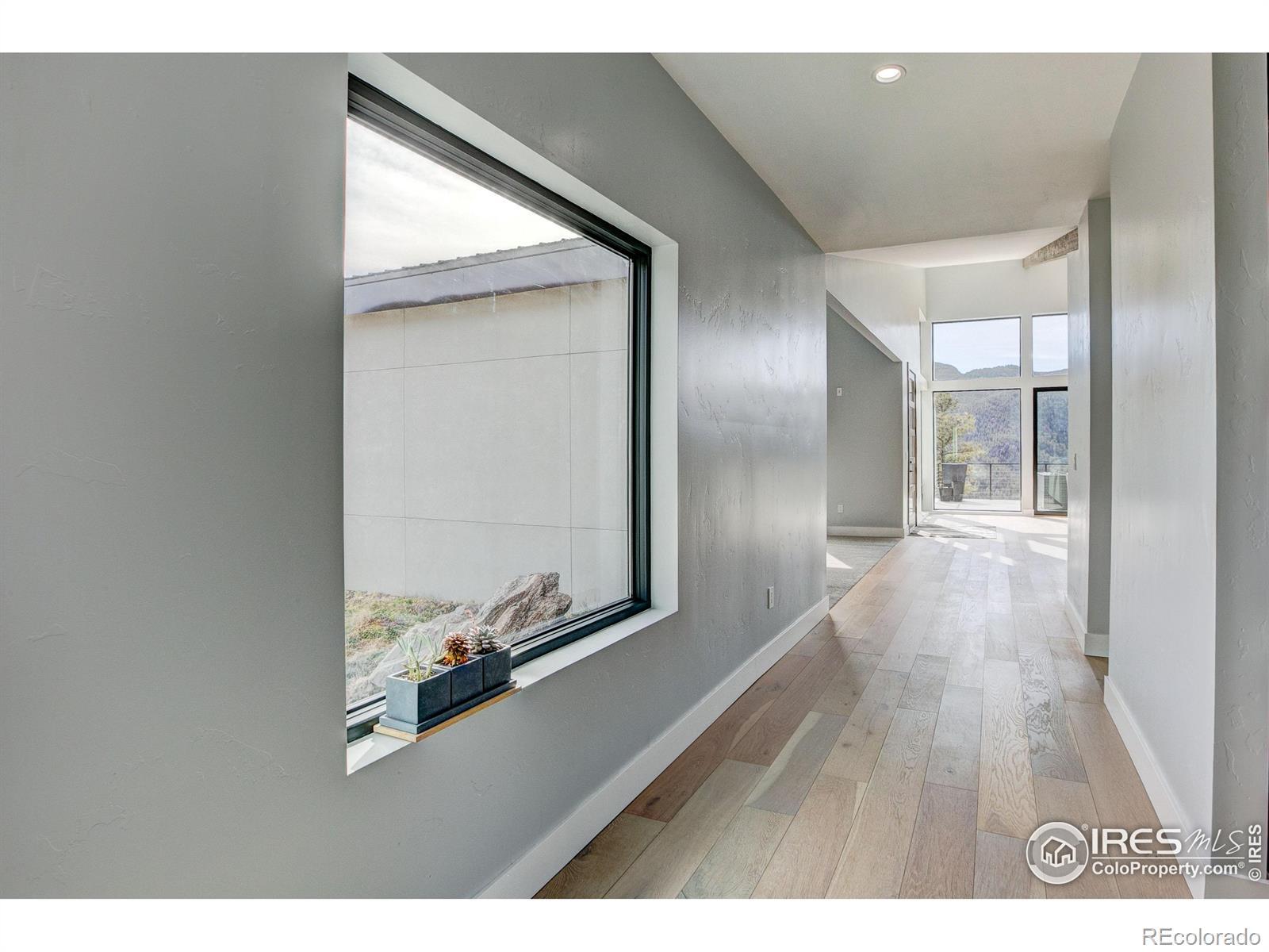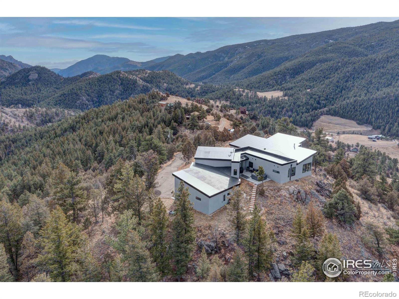 Modern Mountain Masterpiece 1068 Elkridge Drive. Perched on a private 6-acre lot in Glen Haven, this exceptional contemporary retreat offers a rare blend of luxury, sustainability, and breathtaking natural beauty. Designed to frame panoramic views of Longs Peak and Rocky Mountain National Park, this architectural gem is a true sanctuary in the mountains. Step inside to a light-filled open floor plan featuring soaring 16-foot ceilings with rustic wood beams and elegant White Oak hardwood floors. Expansive south-facing windows maximize passive solar efficiency, providing natural warmth in winter and cool comfort in summer. Floor-to-ceiling Pella windows showcase 360 sweeping views of rugged rock outcroppings, ancient pines, and surrounding peaks. Outdoor living is equally impressive with a spacious front deck, private rear patio with spa, and a balcony off the guest suite-perfect for relaxation and entertaining. The chef's kitchen offers luxury cabinetry, quartz countertops, premium appliances, and a large butler's pantry. The primary suite includes a generous walk-in closet with custom built-ins, while spa-inspired bathrooms feature custom tile and high-end fixtures. A dedicated laundry room with built-in workspace and energy-efficient LED lighting enhance everyday living. Superior mechanical systems include a 5-zone radiant heating system and tankless water heater. The impressive 4-car heated garage features an RV-height door, workshop space, and abundant attic storage. Additional highlights include a paved parking pad, advanced water treatment system, exterior stucco finish and low-maintenance natural landscaping. Located minutes from Roosevelt National Forest and Rocky Mountain National Park trailheads, this remarkable property offers unmatched access to Colorado's wilderness while delivering modern luxury and comfort. Situated in the quiet community of Glen Haven Colorado, 15 minutes from Estes Park and Rocky Mountain National Park